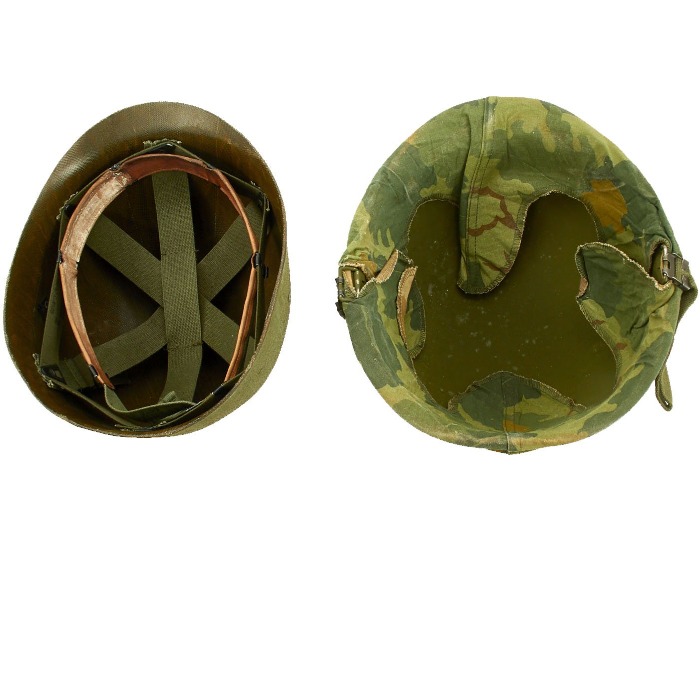 This helmet is a fine example and still retains all of its original Vietnam War parts and the shell has the original OD Green finish on the interior and exterior of the helmet. The helmet's heat lot code is visible, which appears to be 1 1815, definitely well past WWII and Korean war codes. It still has the correct complete chin strap, secured behind the helmet as was often done.