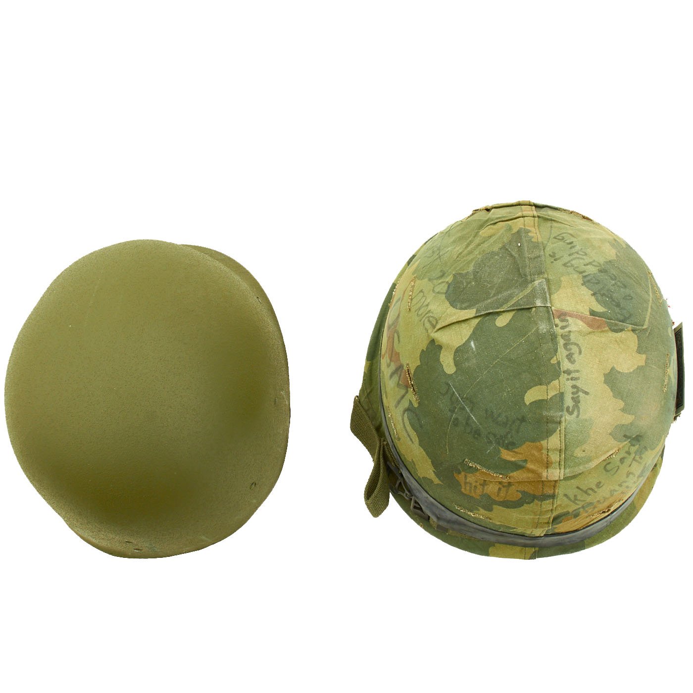 These include: "USMC", "GOD country the corp," Best ding is a dead ding", "Just 20 more", "Just wait to be safe", "hit it", "Khe Sanh Quang Ti Hue", and "Say it again". There is also a peace symbol on the front of the helmet. The writing is quite faded, so it was not added any time recently. We believe it to be original period.