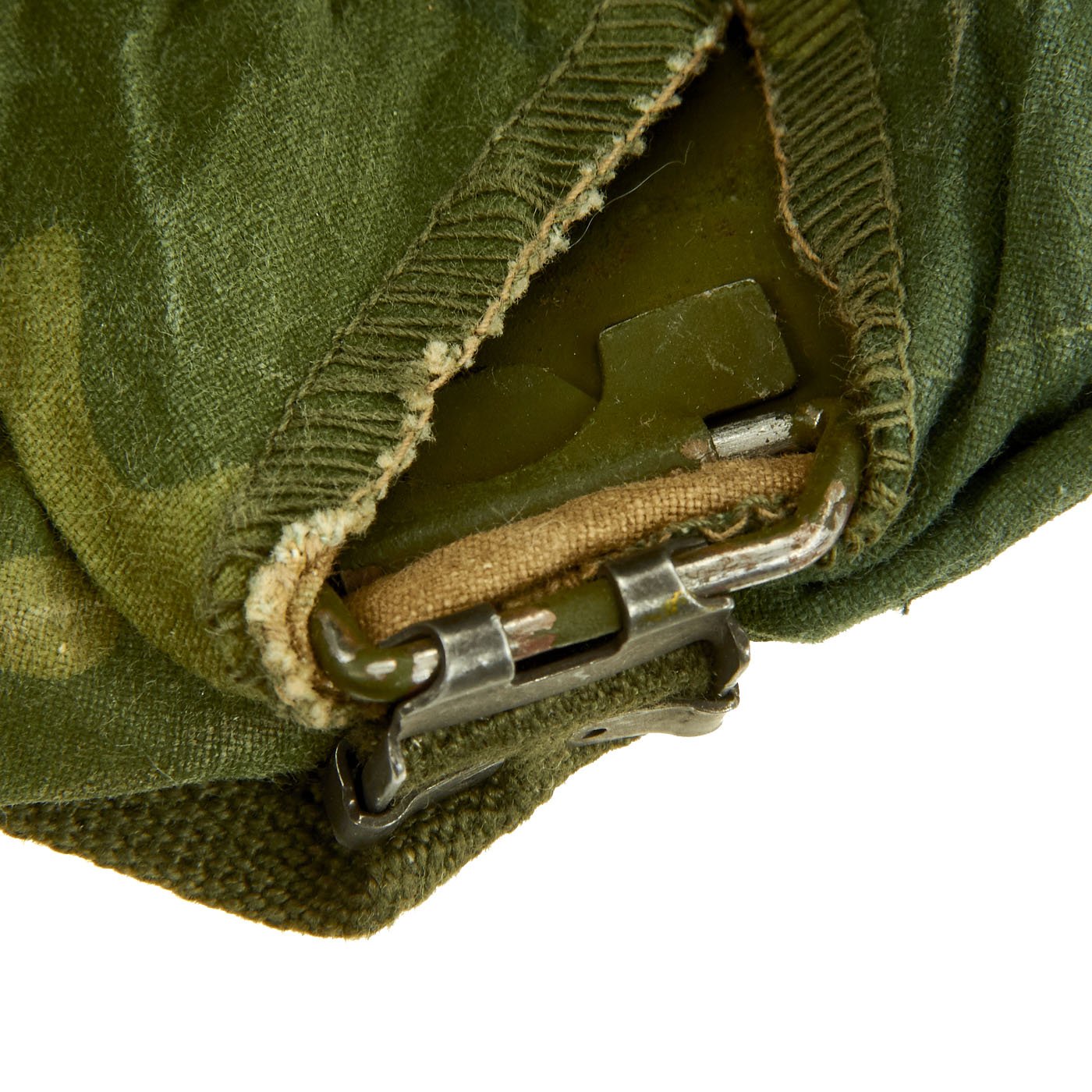 The shell chin strap is original, and the USMC cover is original and in very good condition. It has some stains and dirt, as well as wear around the edge, but is definitely solid. It is marked on the underside of one of the flaps with the contract information: