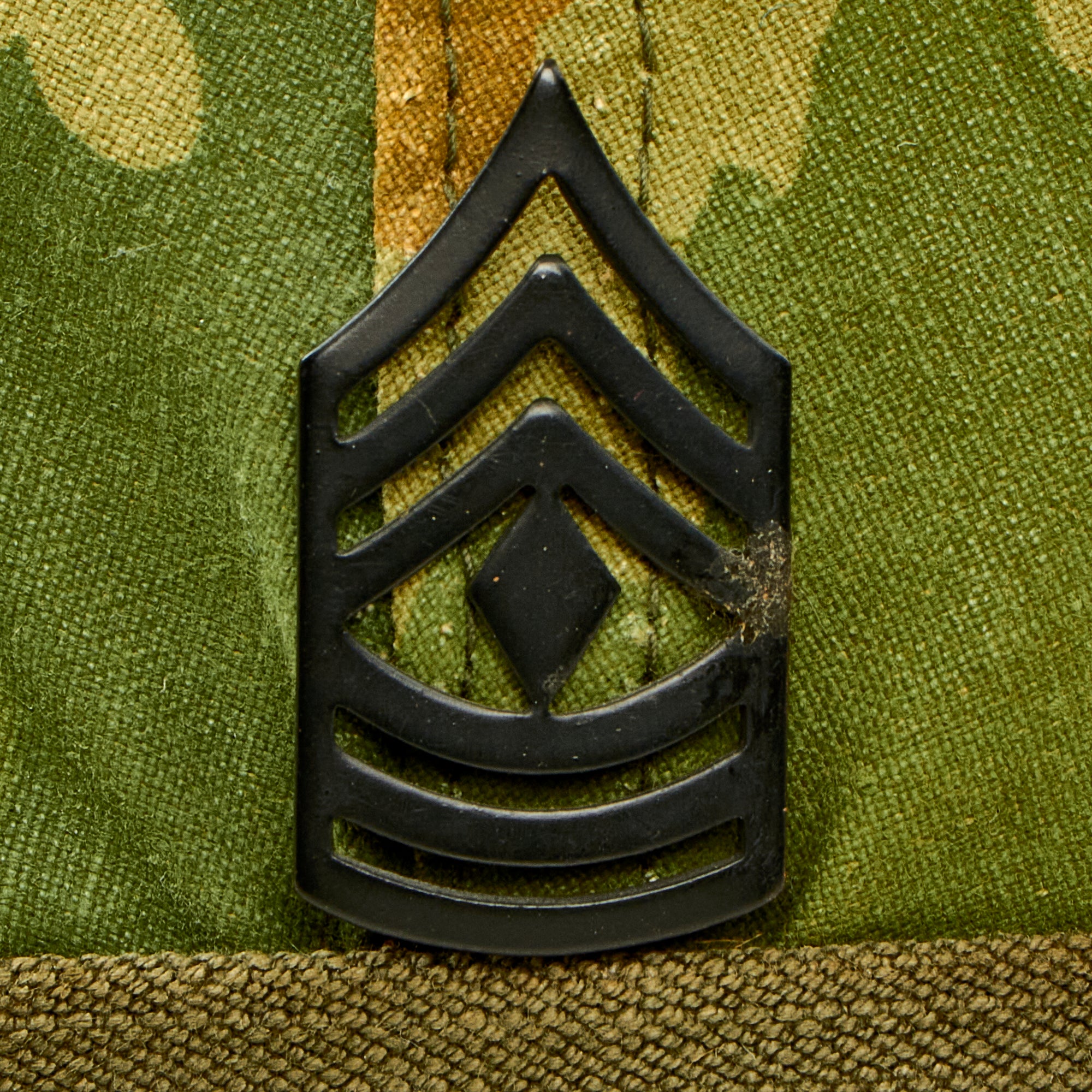 It is equipped with a standard Reversible Camouflage cover, which has a contract date code for 1974. It is held in place by the elastic band that retains the cover.