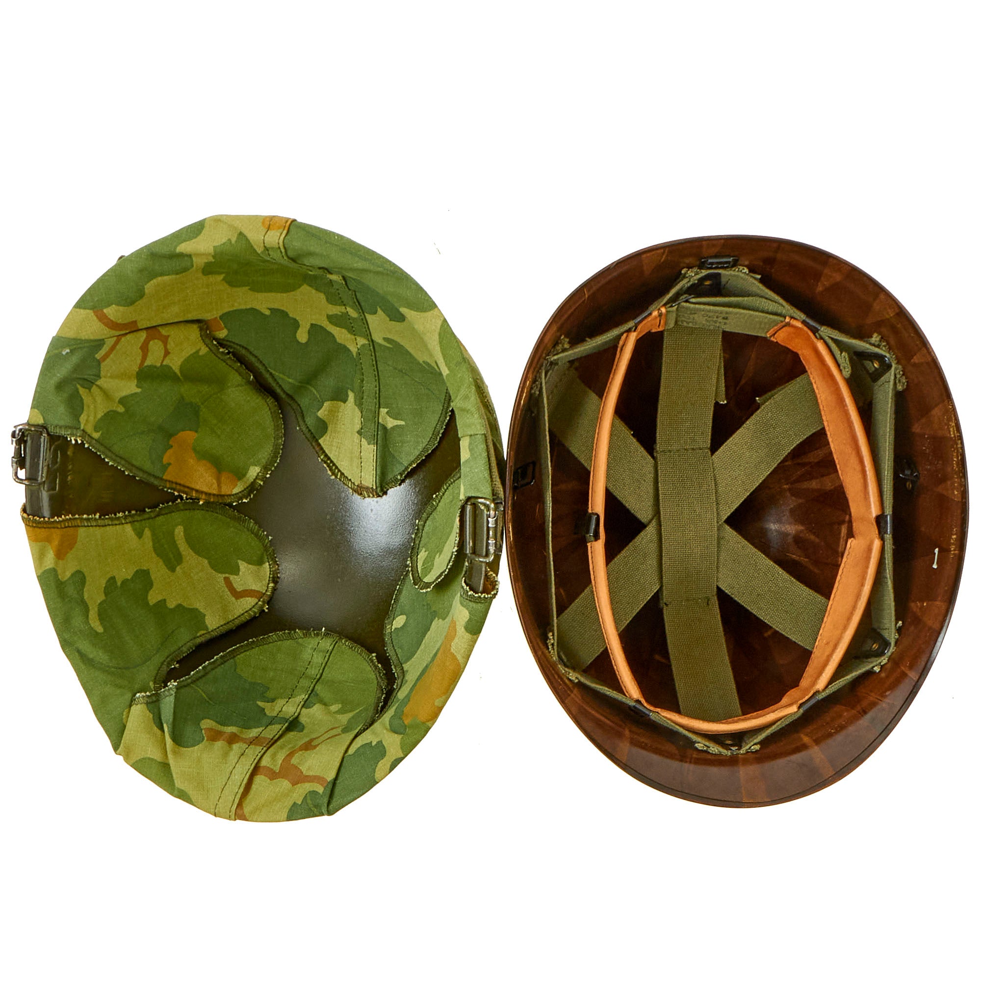The helmet, cover, shell, and liner are all correct for a Vietnam war helmet. The helmet comes complete with high pressure Vietnam War era liner, which is embossed with 107 inside the crown, along with some mold ID numbers. The liner does not have a frontal eyelet, indicating that it is a post Korean war manufacture. A new suspension system for the M1 Helmet Liner was introduced in 1964. The new system featured three webbing straps that could each be adjusted to hold the liner at the right height on the head. The liner also had a new neck band assembly, which consisted of a rectangular webbed body with three straps that attached to small buckles inside the liner. The P64 Infantry liner was also the first version not to have a leather chin strap.