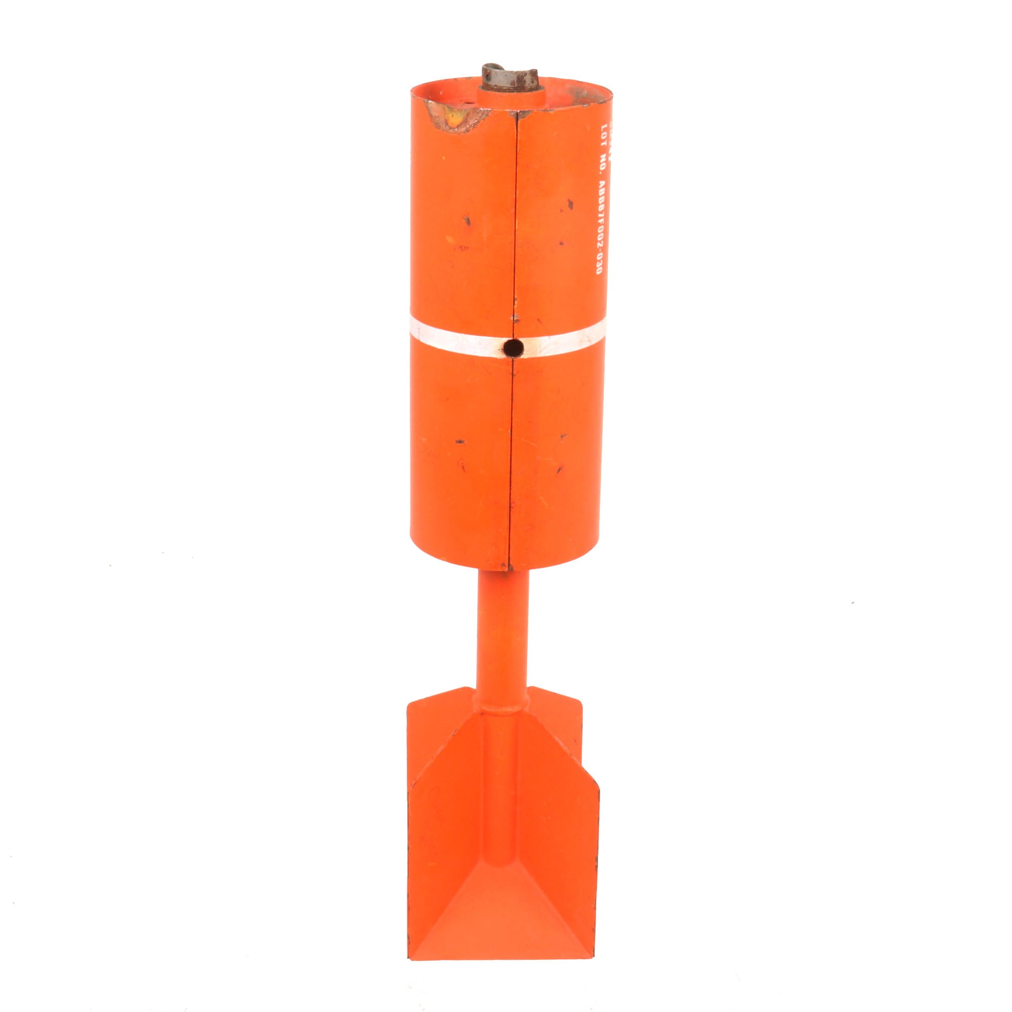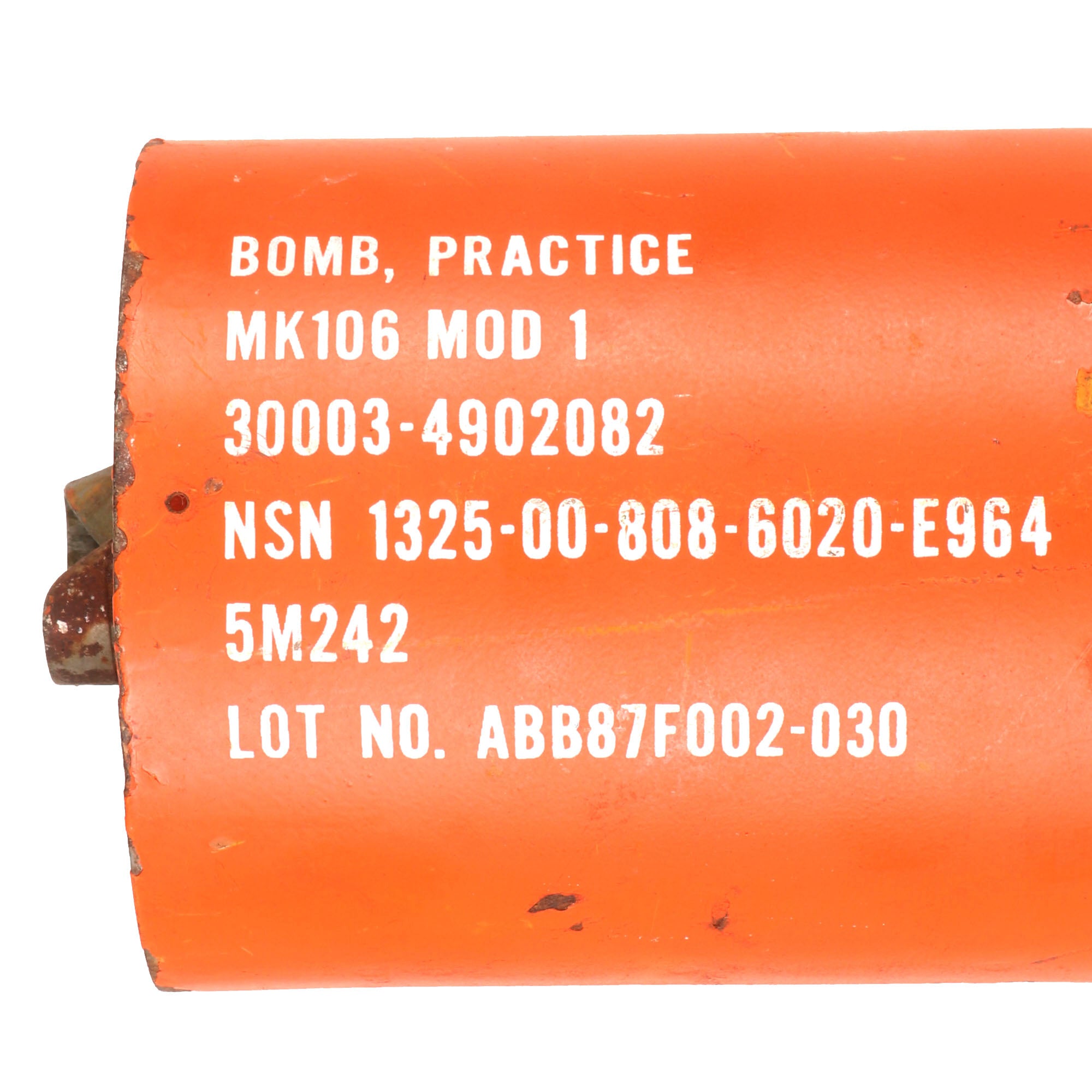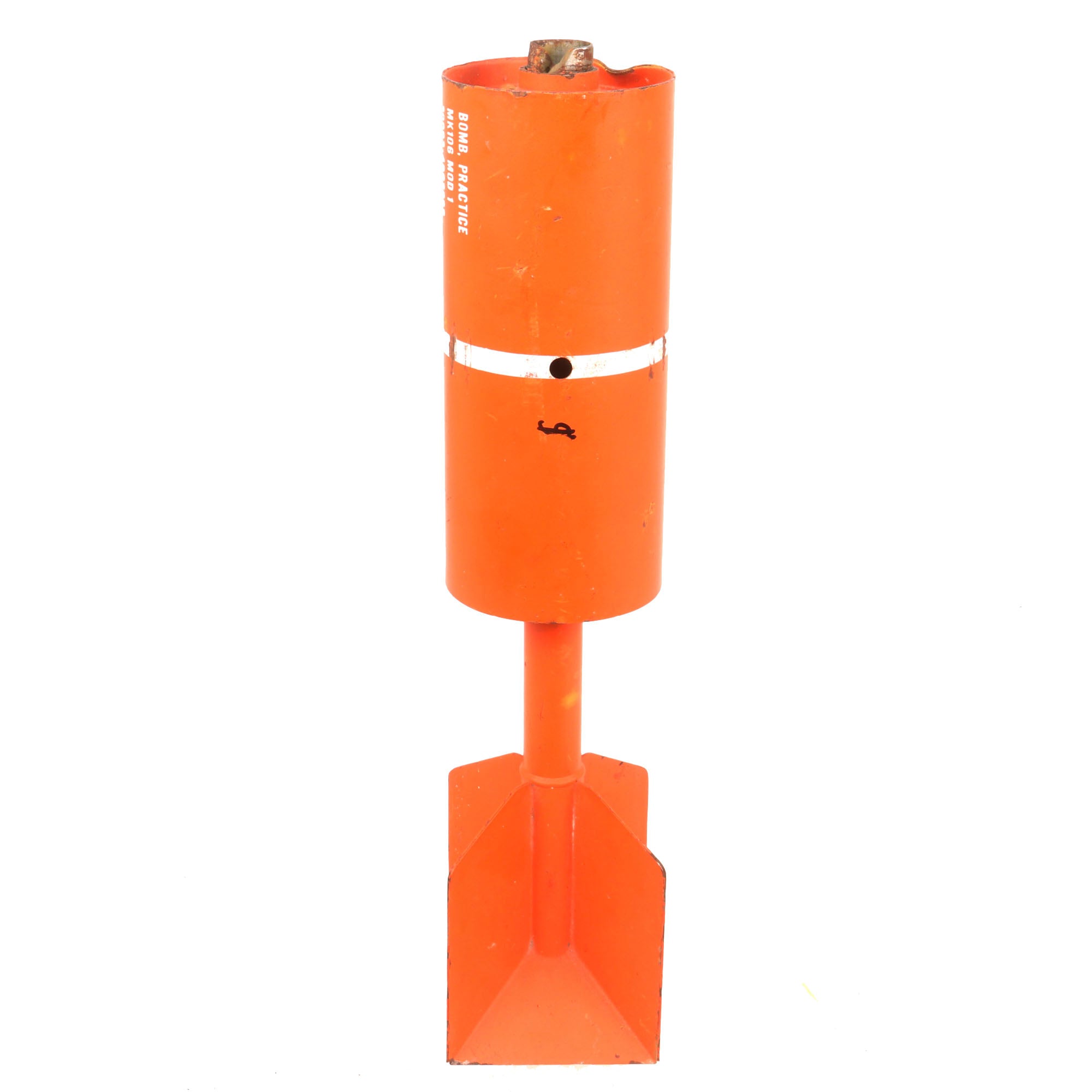The Mk 106 is a 2.27 kilogram practice bomb used for training purposes as a low-cost low-risk alternative to live munitions. The MK-106 is used to simulate the MK 82 in high drag configuration. Practice bomb Mk 106 Mod 4 is a thin cased, cylindrical bomb. It is composed of a bomb body assembly, a practice bomb signal Mk 4 Mod 3, and a modified fuze assembly M173 (not included). The tip of this example has been heavily beaten and the threads are unusable now, and nothing could be screwed onto it.