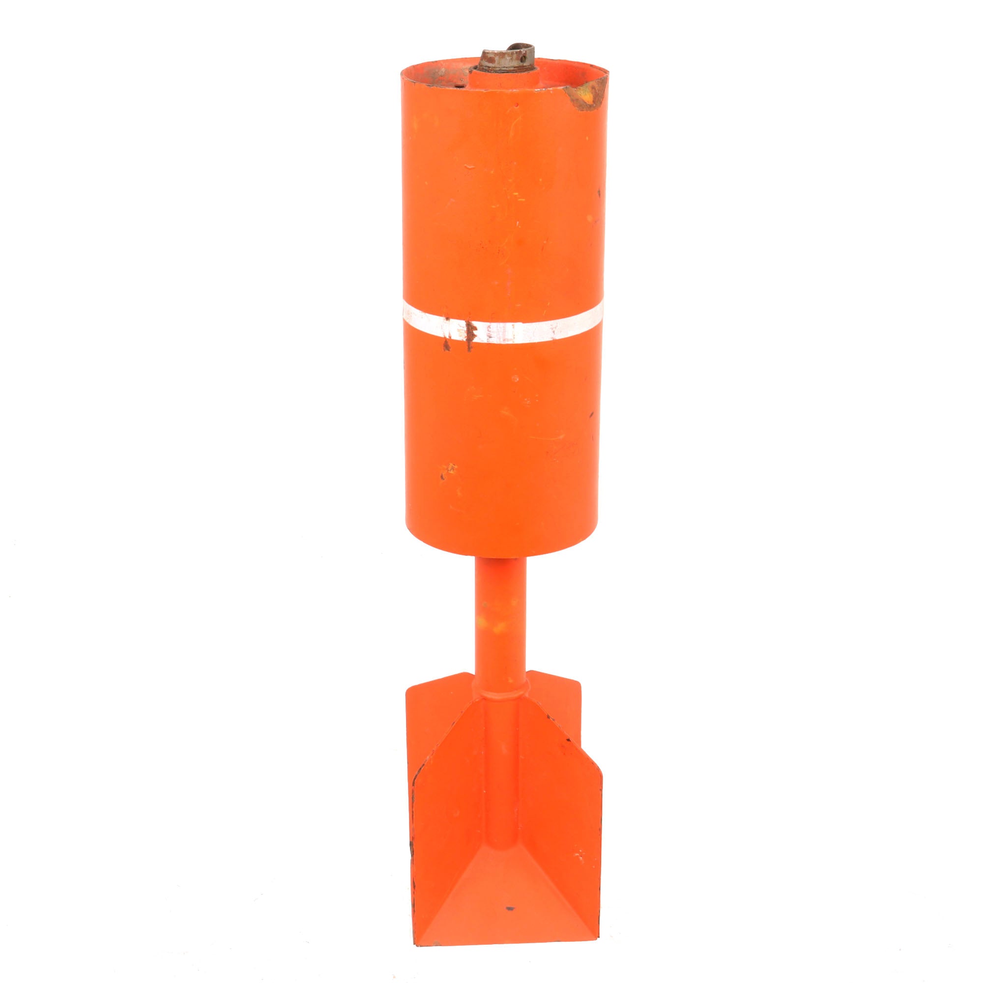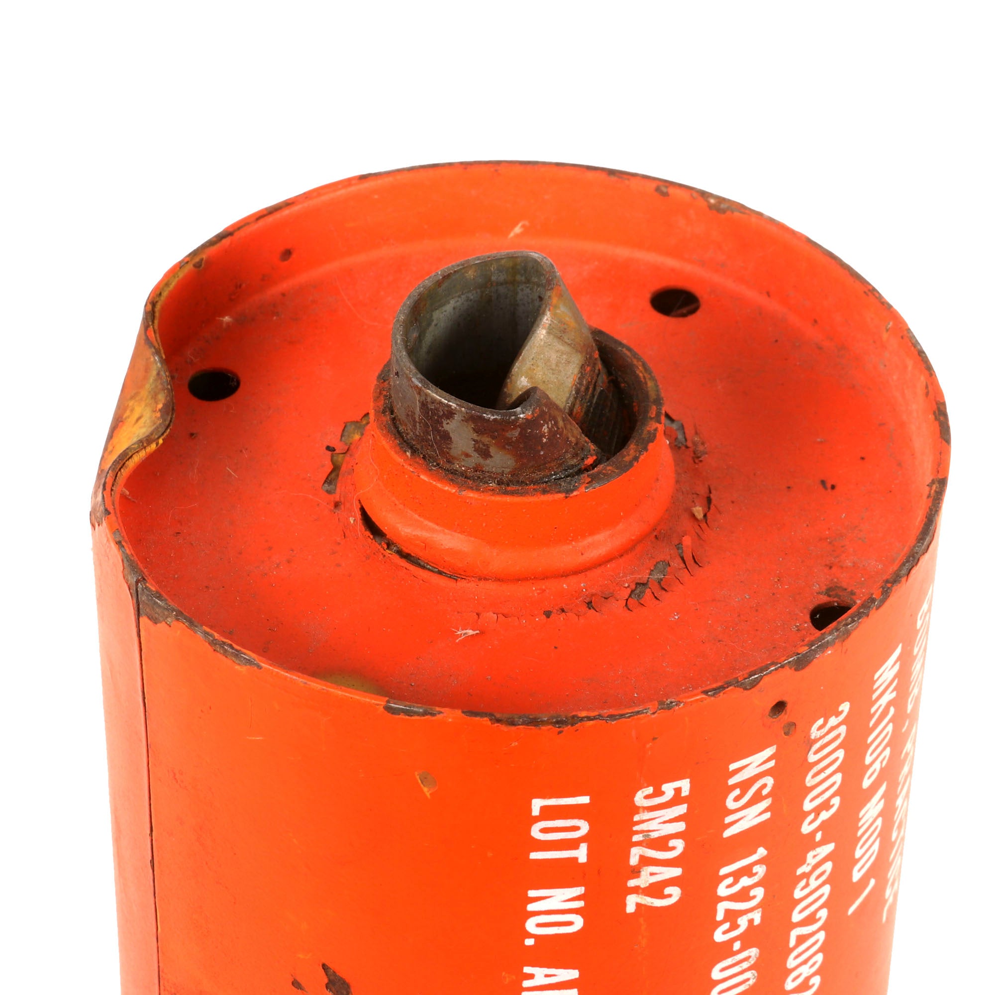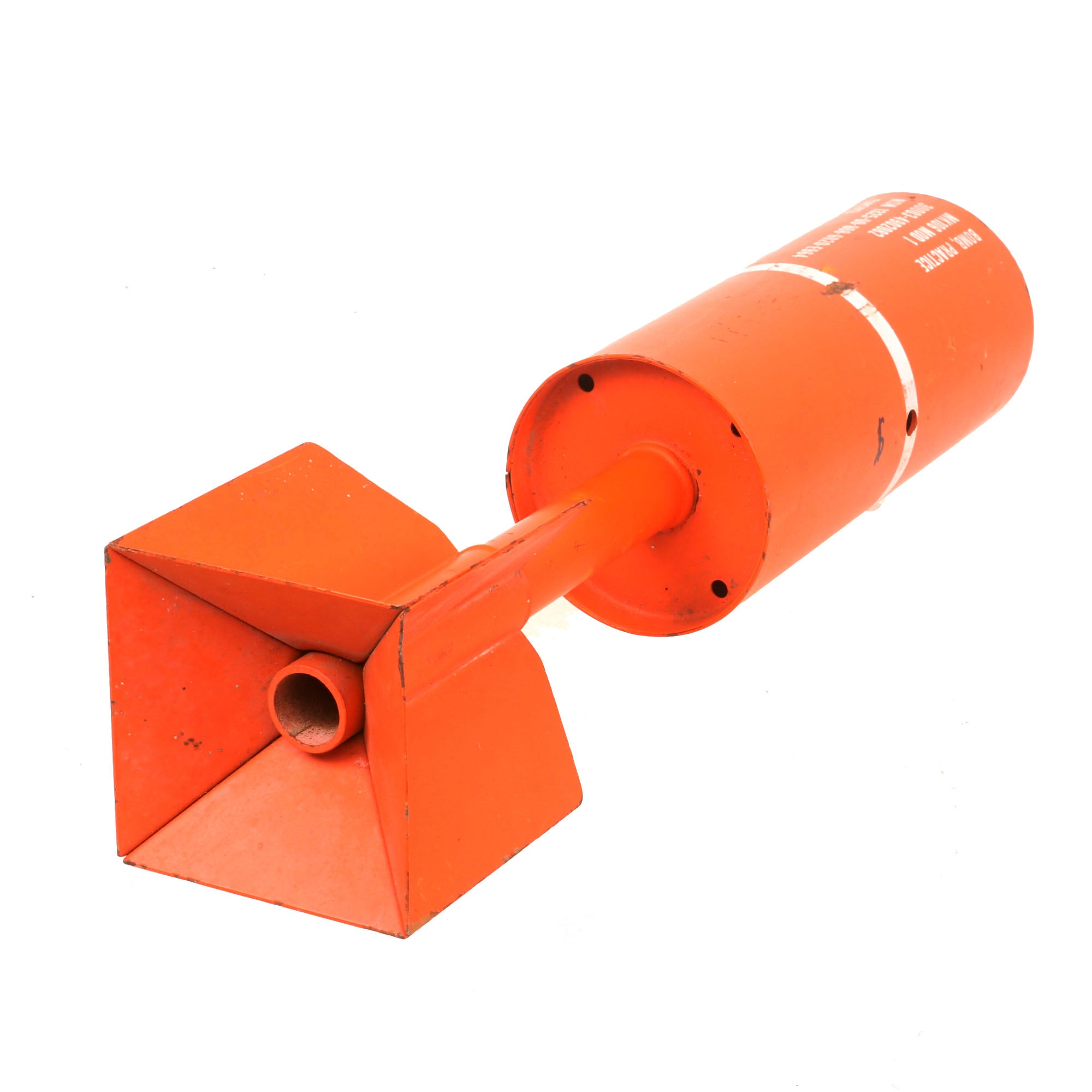 The Mk 106 is a 2.27 kilogram practice bomb used for training purposes as a low-cost low-risk alternative to live munitions. The MK-106 is used to simulate the MK 82 in high drag configuration. Practice bomb Mk 106 Mod 4 is a thin cased, cylindrical bomb. It is composed of a bomb body assembly, a practice bomb signal Mk 4 Mod 3, and a modified fuze assembly M173 (not included). The tip of this example has been heavily beaten and the threads are unusable now, and nothing could be screwed onto it.