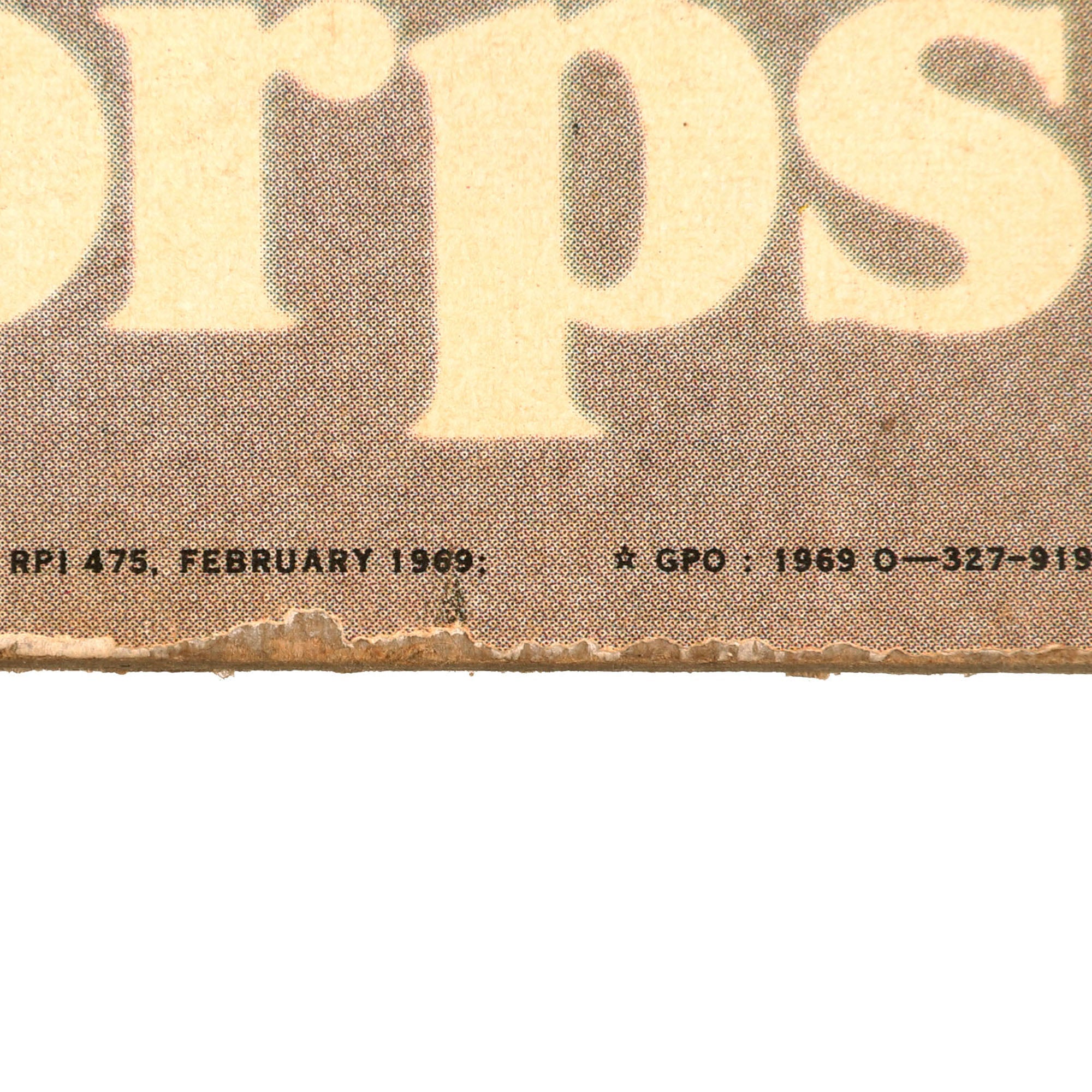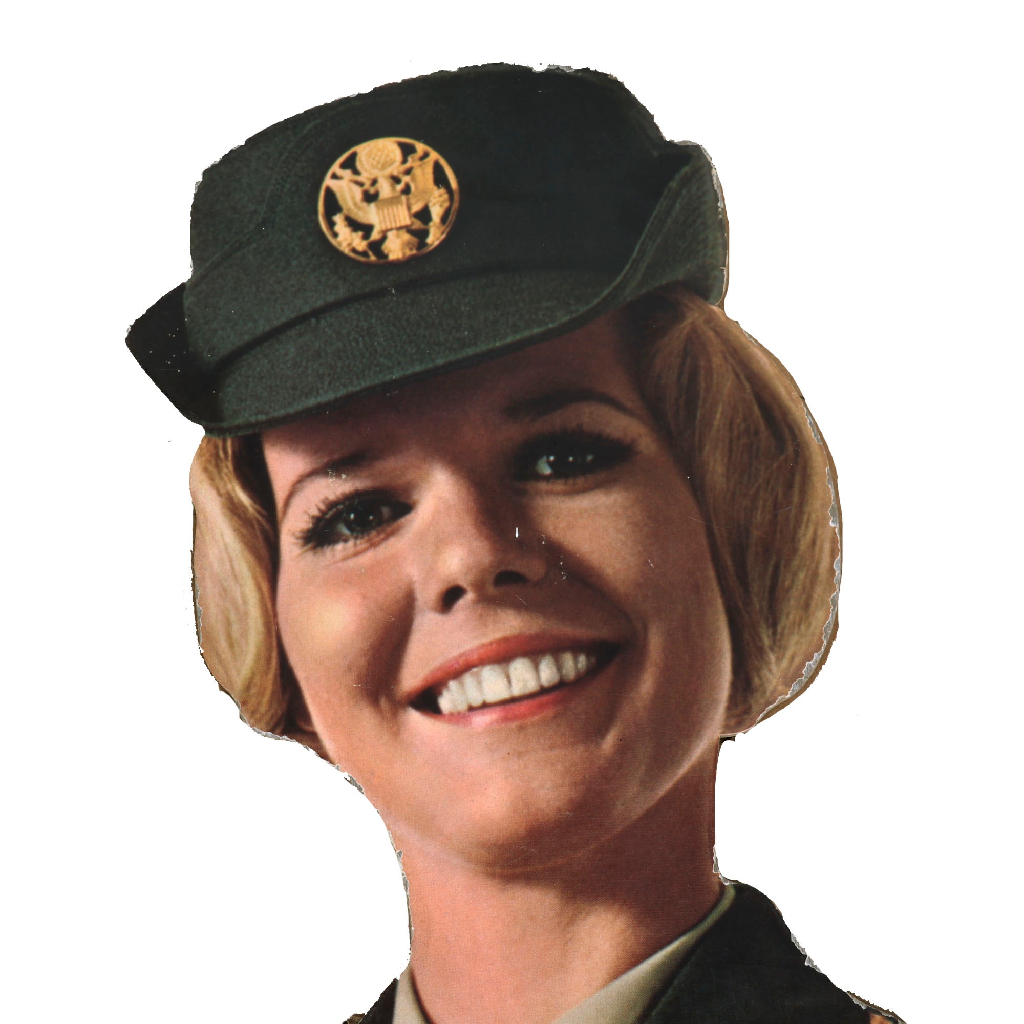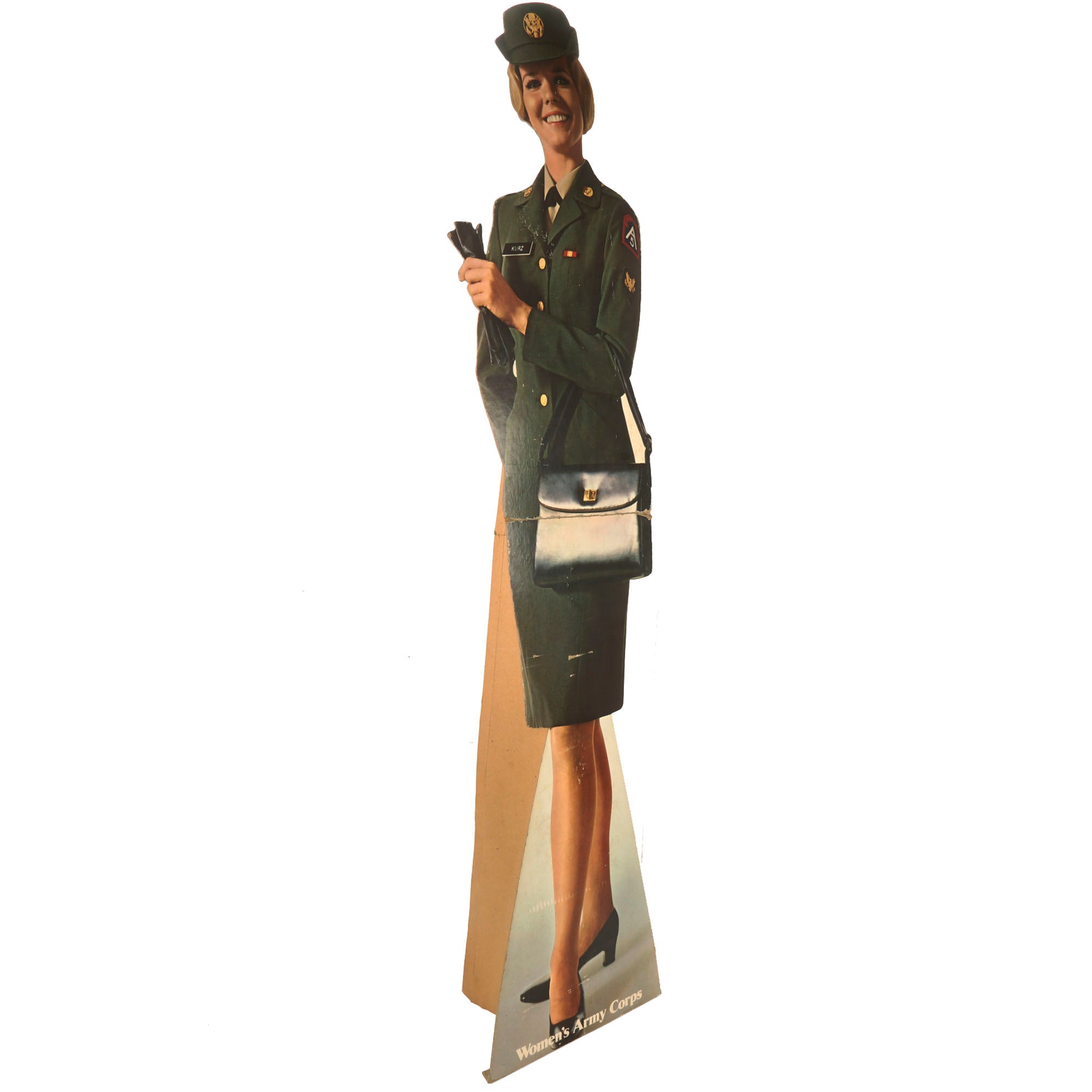 Original Item: Only One Available. This is a lovely 1969 dated Vietnam War Era U.S. Women's Army Corps cardboard recruiting standy, showing a member of the WAC from the U.S. 5th Army in uniform. The bottom of the standee reads Women's Army Corps, and it definite tries to convey both the subject "KURZ"'s womanliness, as well as her fitness for duty in the military. The WAC had historically been the target of horrible slander campaigns, to the point where many WWII Veteran's wouldn't mention their service to avoid rumors.