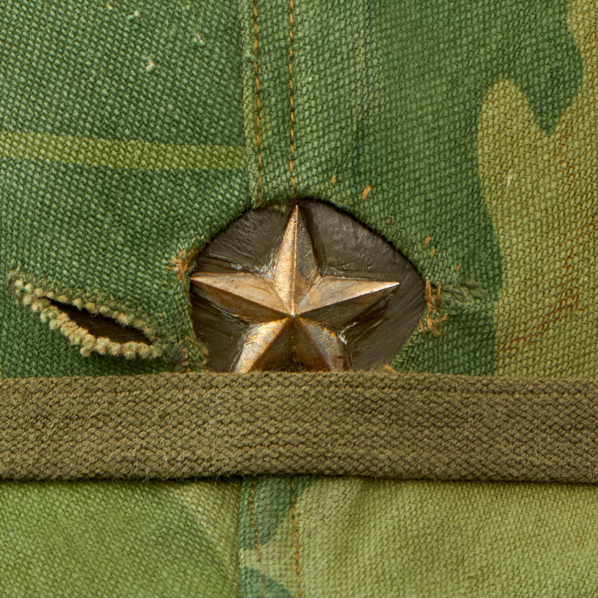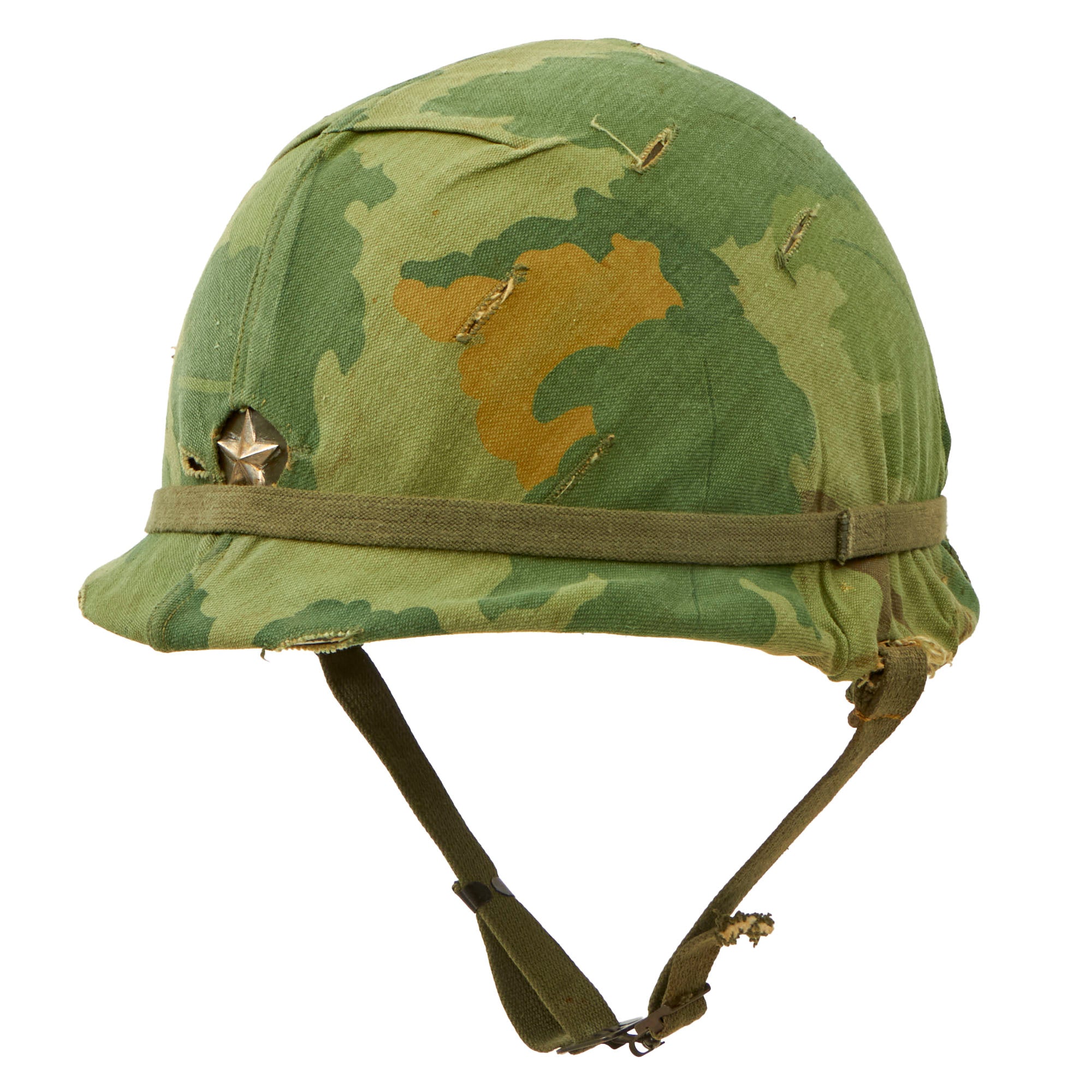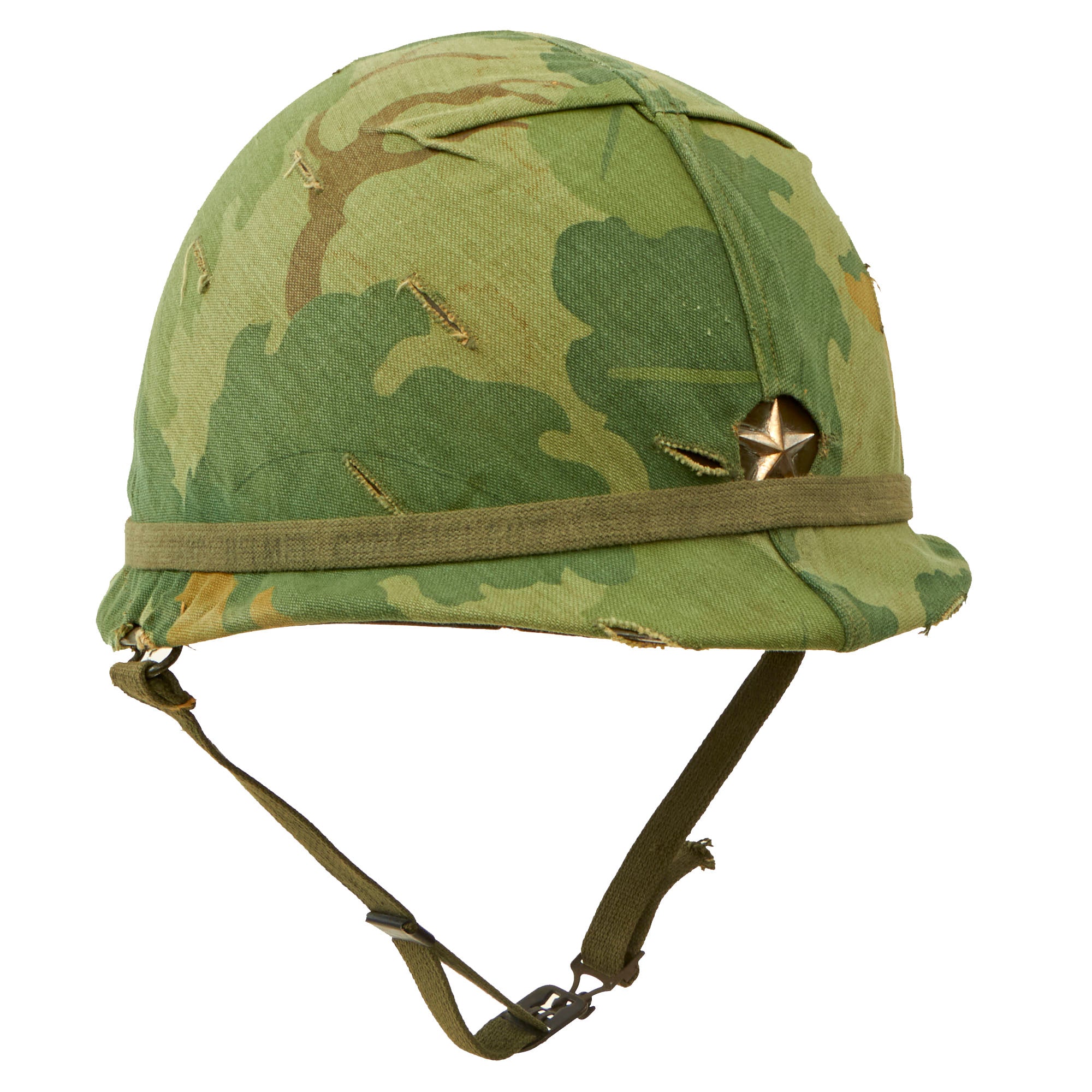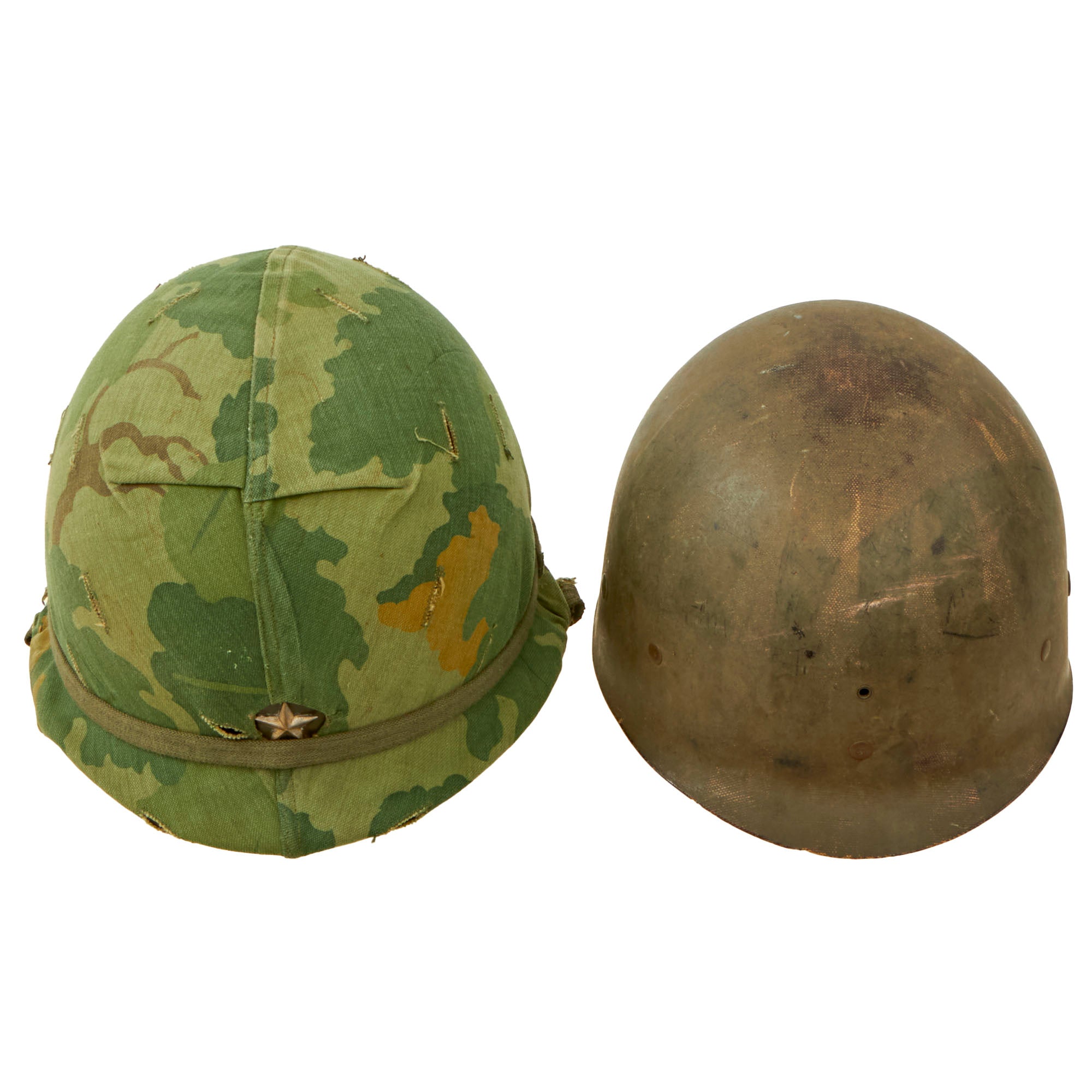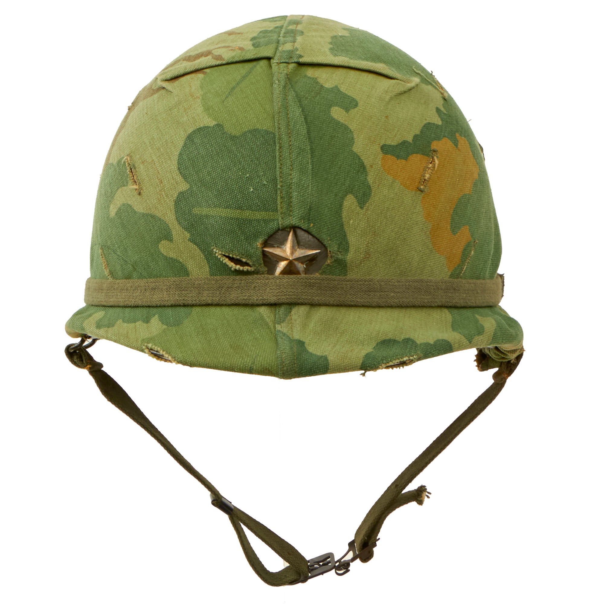 This helmet is a fine WWII-manufactured and Vietnam War-issued example which appears to have been worn by a Brigadier General who attached a metal star to the front and removed some of the cover to display the star.