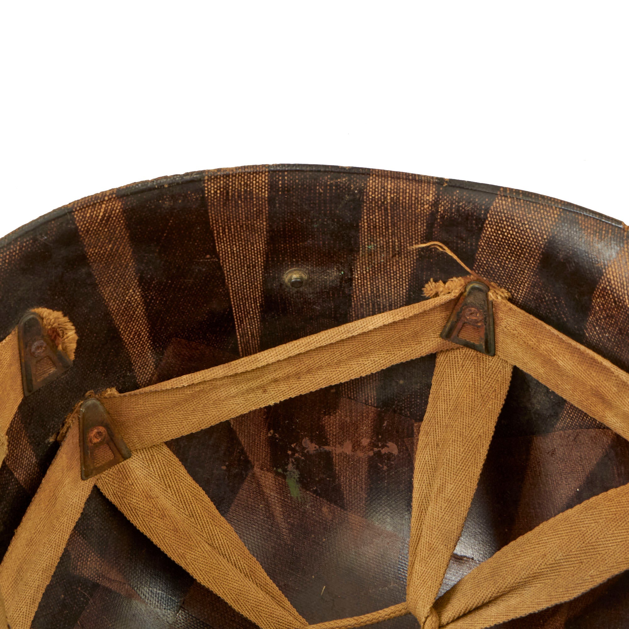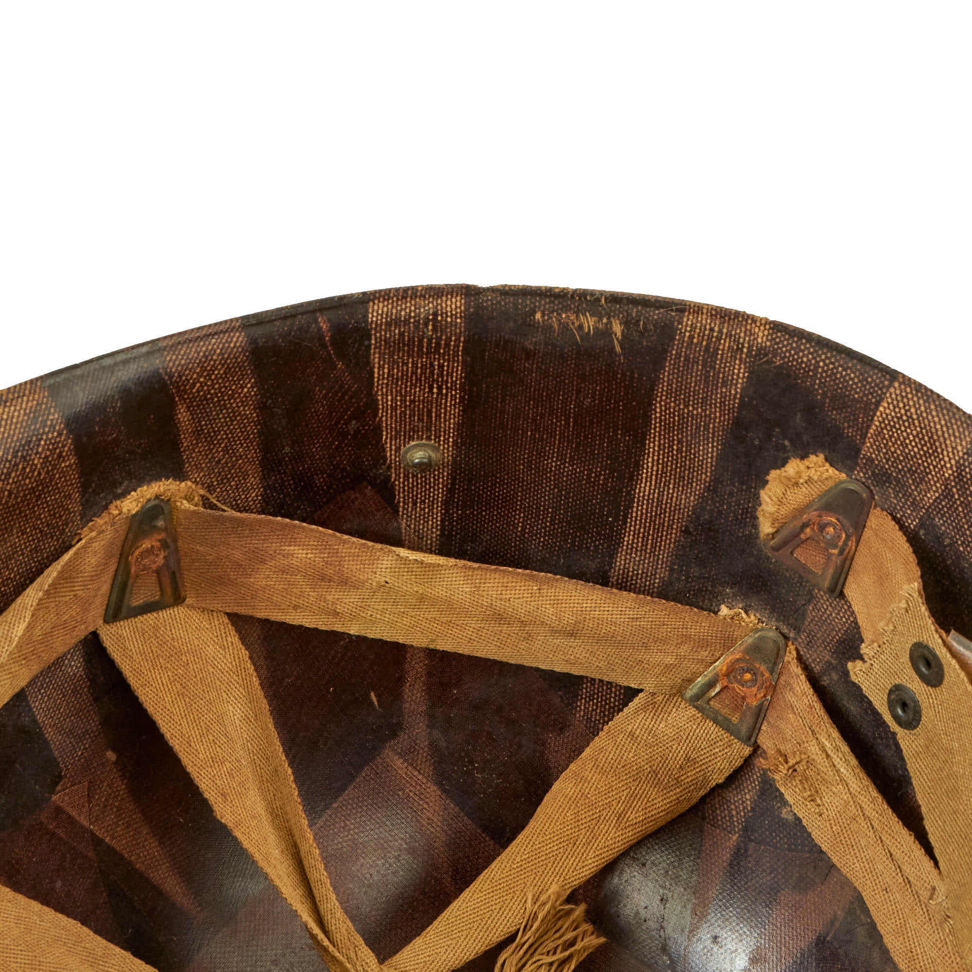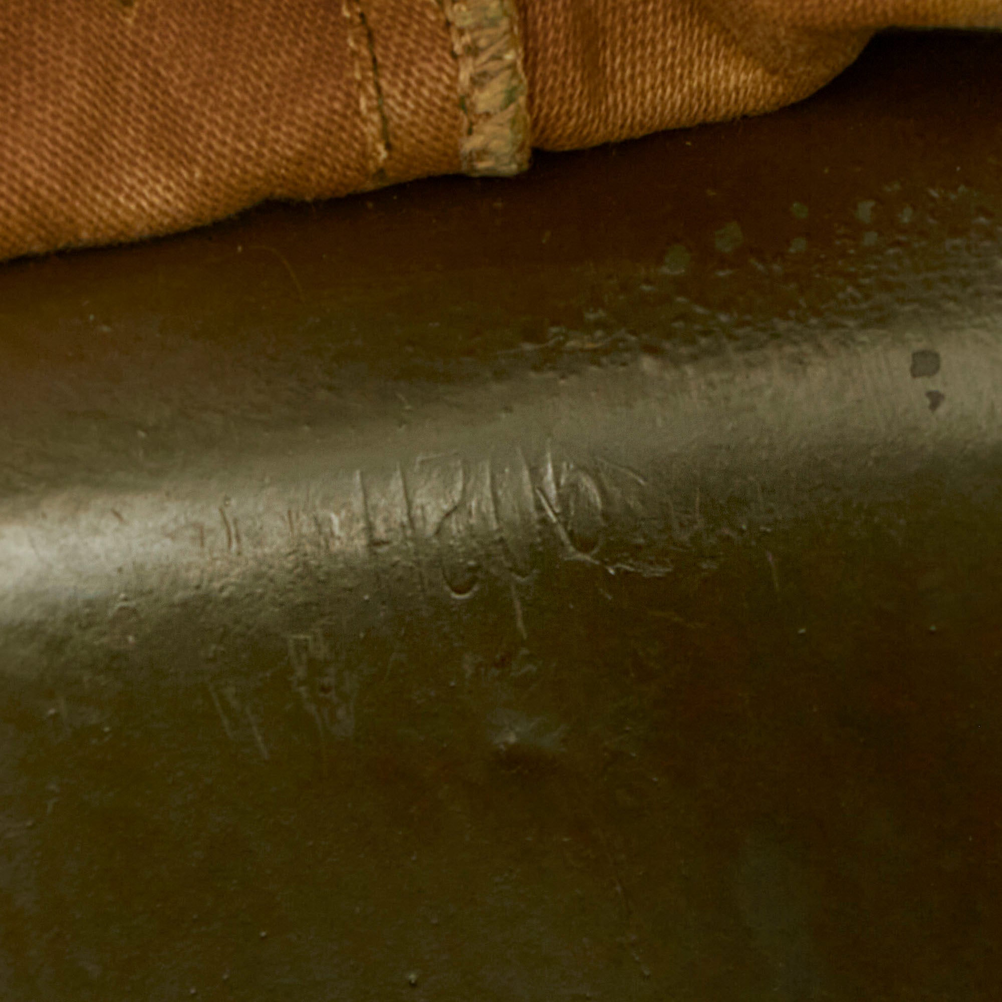 This true, lovely service-worn US WWII M-1 helmet liner can be identified through the frontal eyelet hole. Other correct WW2 features include cotton herringbone twill (HBT) OD Green #3 cloth suspension. This HBT suspension is held tightly within the M-1 helmet liner by rivets and a series of triangular "A" washers. The three upper suspension bands are joined together with a correct string. This way the wearer could adjust the fit. The sweatband and chinstrap are entirely absent on this example.