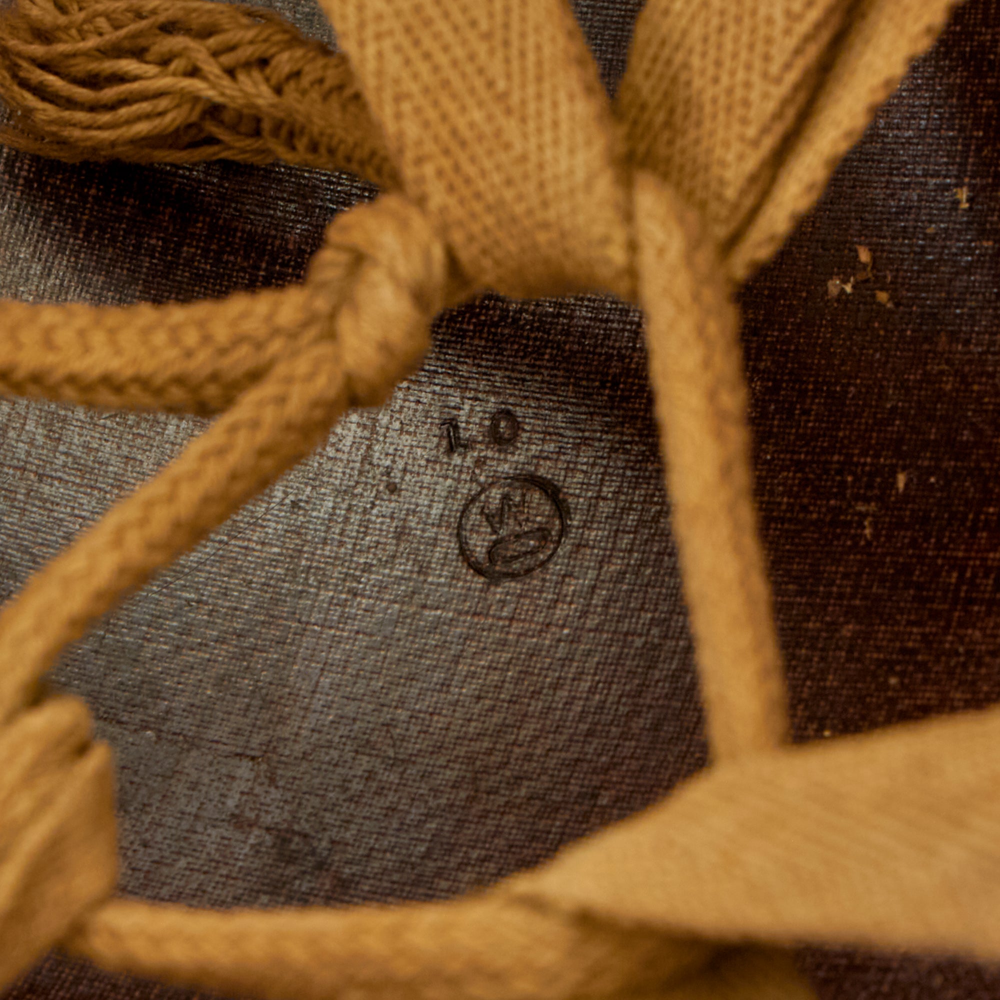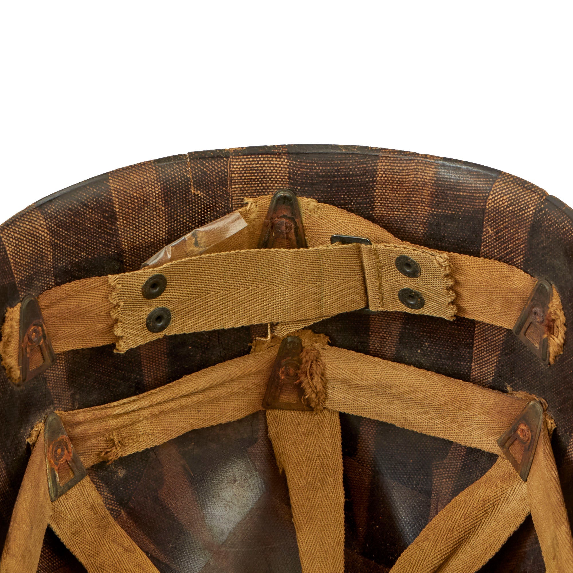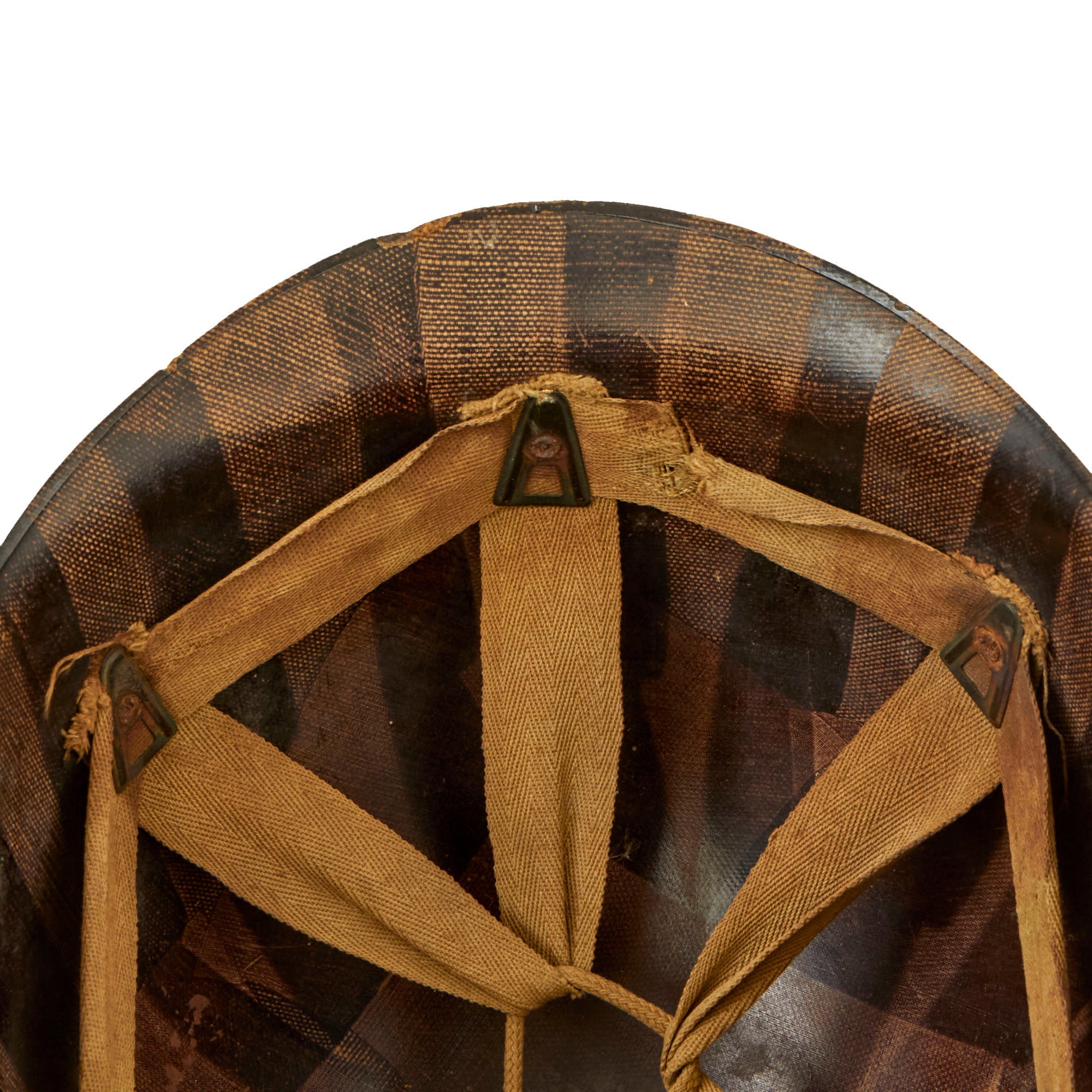 This true, lovely service-worn US WWII M-1 helmet liner can be identified through the frontal eyelet hole. Other correct WW2 features include cotton herringbone twill (HBT) OD Green #3 cloth suspension. This HBT suspension is held tightly within the M-1 helmet liner by rivets and a series of triangular "A" washers. The three upper suspension bands are joined together with a correct string. This way the wearer could adjust the fit. The sweatband and chinstrap are entirely absent on this example.