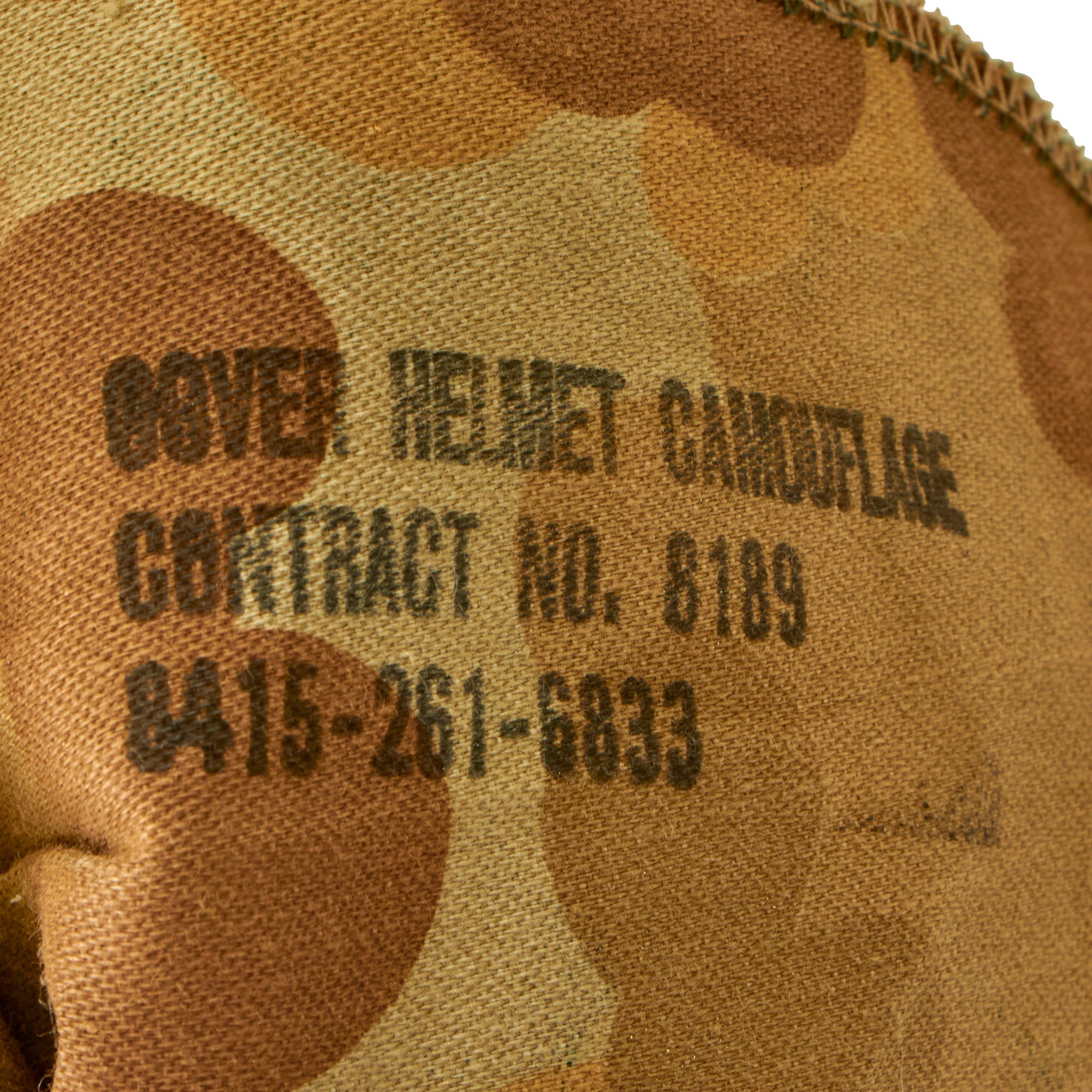 It is equipped with a standard Reversible Camouflage cover, which is marked on the other side but not dated. It is held in place by the elastic band that retains the cover. There is a bit of material to the front removed for display of the Brigadier General’s star.