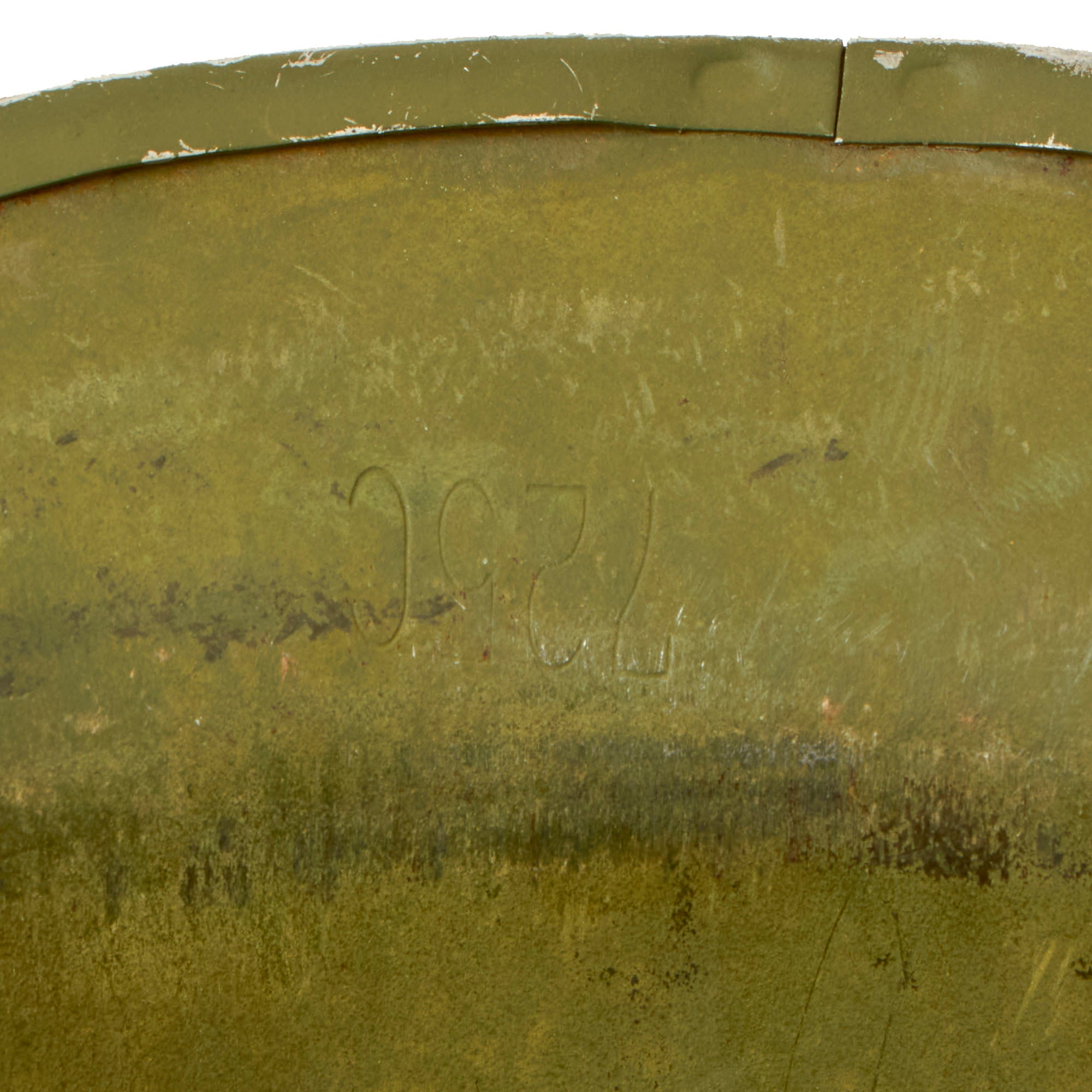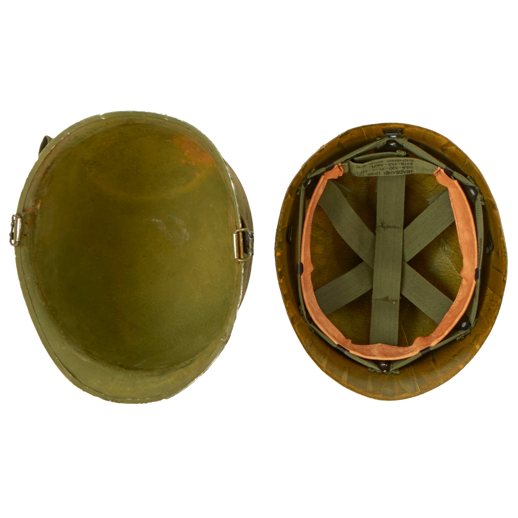 This helmet is a fine Vietnam War WWII reissued example and still retains most of its original period parts, and the shell has the original textured Green finish.