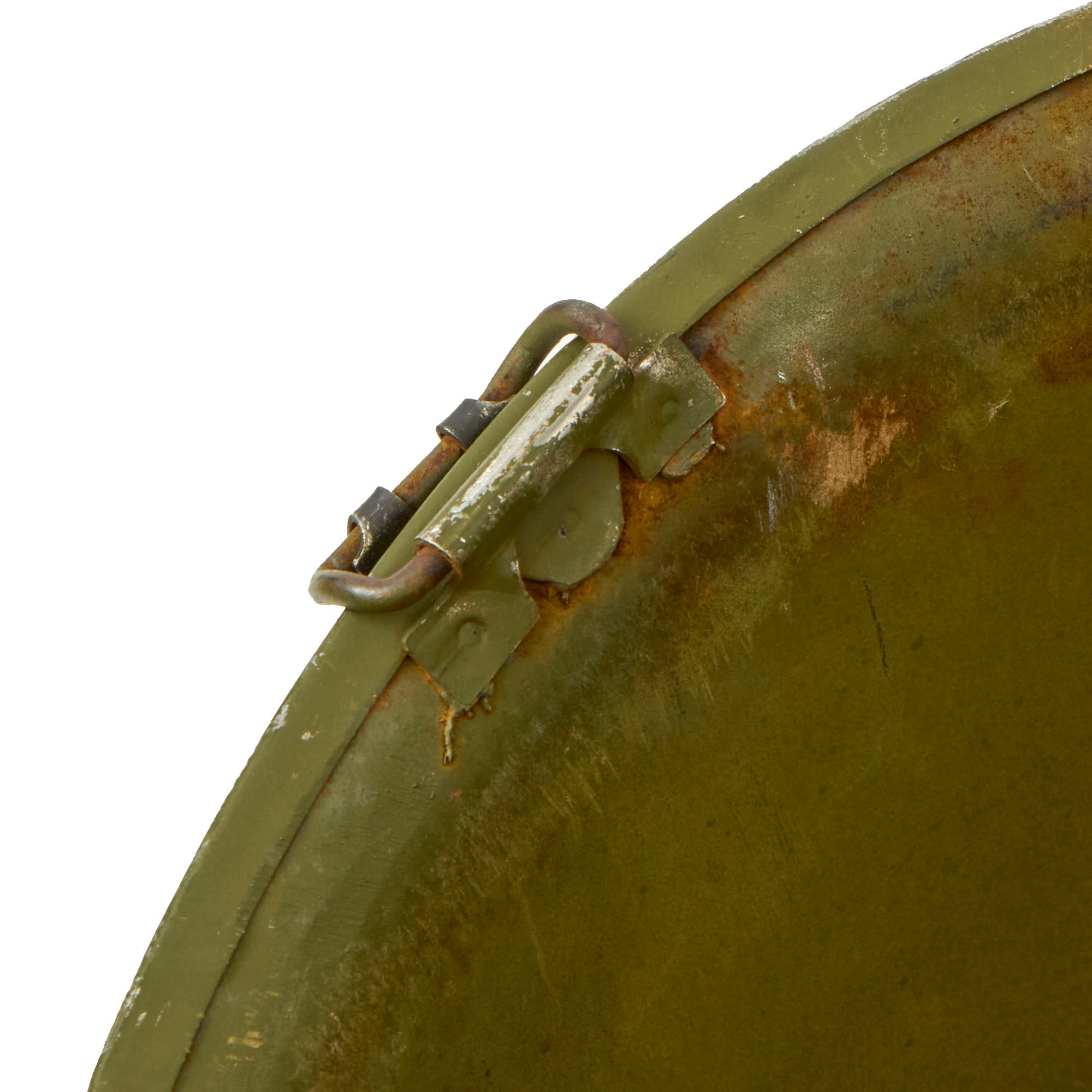 Vietnam War era M-1 helmet shells have a set of swivel (movable) chinstrap loops called bales and a manganese steel rim. These rims had non-magnetic qualities that reduced the chance of error readings when placed around certain sensitive equipment (such as a compass). In WWII the shells had Stainless Steel rims, however these would easily lose paint, and the shine produced without paint was a liability. This example is actually a WWII era produced M1 helmet with partial heat lot stamp that is unfortunately mostly obscured by textured paint.