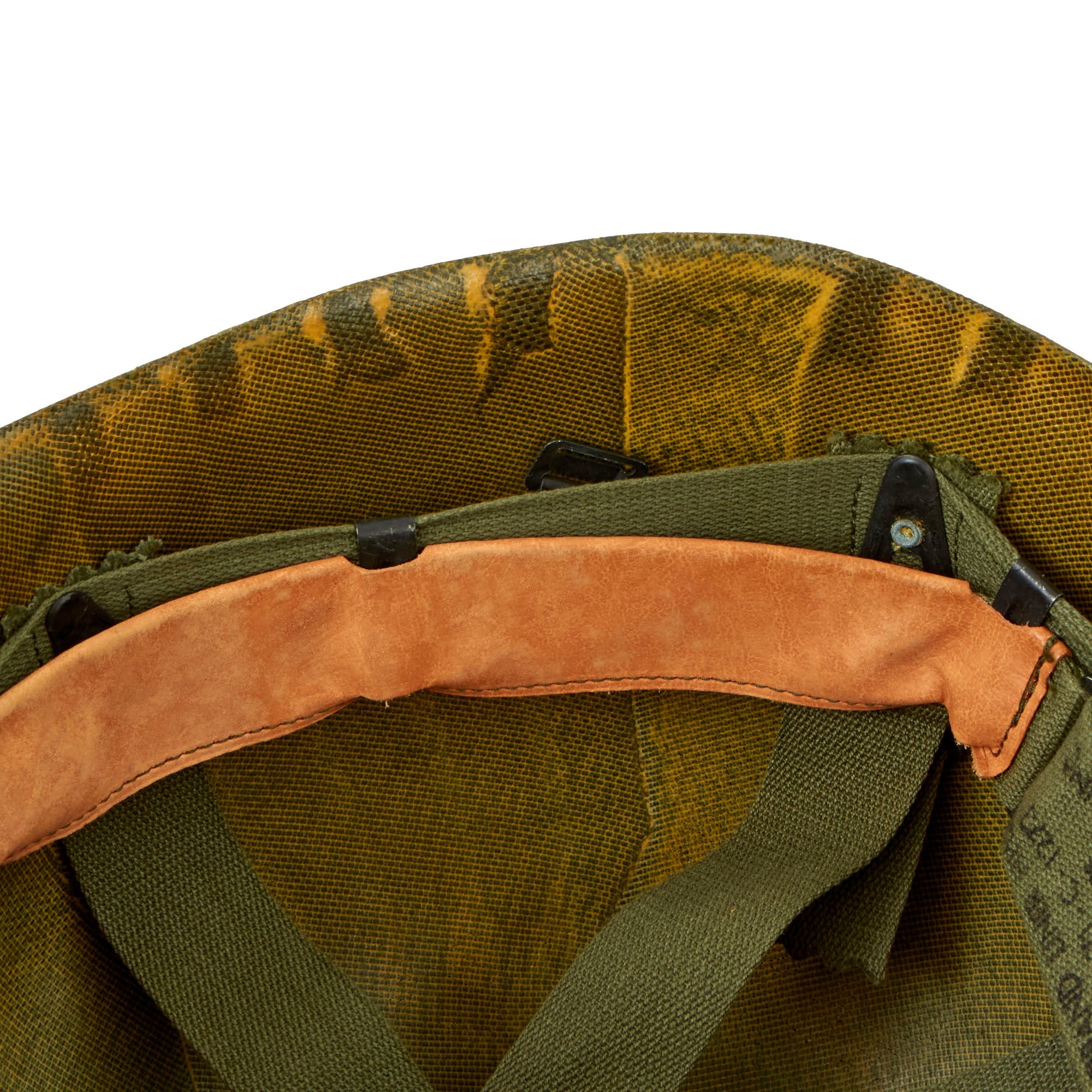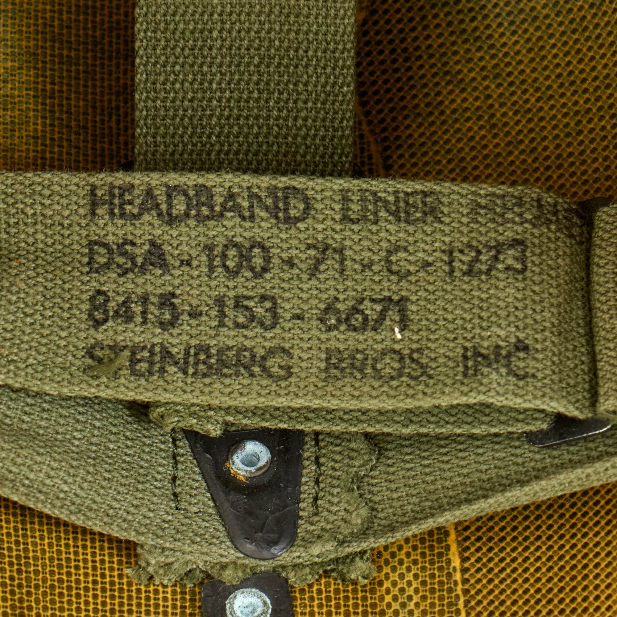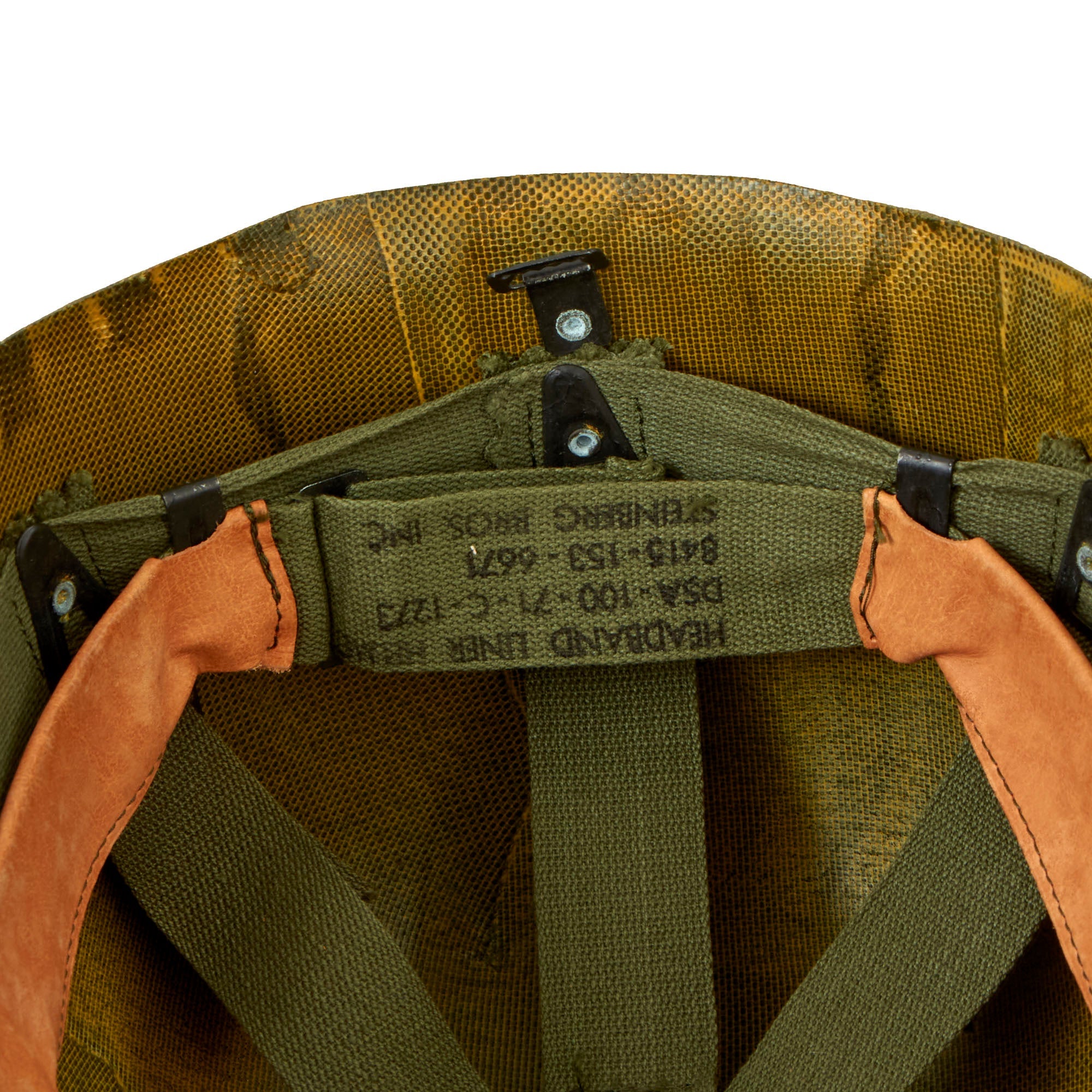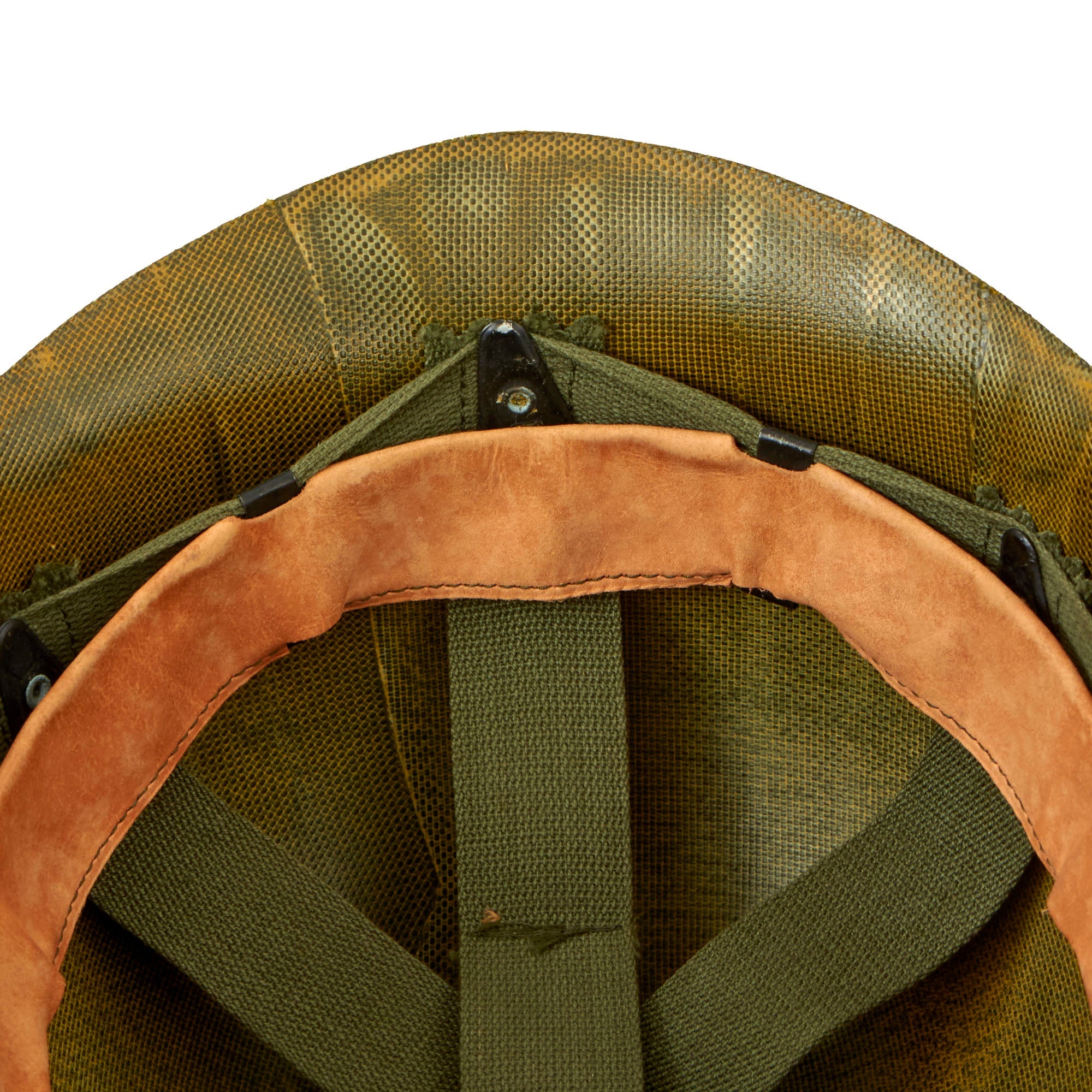 The helmet comes complete with high pressure Vietnam War era liner. The liner does not have a frontal eyelet, indicating that it is a post Korean war manufacture. A new suspension system for the M1 Helmet Liner was introduced in 1964, with this one being in great condition.