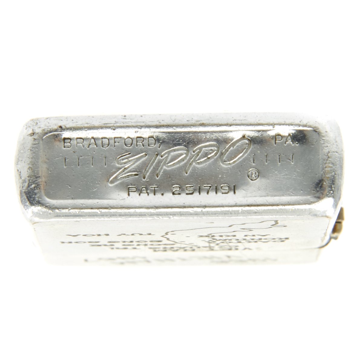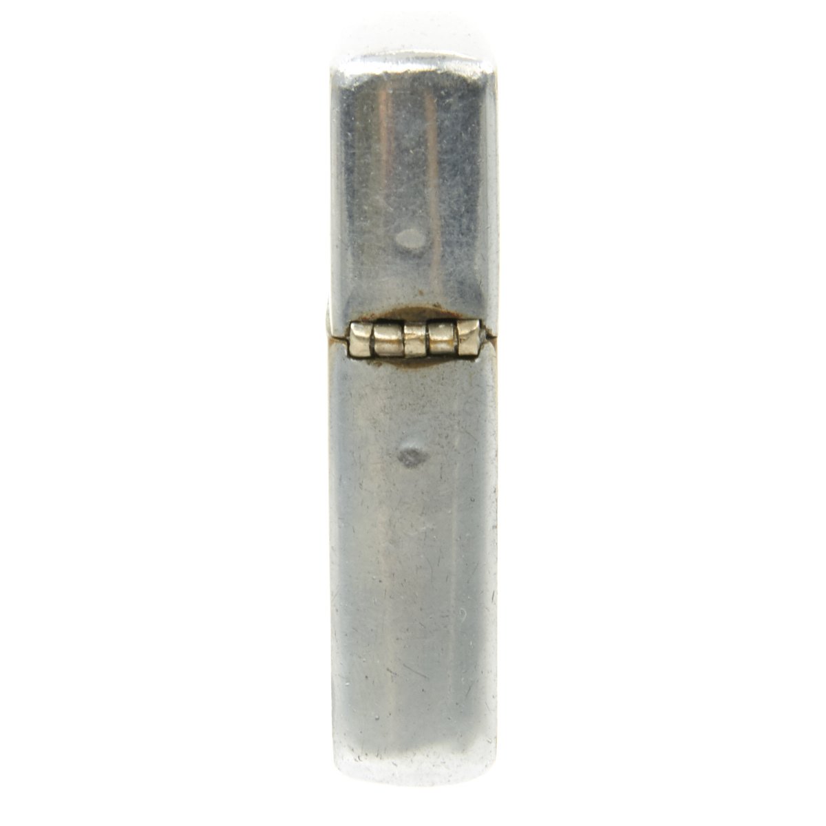Lighter appears to be in fully functional condition, though we have not added fluid. The underside of the lighter bears the ZIPPO logo and Bradford, PA and 8 hash marks or vertical lines which denotes the manufacture date as 1966.