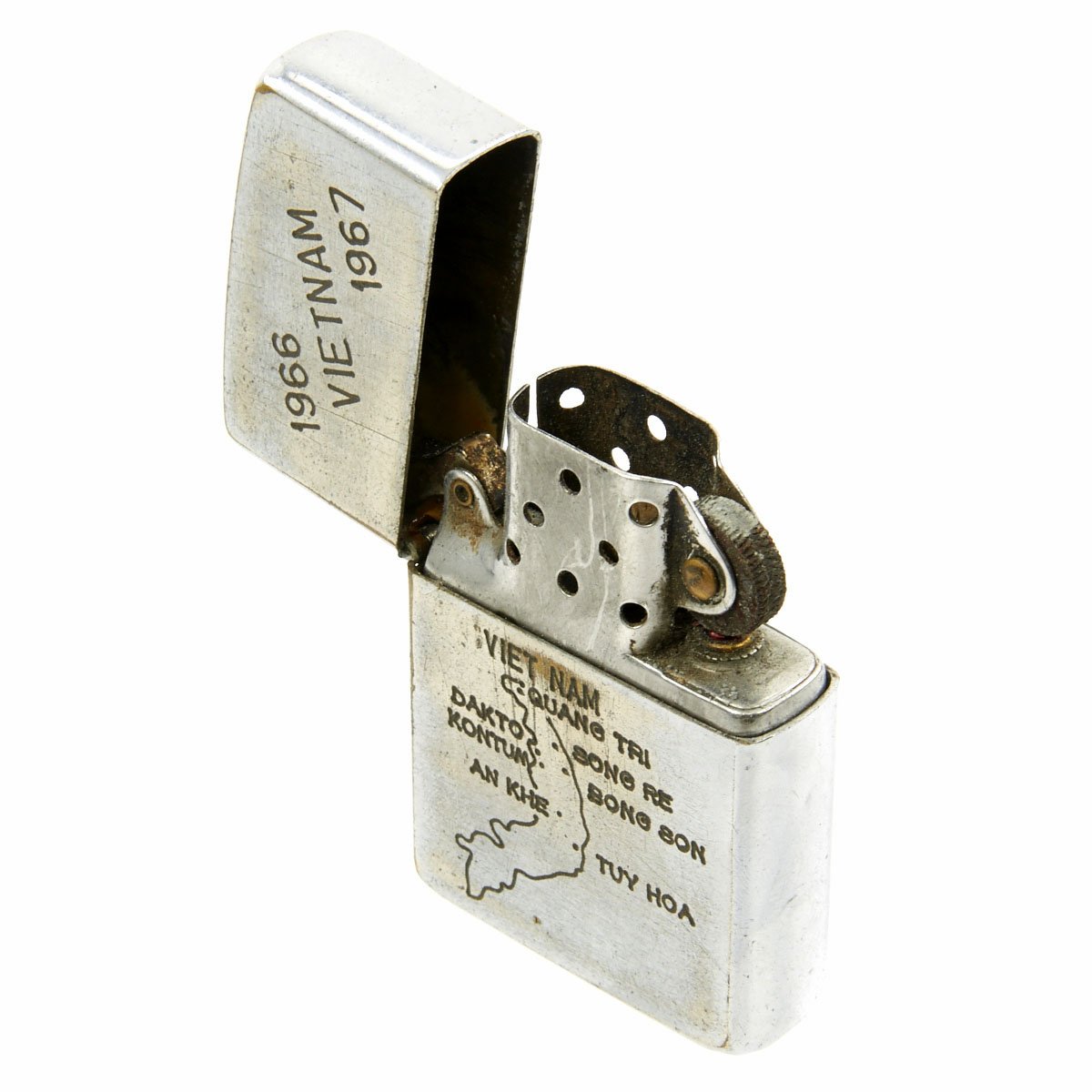 Below this is an engraved map of Vietnam, showing various locations such as DAKTO, QUANG TRI, and TUY HOA. These all seem to be U.S. military bases, and may indicate the various locations the lighter's owner visited during their time in Vietnam.