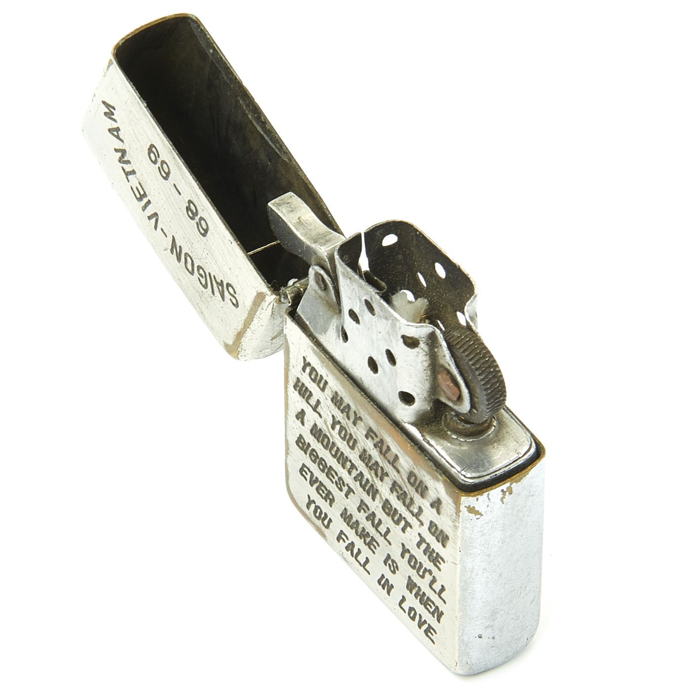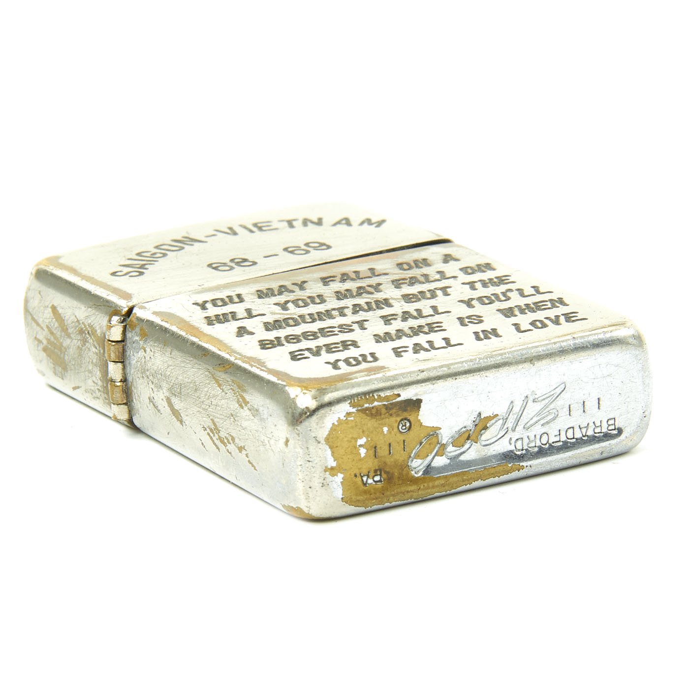 A note on how to verify that this is an authentic VIETNAM era zippo lighter- To determine a ZIPPO's with correct date marks (before 1975) check the zippo date according to the dating card supplied by the zippo firm. For the years between 1966 and 1975 (Vietnam war ended in April 1975) the codes are: four vertical bars each side of the italicized zippo logo for 1966. Then the bars were removed alternatively first on the right and then on the left. So for 1967 four bars on the left and three on the right, three each side for 1968 and so one until 1973 last year with vertical bar coding. Lighters from 1973 have one bar on the left and nothing on the right. In 1974, the code marks turn to slashes; four slashes on each side of the italicized zippo logo and in 1975 only three slashes on the right part.