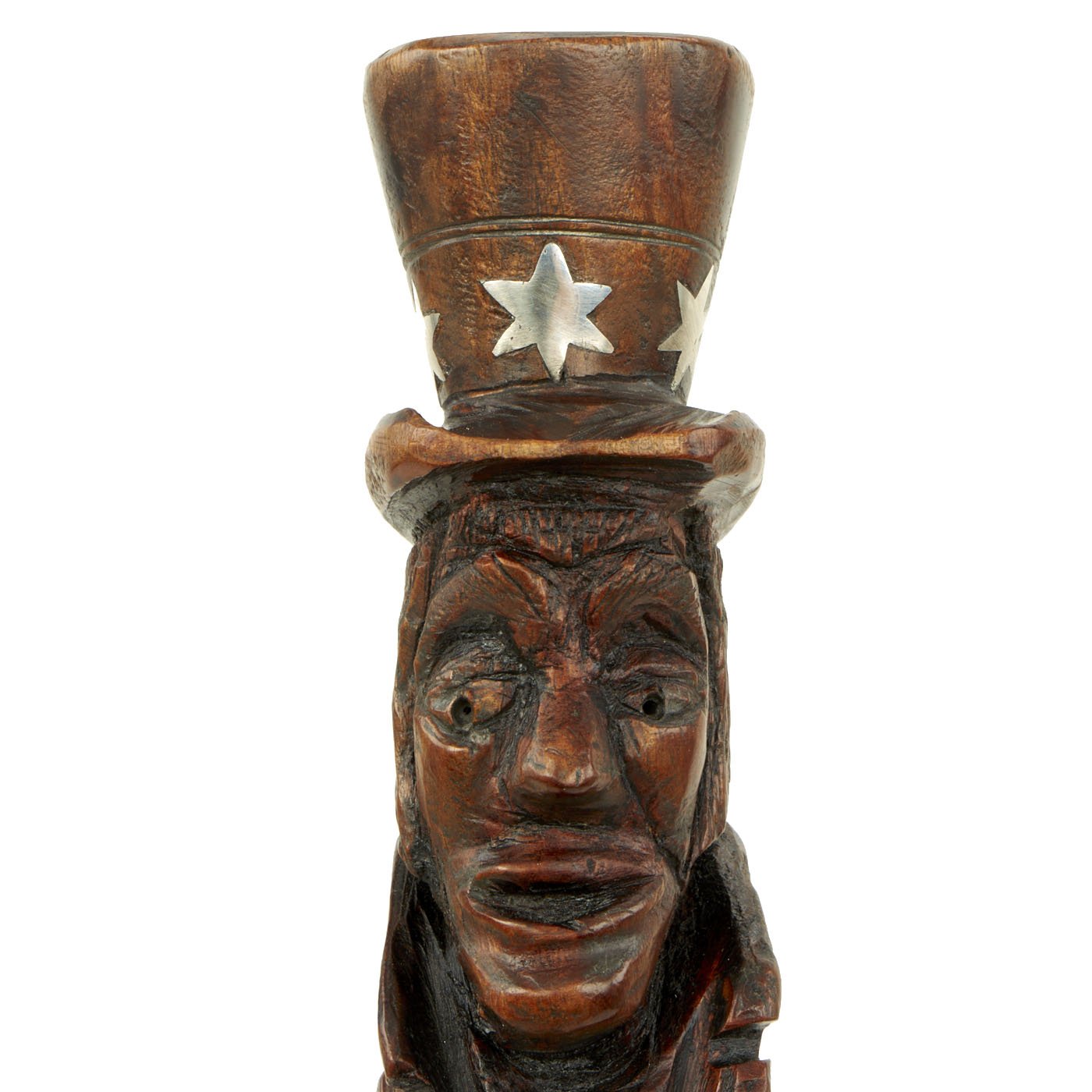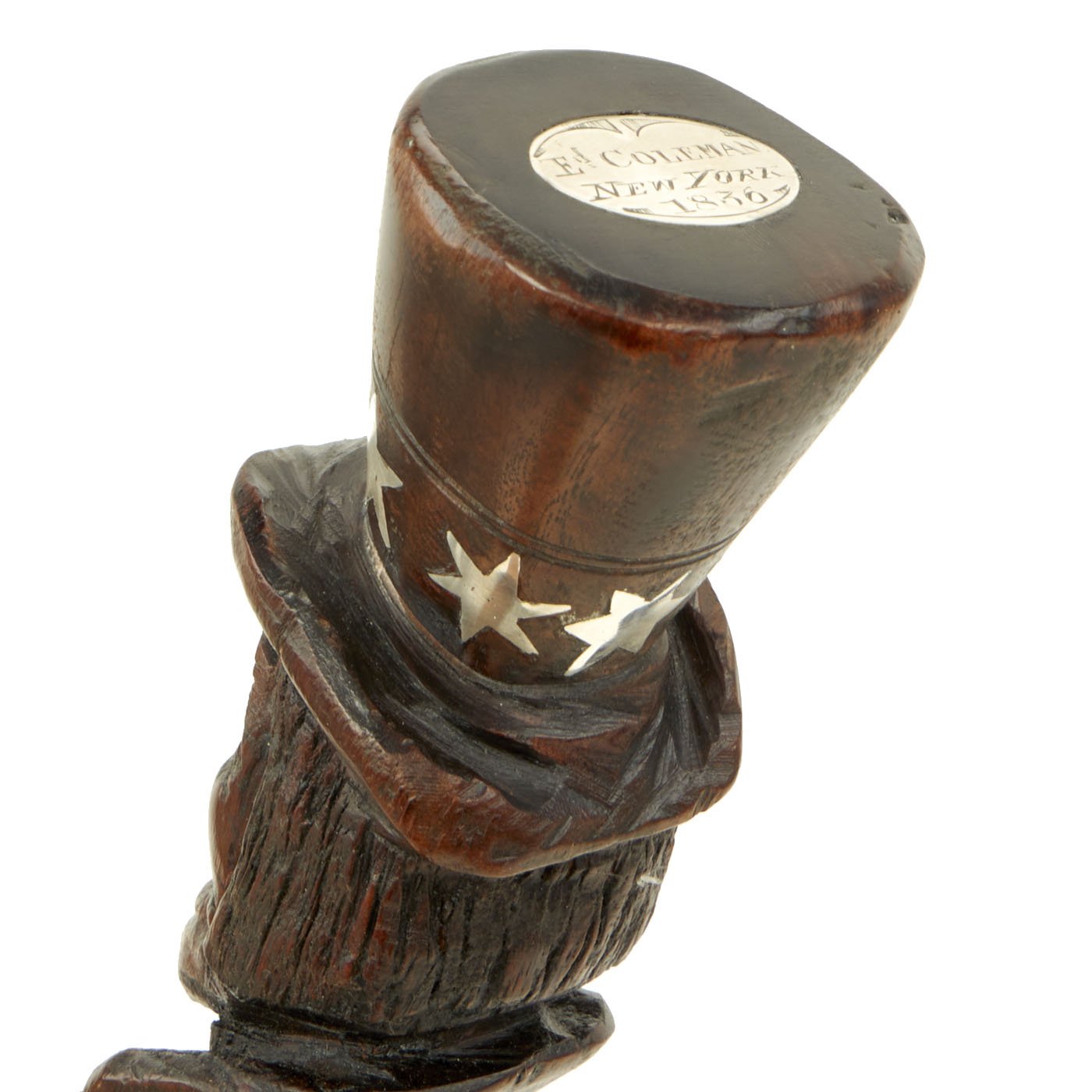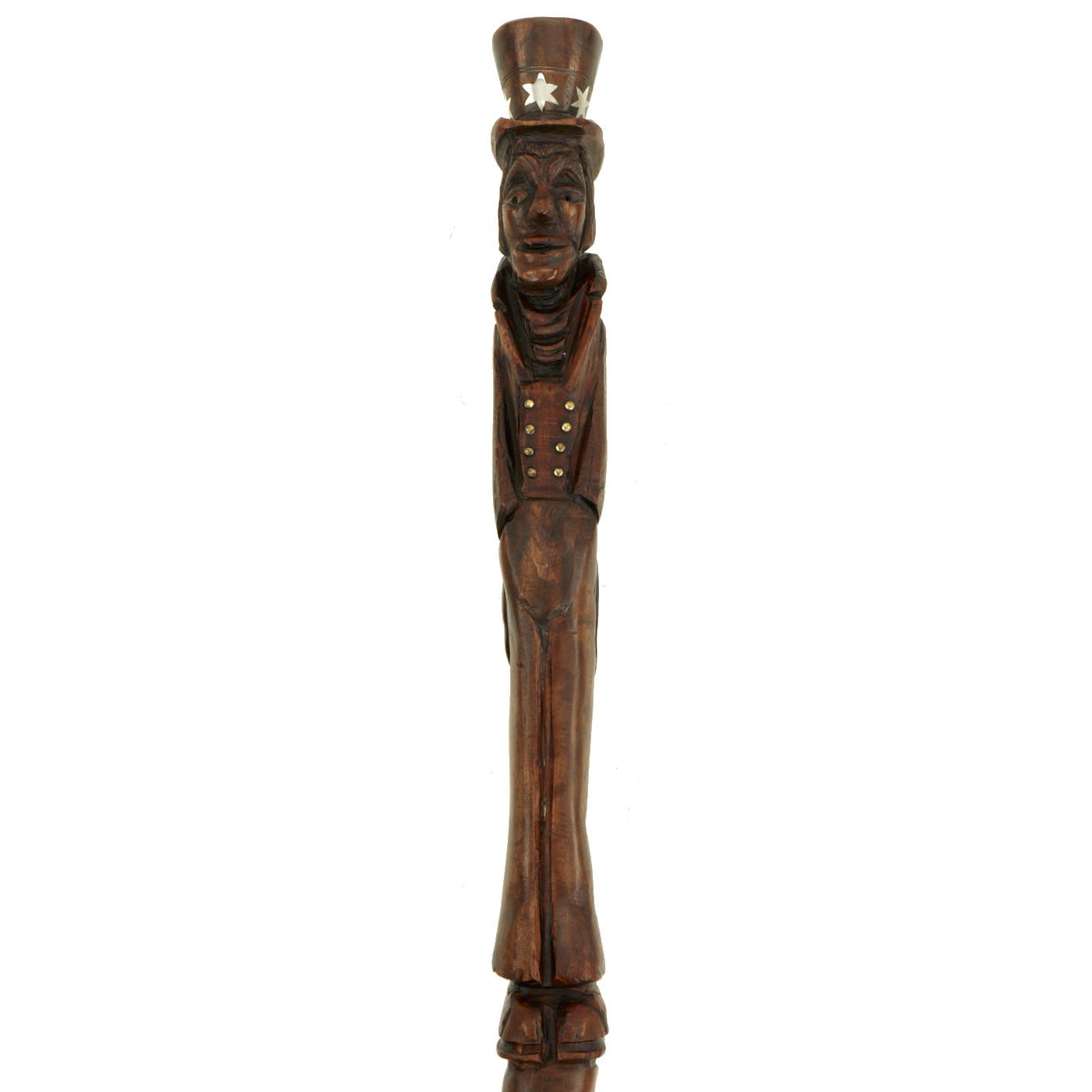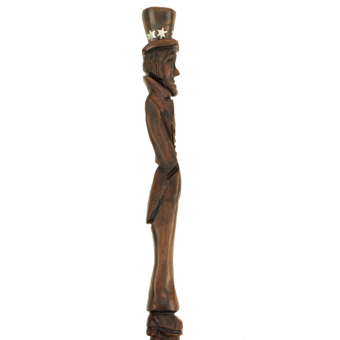 Original item. One of a Kind. This is a striking Walking Cane in one of the earliest forms of of "UNCLE SAM" we've ever seen. A beautifully carved caricature of a very tall Uncle Sam with his hands in his pockets with long hair a the typical TOP HAT inlaid with SIX Silver stars. The top of the top hat has an inlaid Silver plaque engraved:-