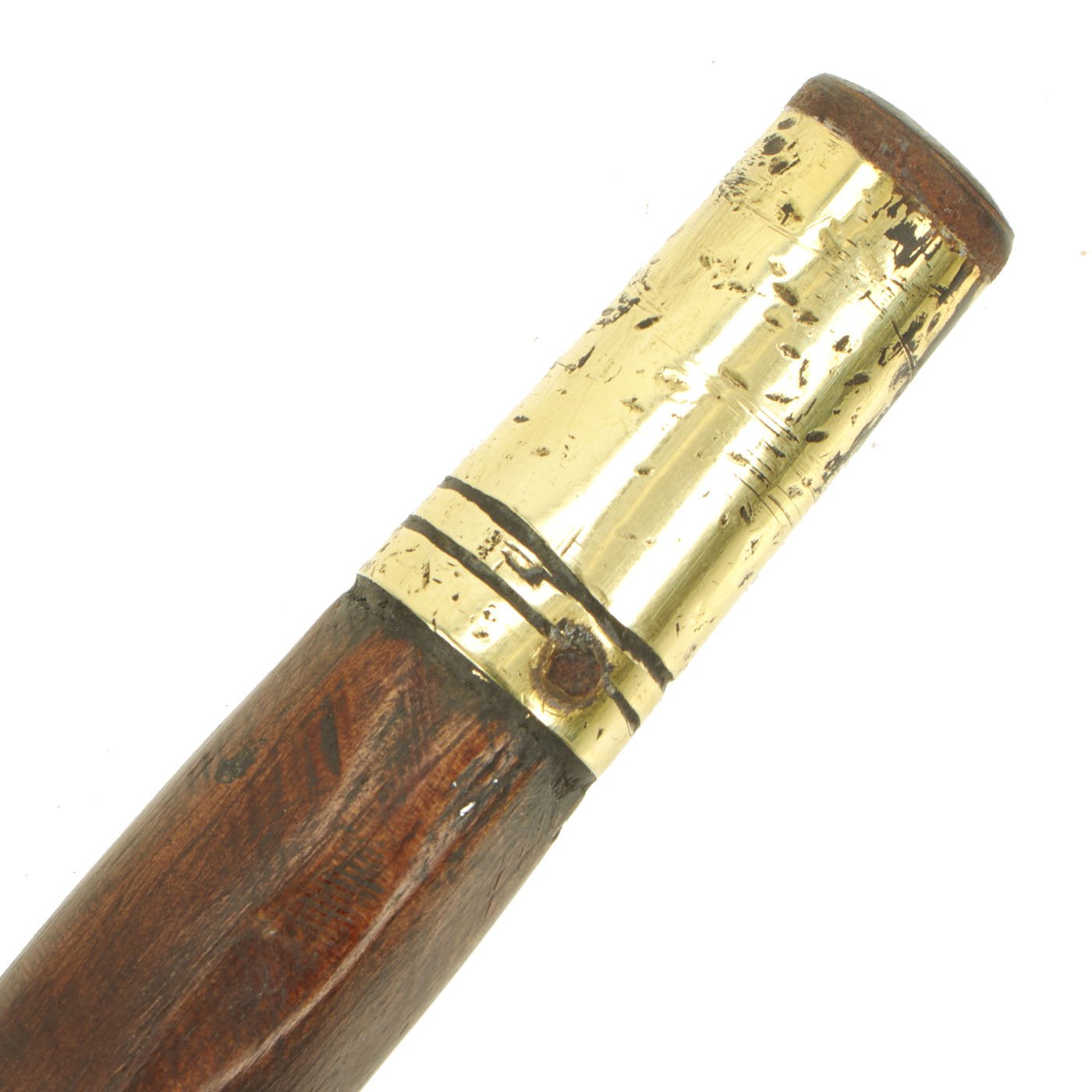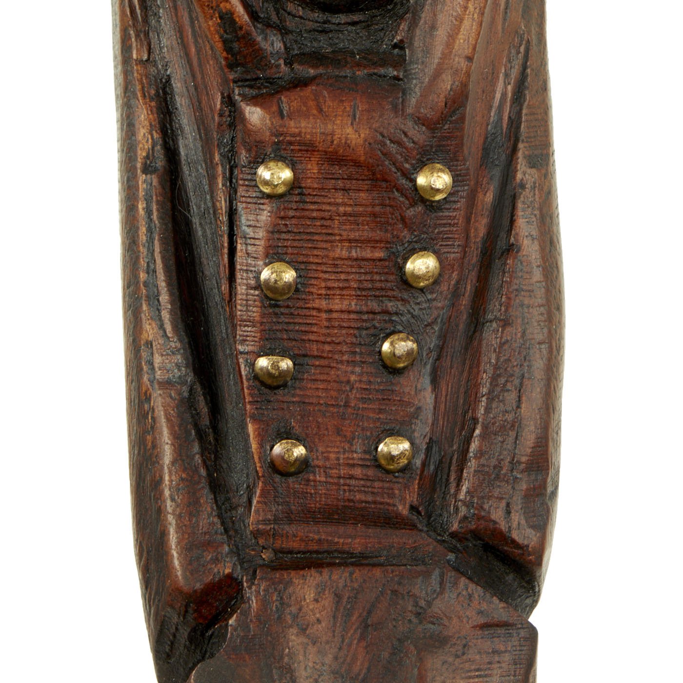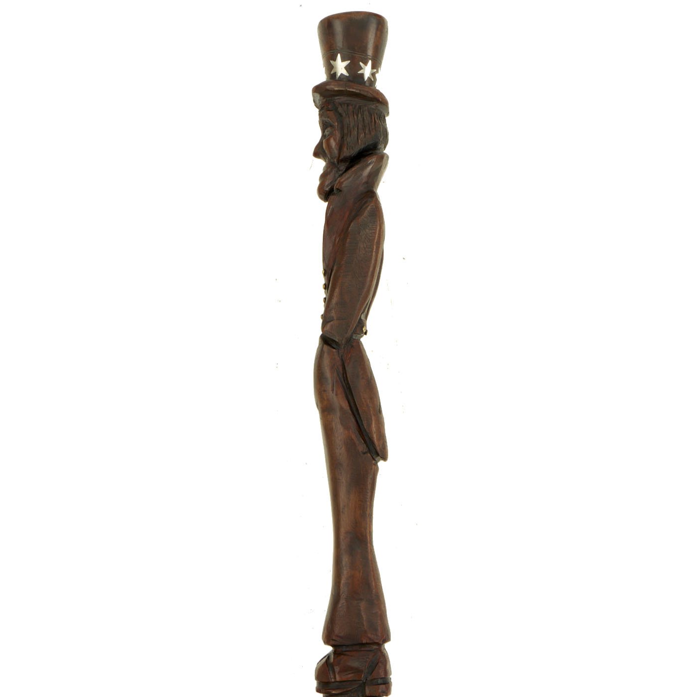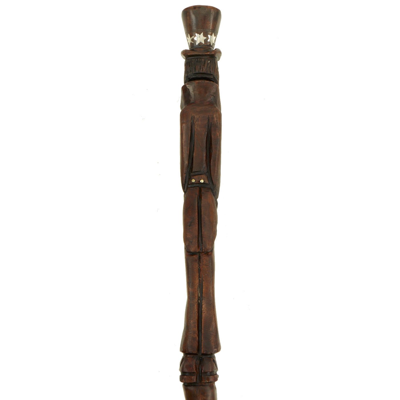 Original item. One of a Kind. This is a striking Walking Cane in one of the earliest forms of of "UNCLE SAM" we've ever seen. A beautifully carved caricature of a very tall Uncle Sam with his hands in his pockets with long hair a the typical TOP HAT inlaid with SIX Silver stars. The top of the top hat has an inlaid Silver plaque engraved:-