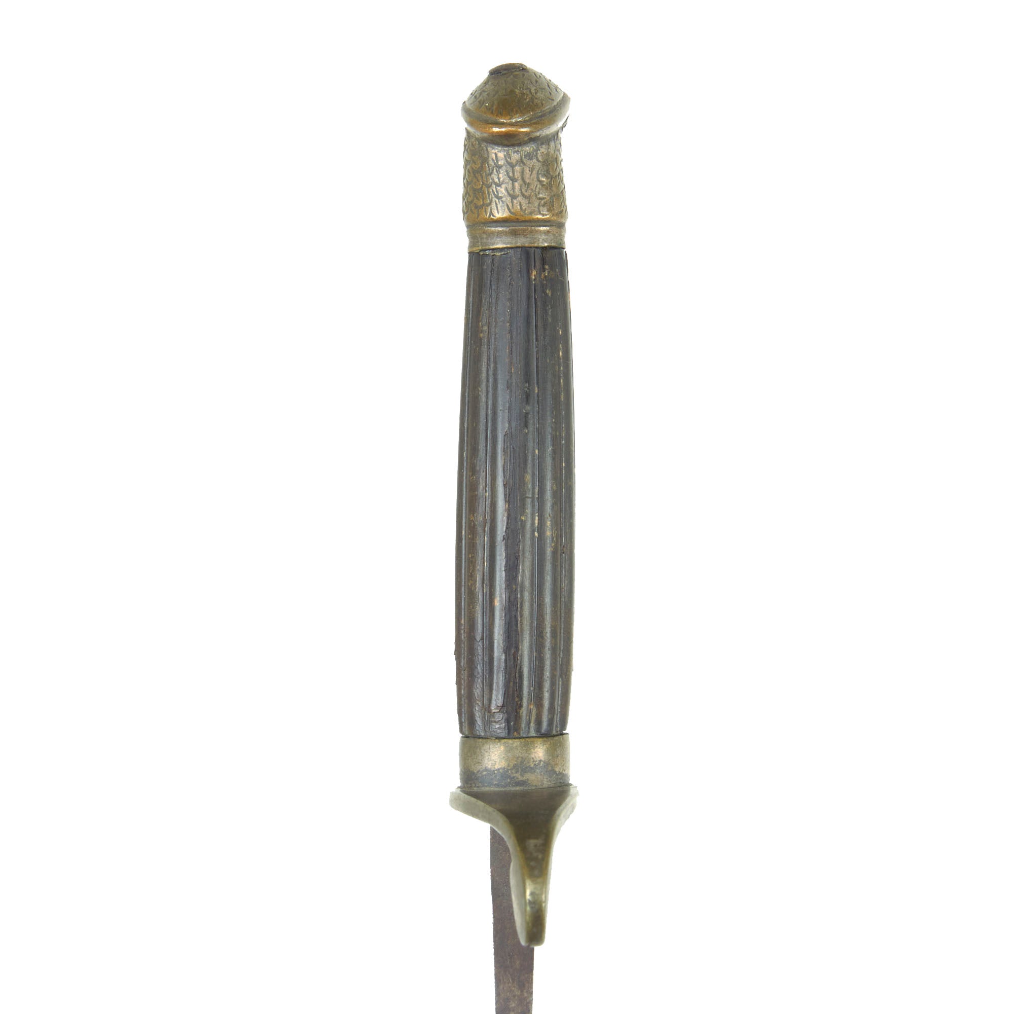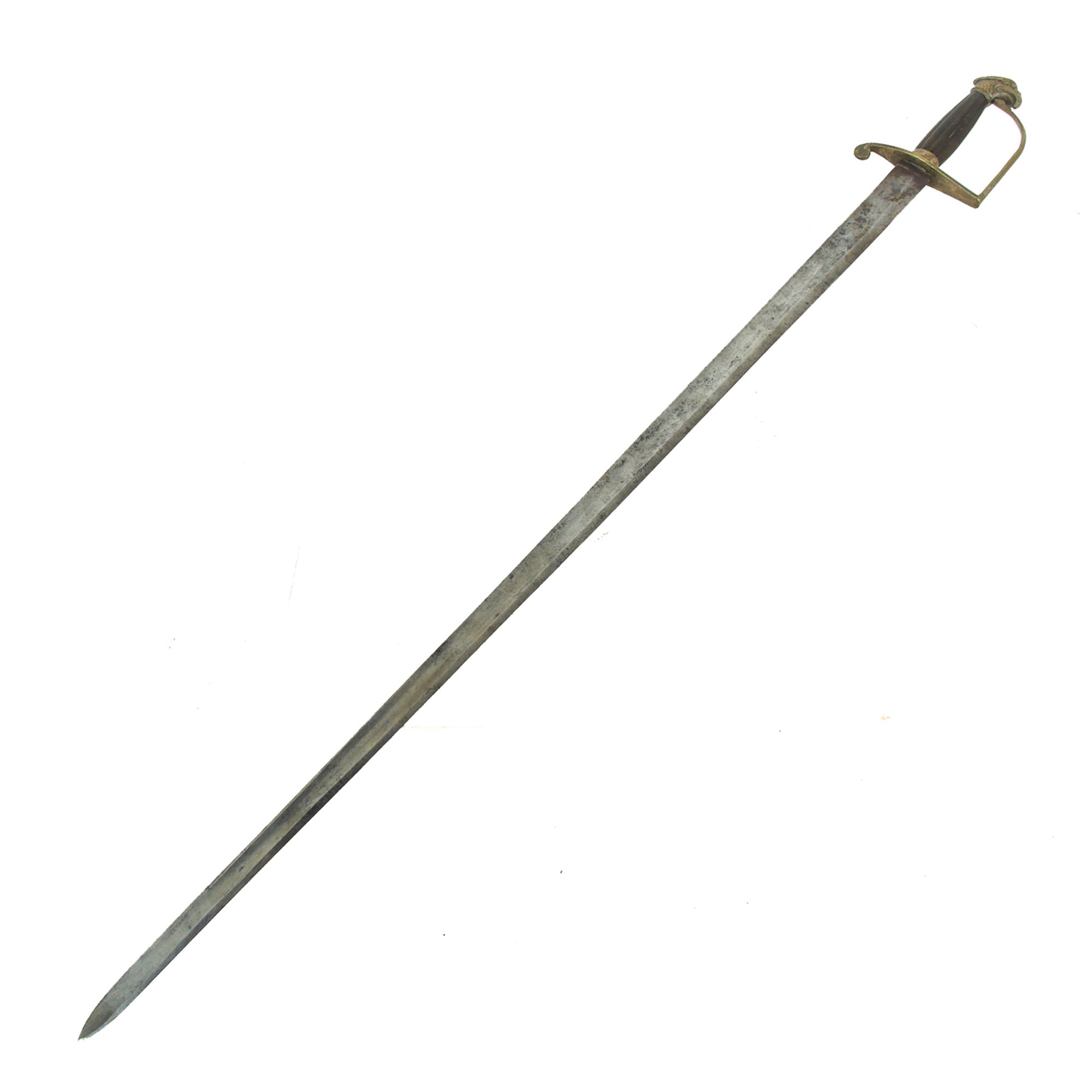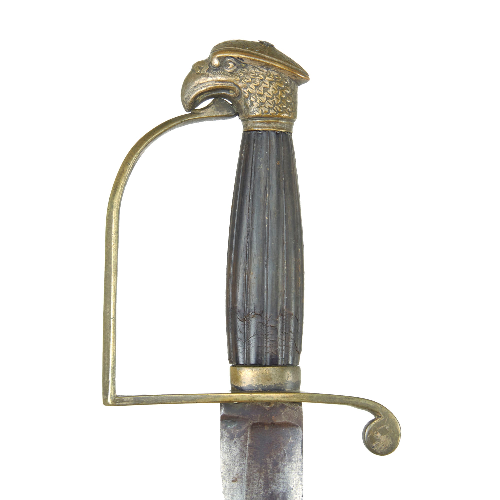 The sword features a lovely 32¾” straight blade with a single uninterrupted fuller. The blade has held up very well considering the absence of its scabbard. There is evidence of past oxidation cleaning which has given the blade a lovely patina. The brass handguard is a bit loose to the blade, but isn’t at risk of loss or breakage. The dark horn fluted grip is in great shape with just some cracking from age. The eagle’s head pommel is still lovely without any denting.