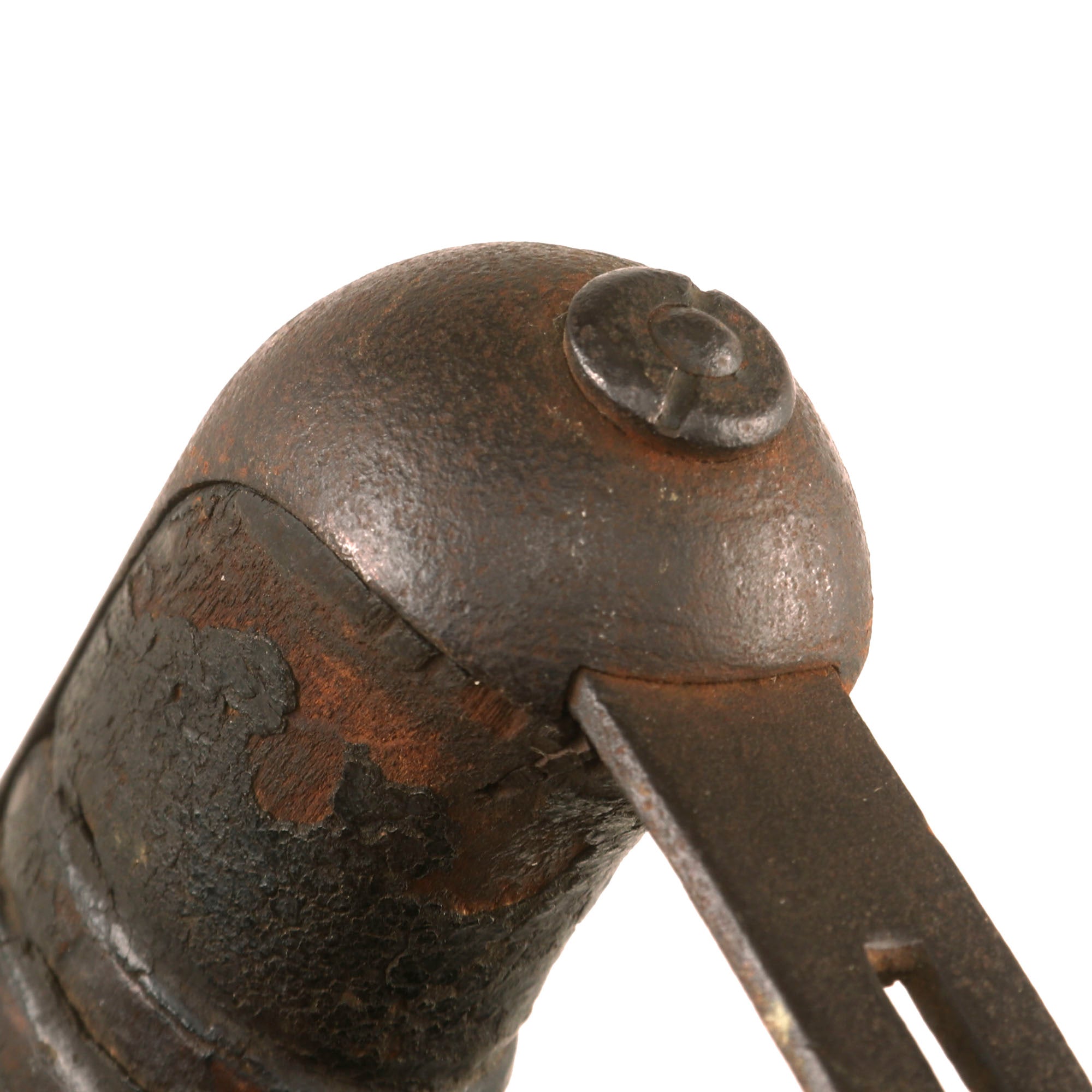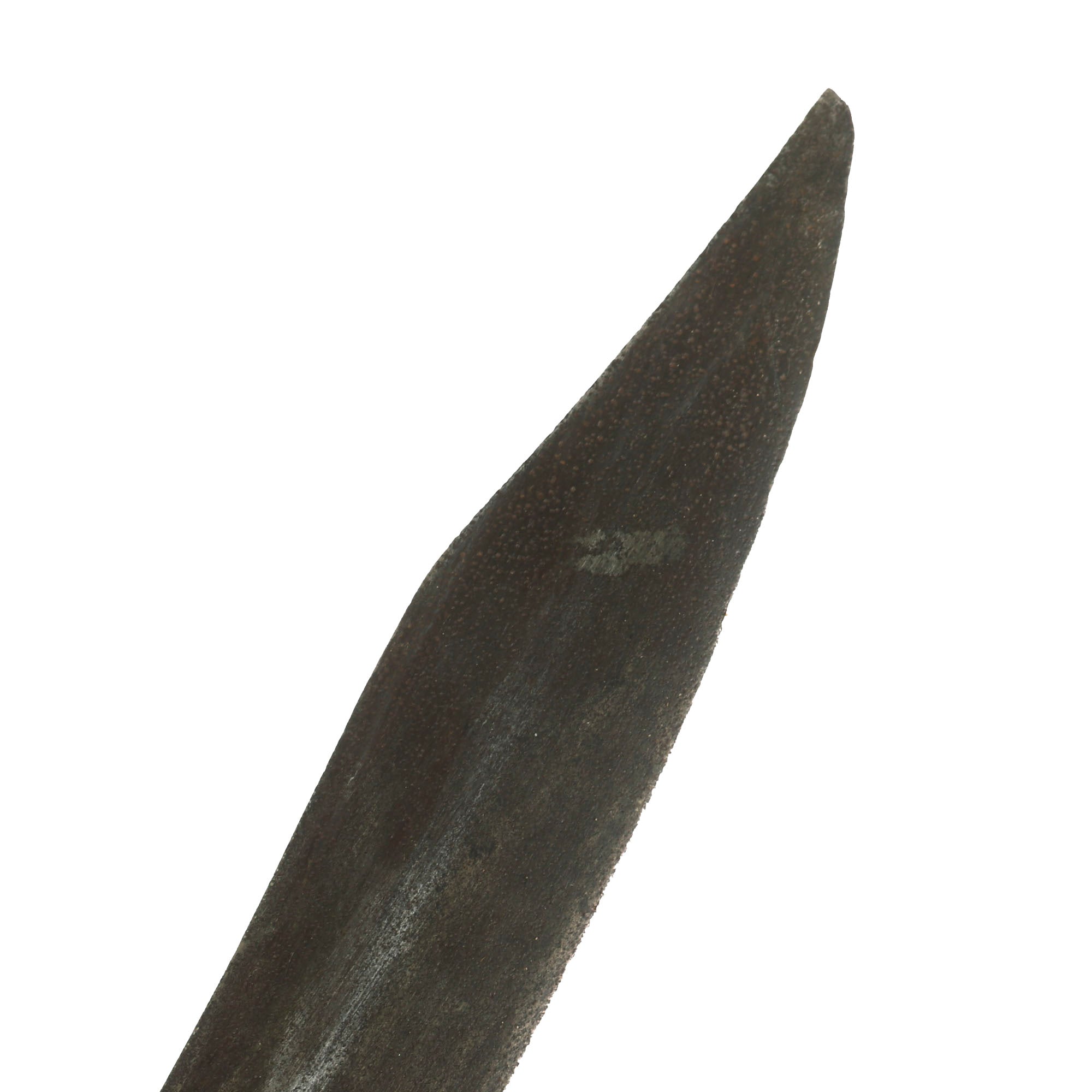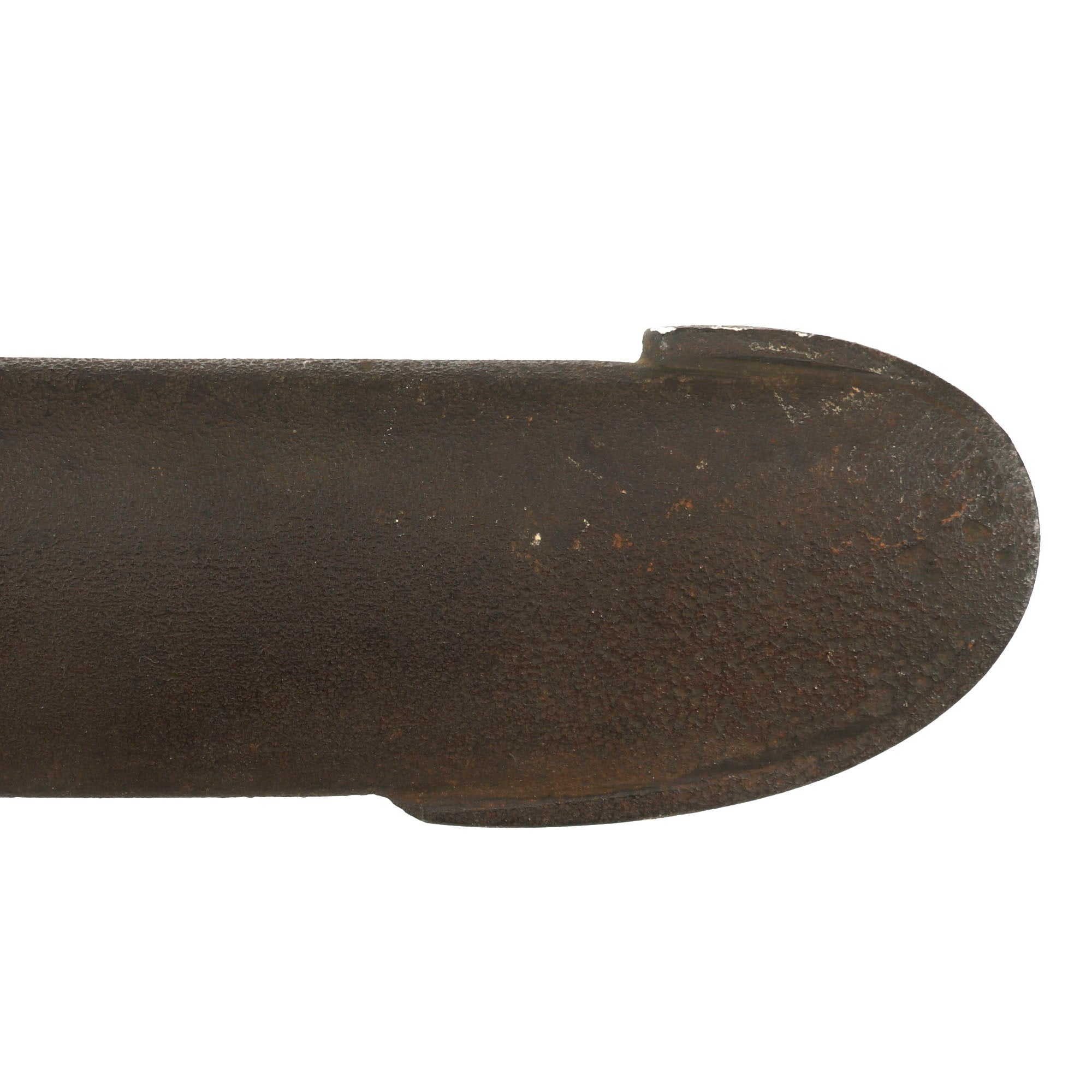 This well patinated example features a hefty iron hilt, with a good condition original ribbed wooden grip. The original binding is missing, and there are only small pieces of the original leather wrapping present, which are dried out and delicate. The leather blade buffer is present, but quite hard to the touch. This is mated to a 33 ½” long curved unfullered single-edged blade. The blade is curved right out of the hilt, so it has a pronounced forward bow, and the tip has a very pronounced clip point. The blade is about 1 3/8" wide, getting slightly wider at the transition to the point.