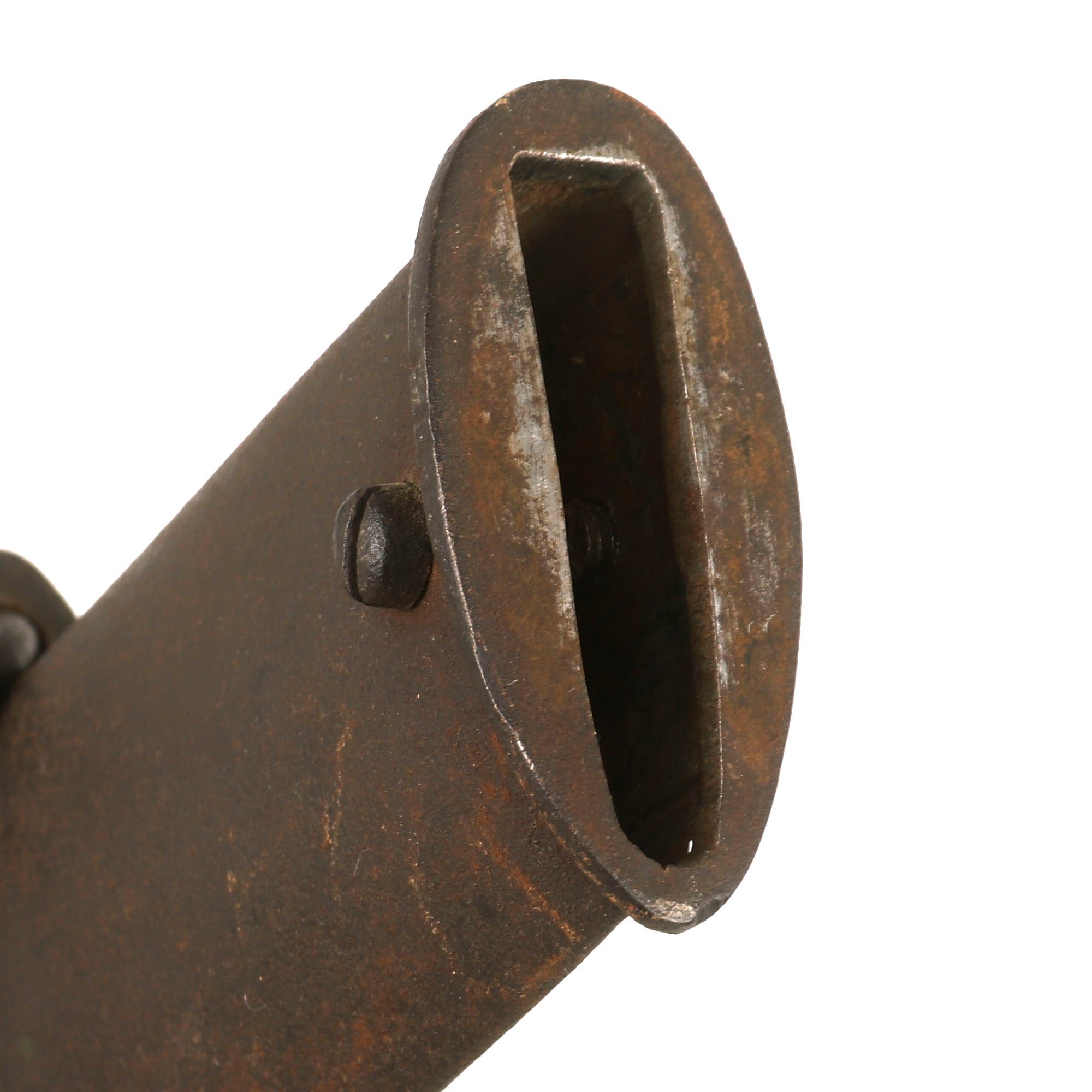 The blade definitely looks to have seen long service, and exhibits an dark gray oxidized patina overall. There is some more advanced rust and some pitting on the last 1/4 of the blade, and the edge definitely shows nicks and dents from use, as well as some damage from oxidation. Overall it has a great look of a service used blade that is over 200 years in age. The matching scabbard is in similar condition, showing staining and oxidation, but no major dents or bends. The original hanger loops are still present, as is the throat, with both original screws present.