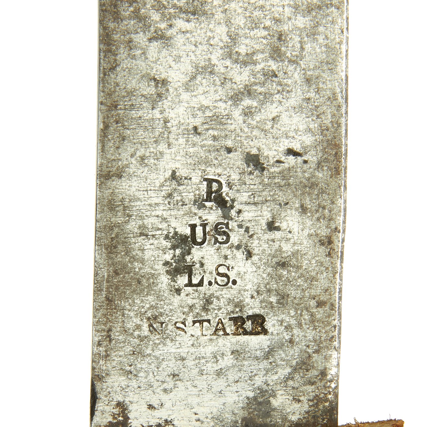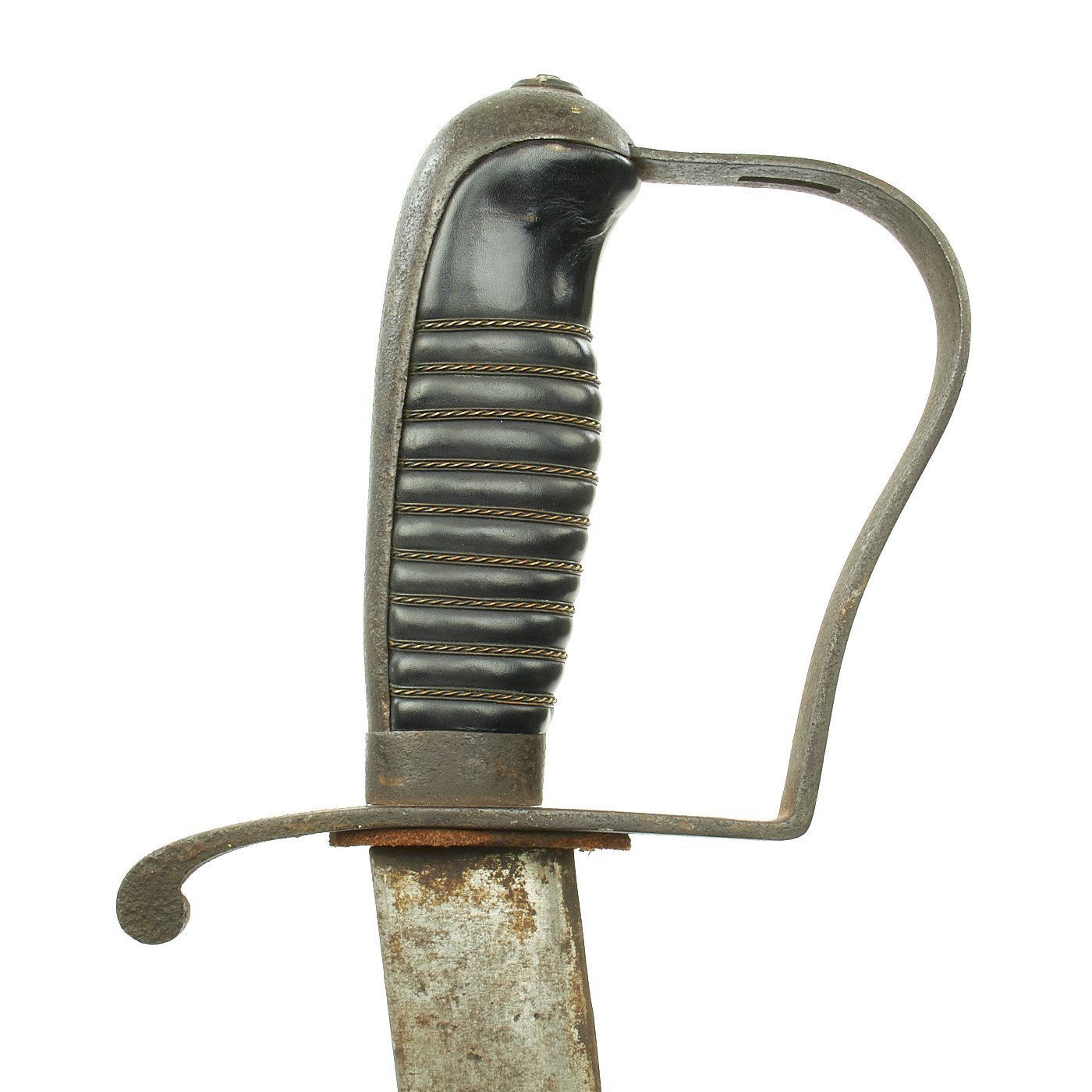 This hefty cavalry saber is a no-nonsense enlisted man’s edged weapon and one of over 10,000 such pieces made under the Starr contract of January 1813, which superseded his earlier contract from 1812. The Saber follows a modified design criterion specified on January 11, 1813 that incorporated a sharper curve to the blade, a pronounced angle to the hilt and a wider opening between grips and hand guard, which exhibits the reverse-P pattern. It has a slot near the pommel for a sword knot or leather grip strap.