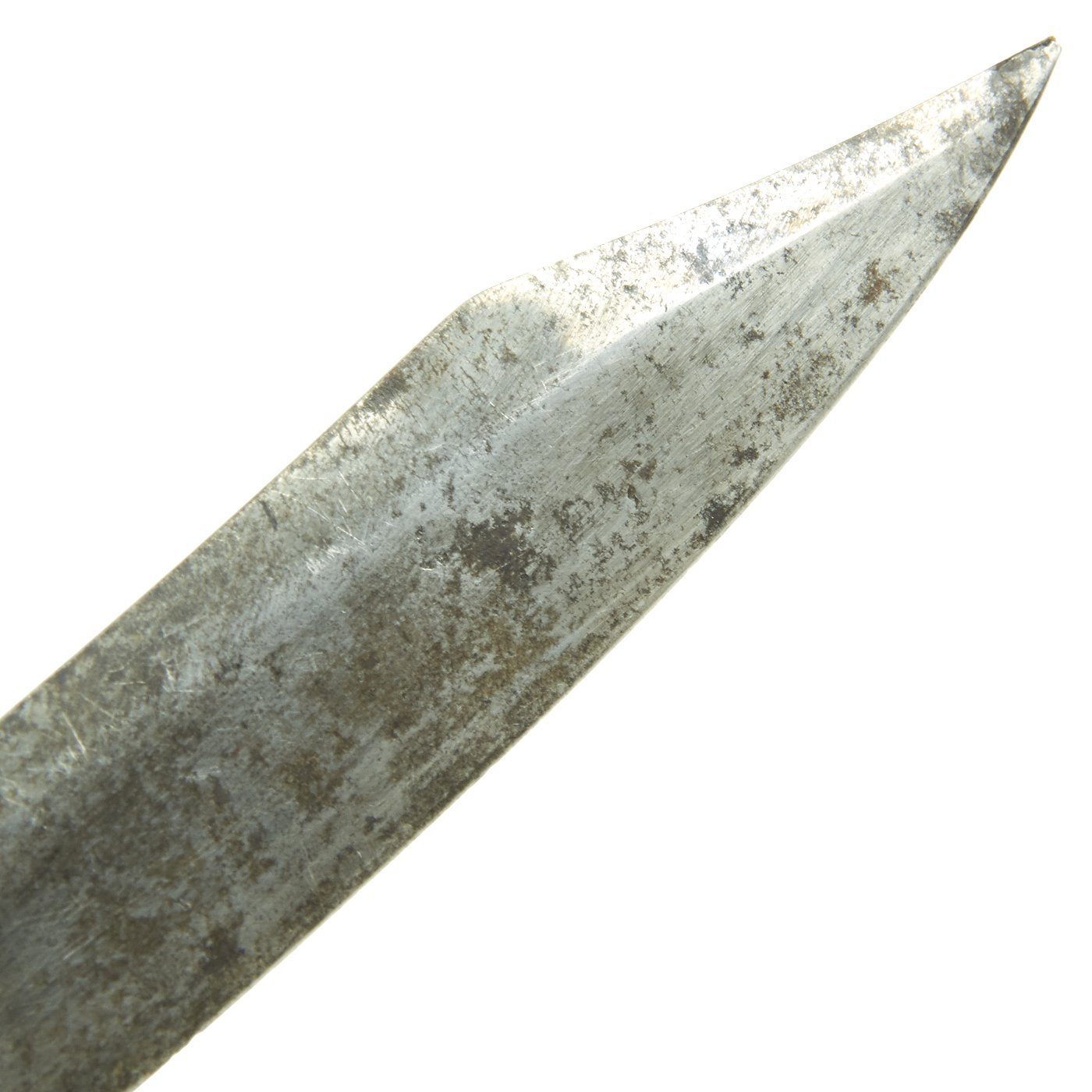 This example features a hefty iron hilt, with a very good condition original leather covered ribbed wooden grip. It even still has the original wire wrapping, as well as the original leather blade buffer against the cross guard. The condition of the leather though leads us to think that it was arsenal refreshed at some point in its life, as looks too good to be 200 years old. This is mated to a 33” long curved unfullered single-edged blade. The blade is curved right out of the hilt, so it has a pronounced forward bow, and the tip has a very pronounced clip point. The blade is about 1 3/8" wide, getting slightly wider at the transition to the point.