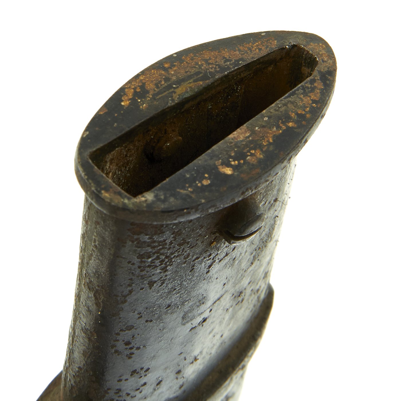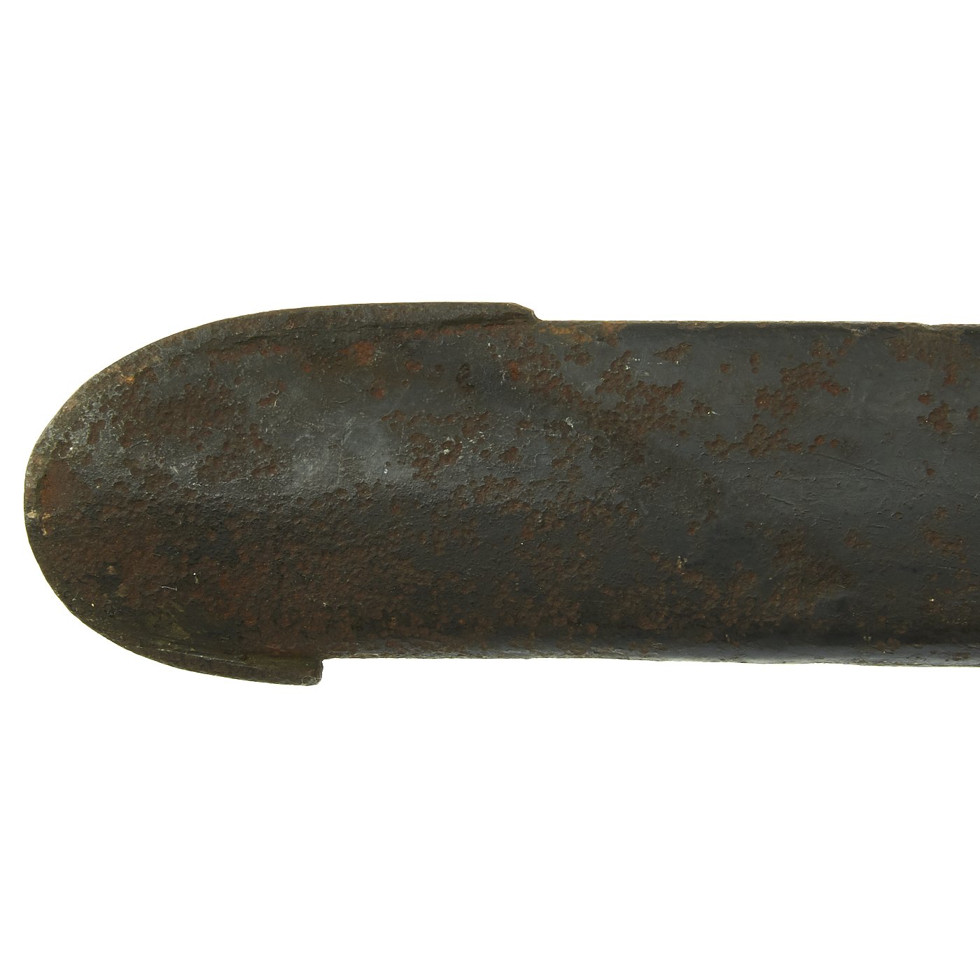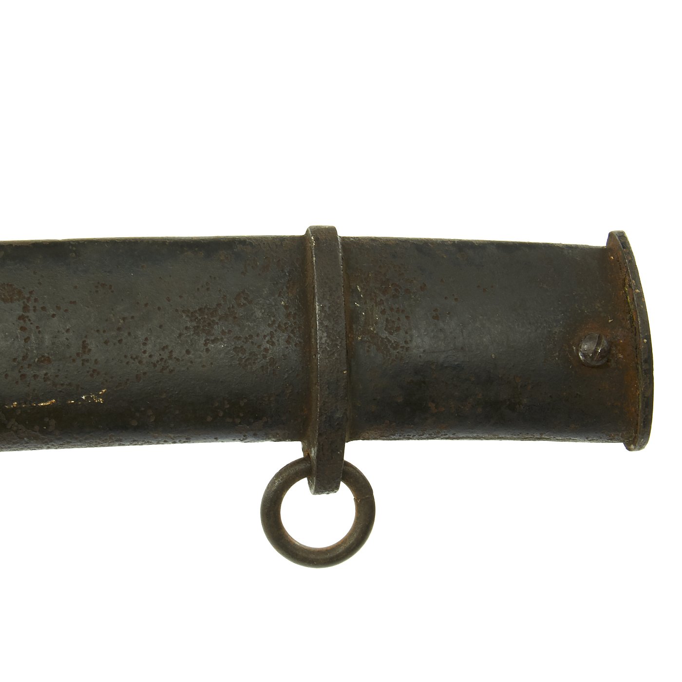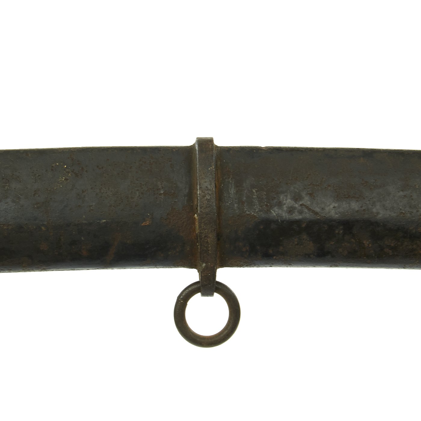 The blade is still mostly sharp, and exhibits staining and some light pitting, as expected of a sword of this age. There are some runner marks, but overall it has a great look of a service used blade that is over 200 years in age. The matching scabbard is in similar condition, and was painted long ago to prevent rust. The original hanger loops are still present, however there are some significant dents to the scabbard body. These do not interfere with sheathing the blade.