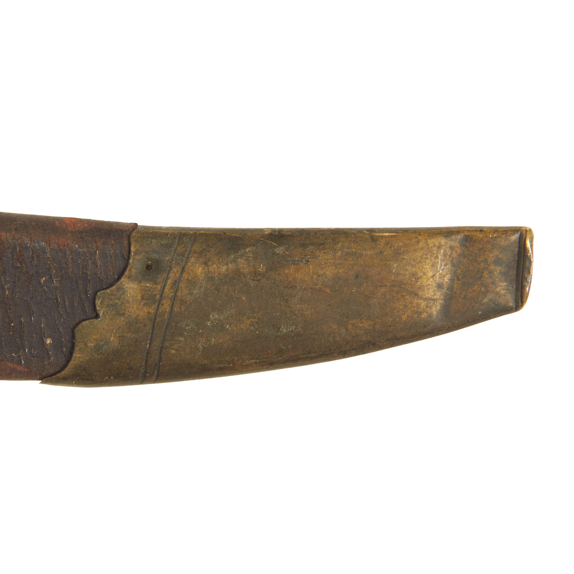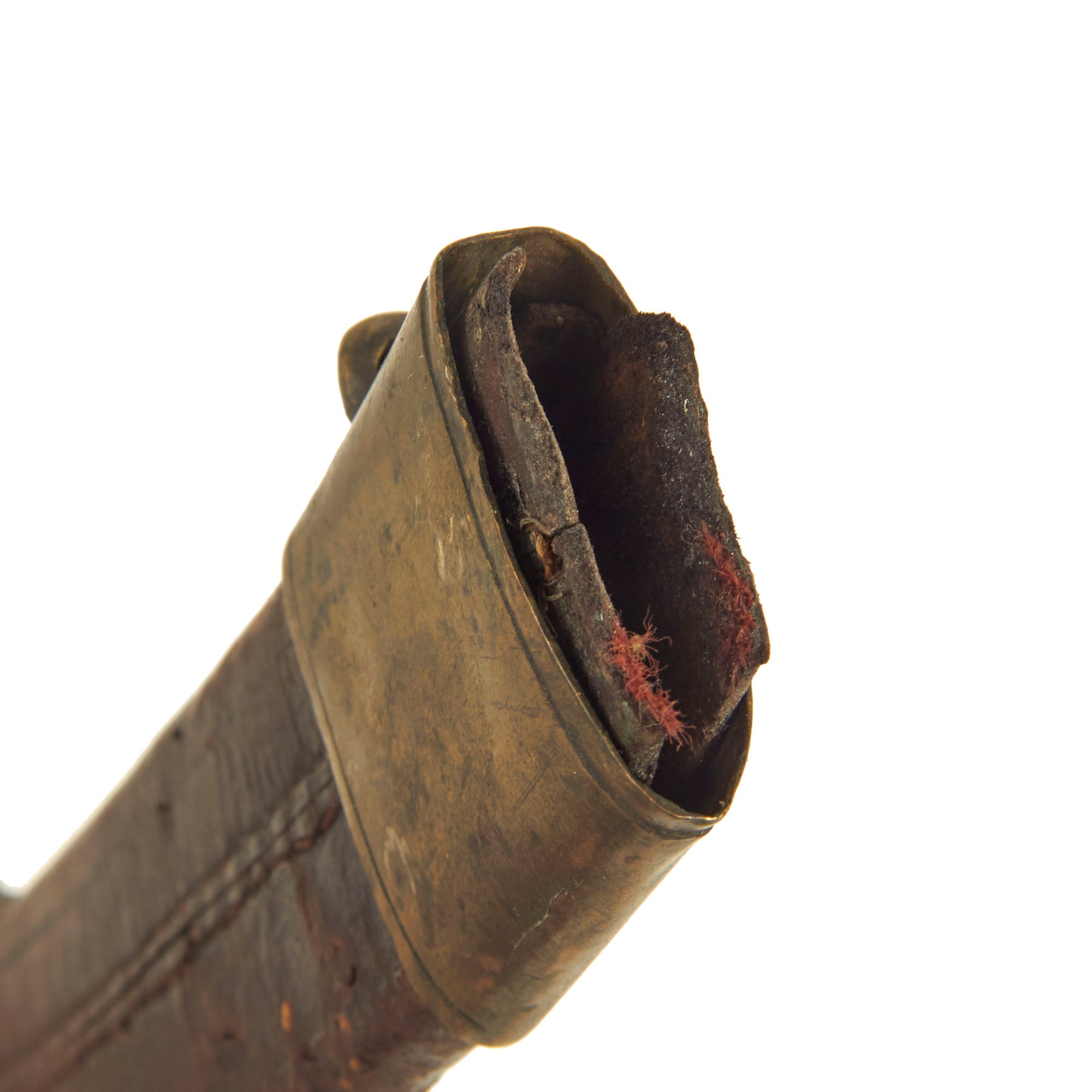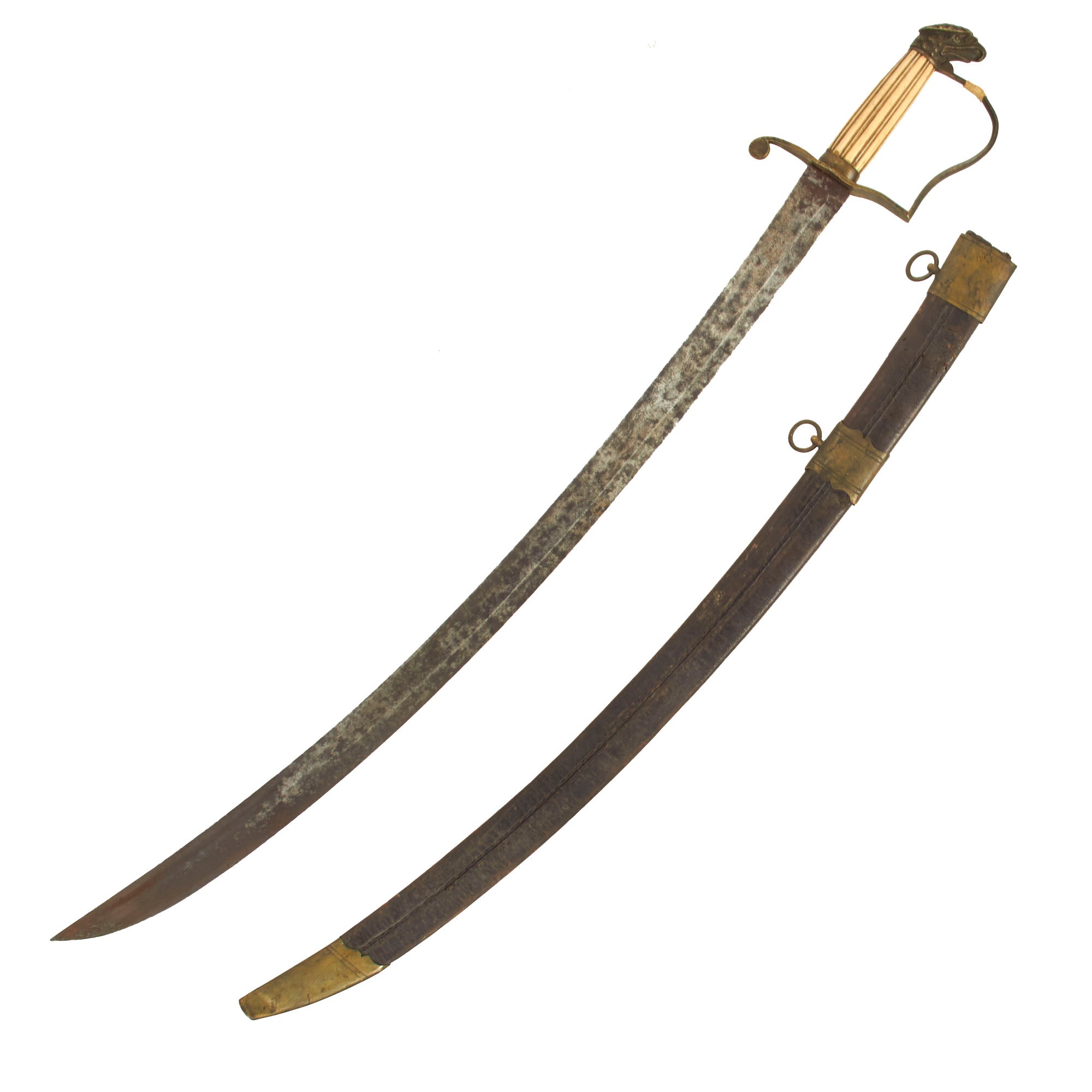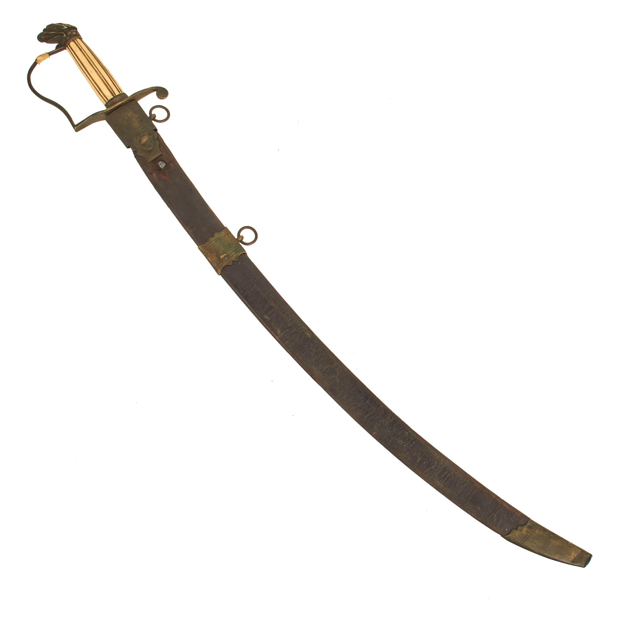 The included leather scabbard appears to be original to the sword and is in mostly solid condition. The brass hardware is tarnished but still lovely. The throat hardware is no longer attached to the leather and will move freely and come off.