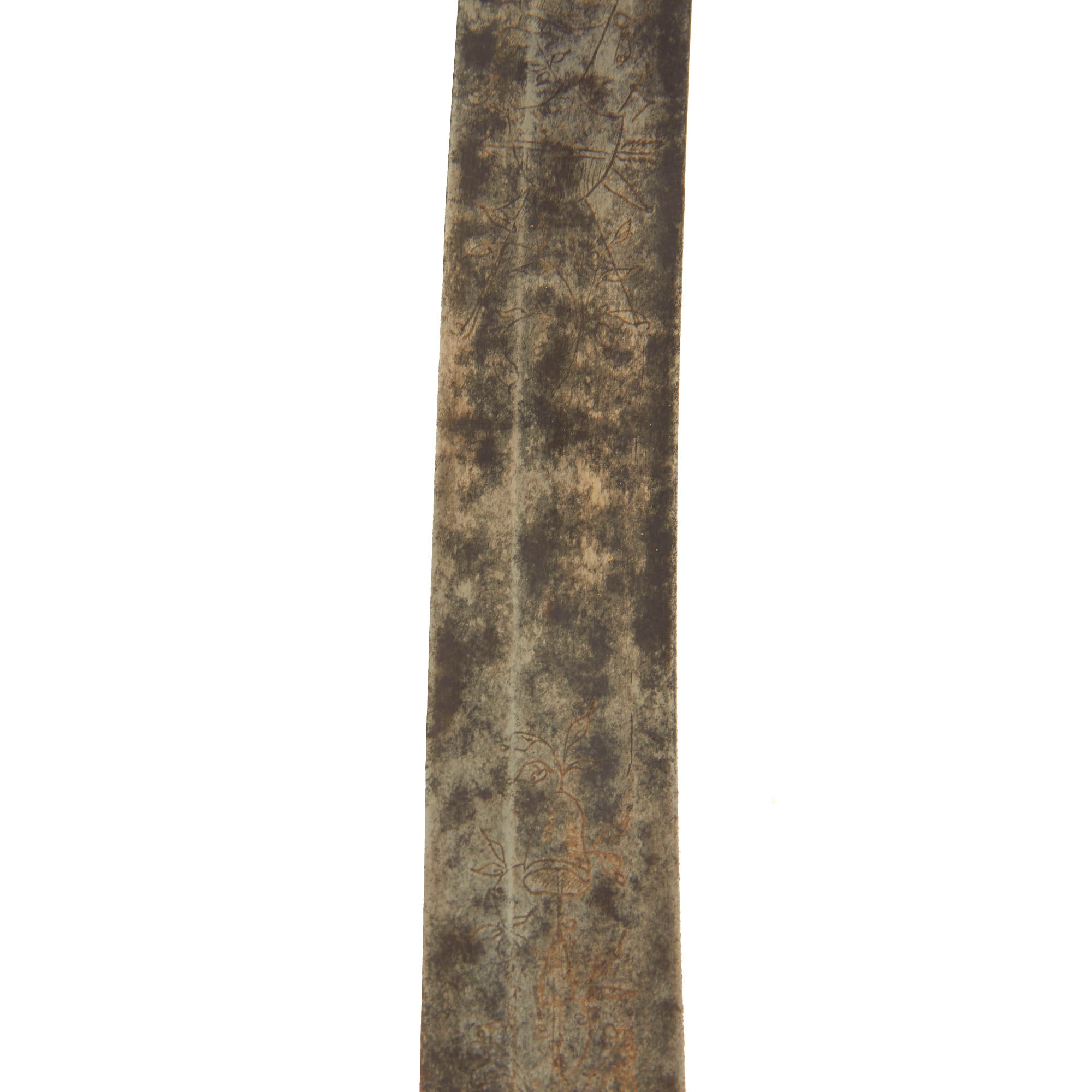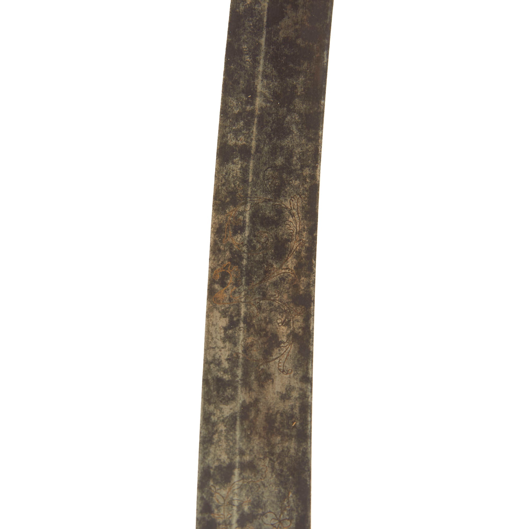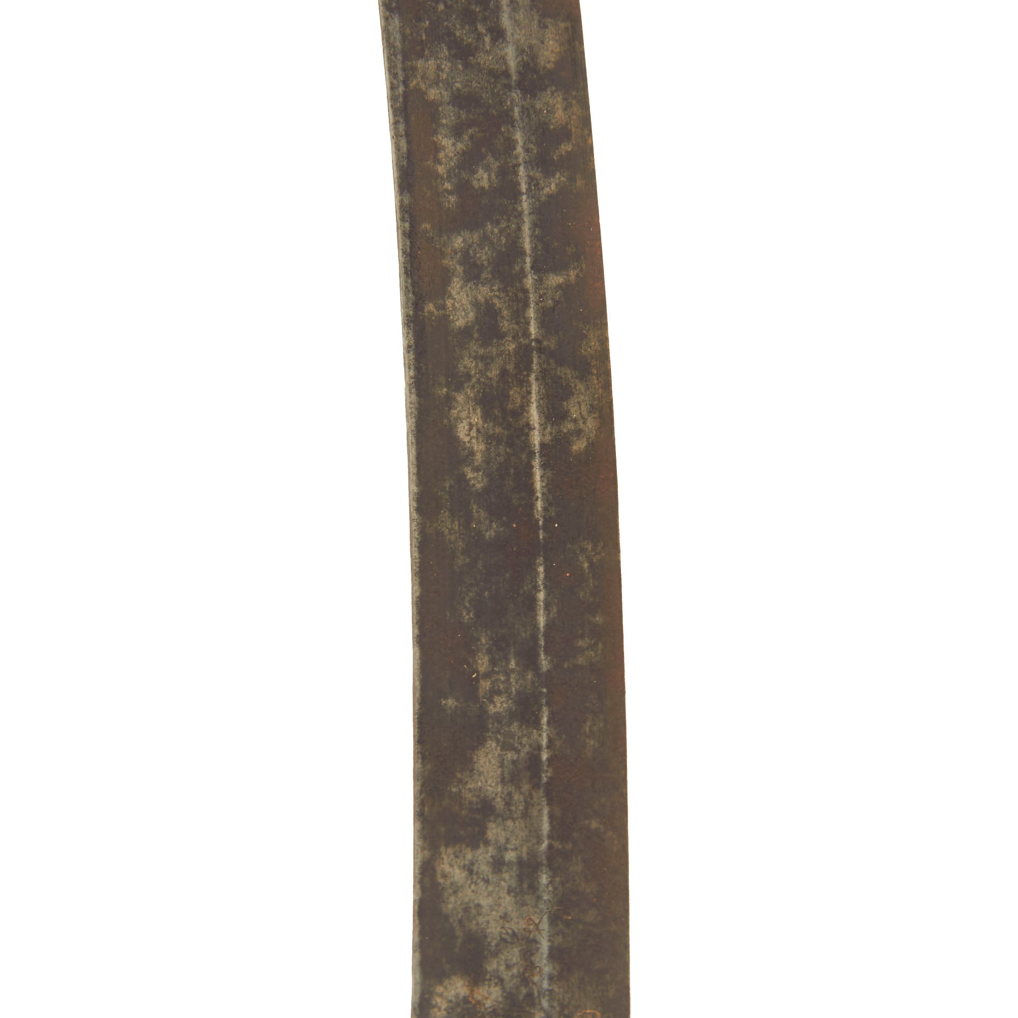 Overall it is 33 inches long, with a 28 inch long engraved single edge curved blade. Each side has a fuller towards the spine, with some light engraving on the first 1/3 of the blade. The old inlay is still visible in places, with a large section where the original "fire blue" finish is still present. There is also some light staining and surface pitting on the last half of the blade, as well as near the cross guard, but nothing major.