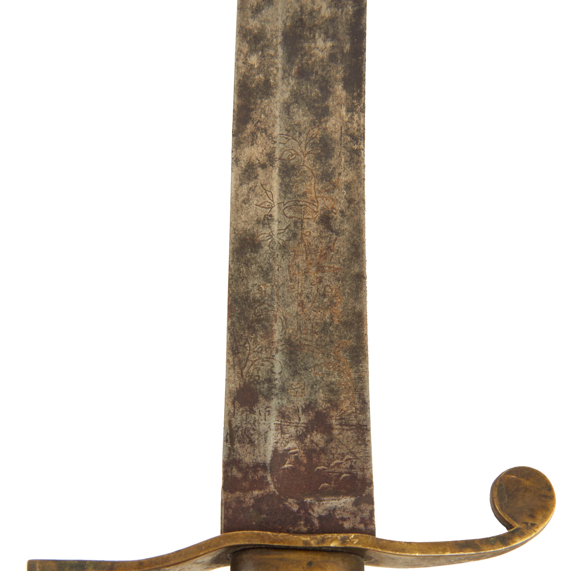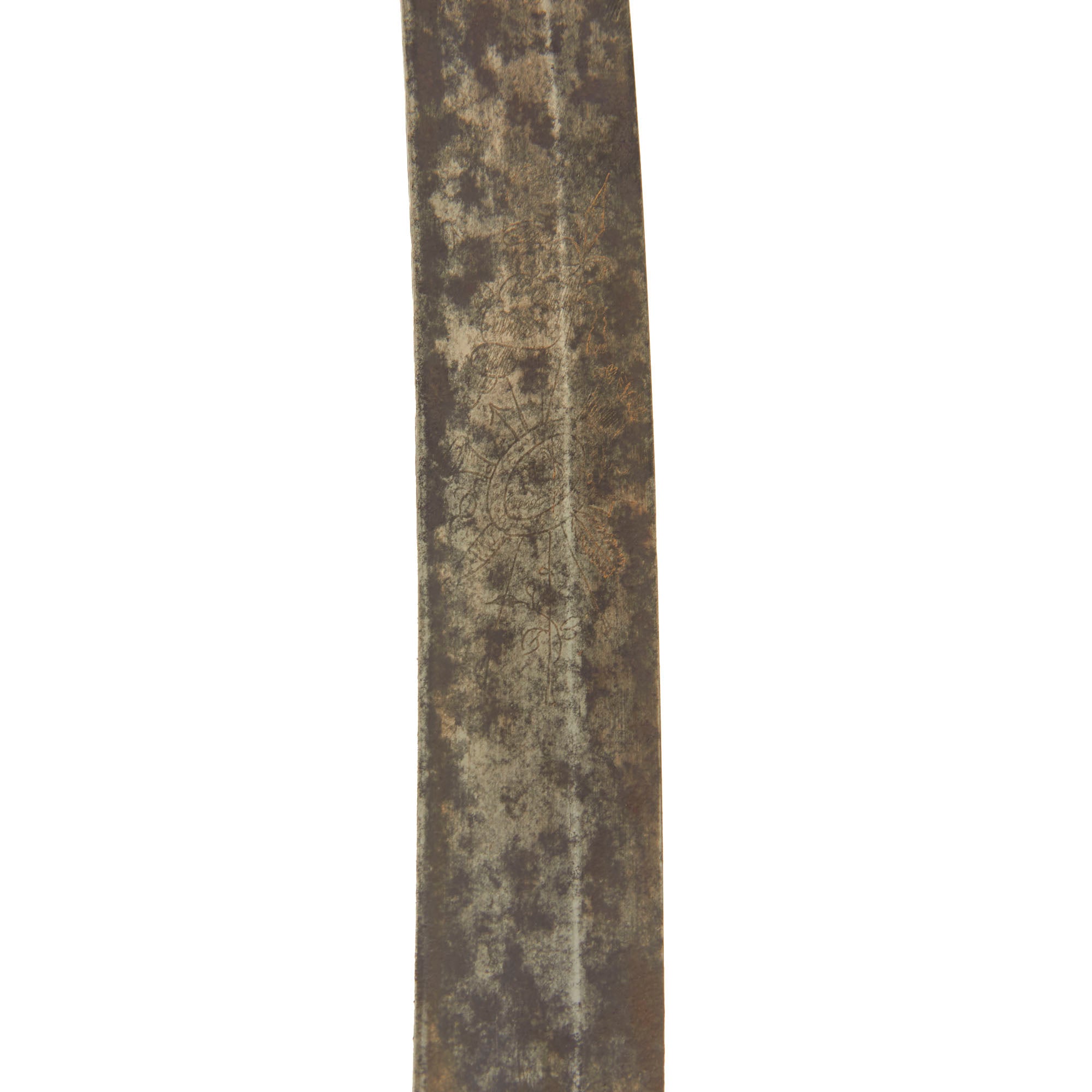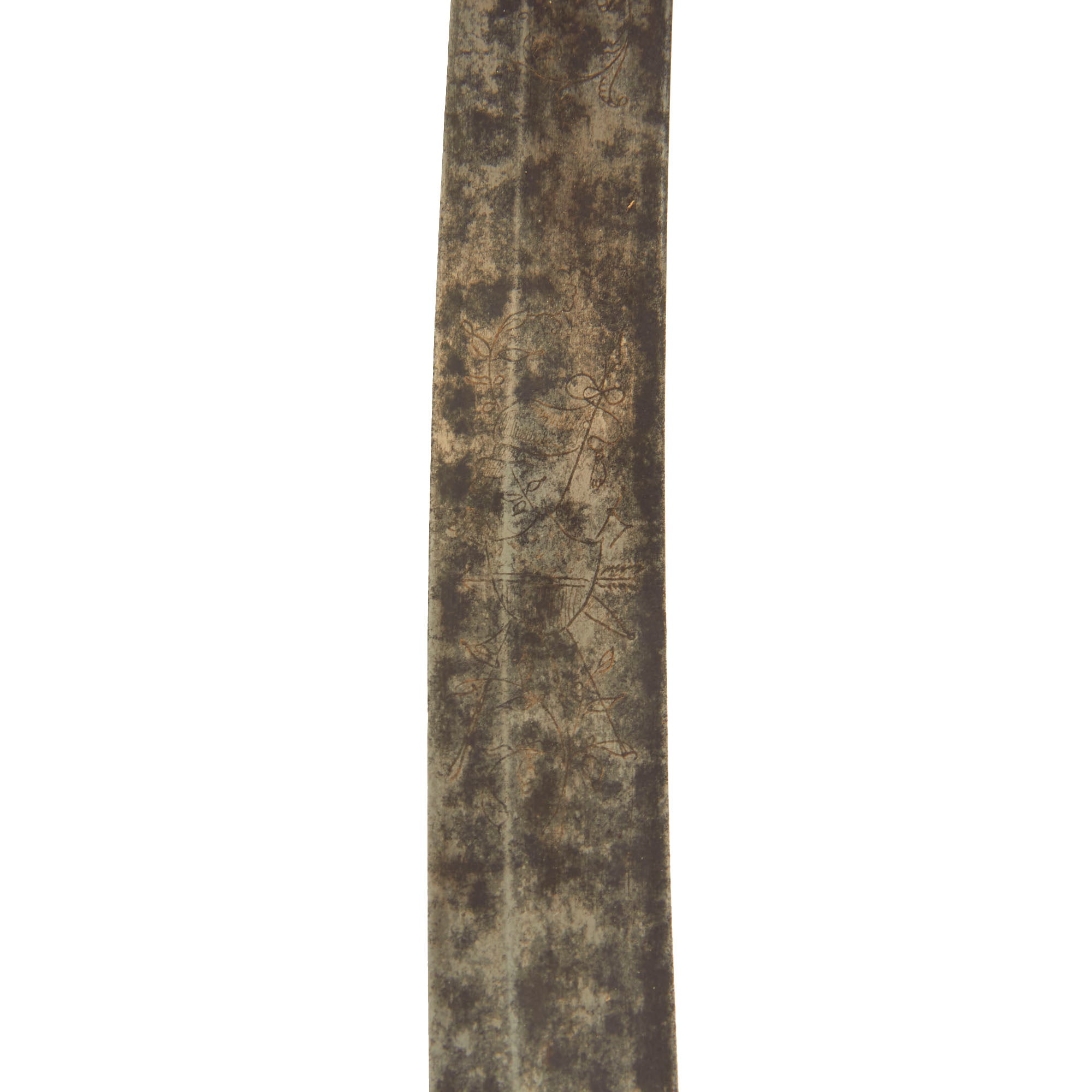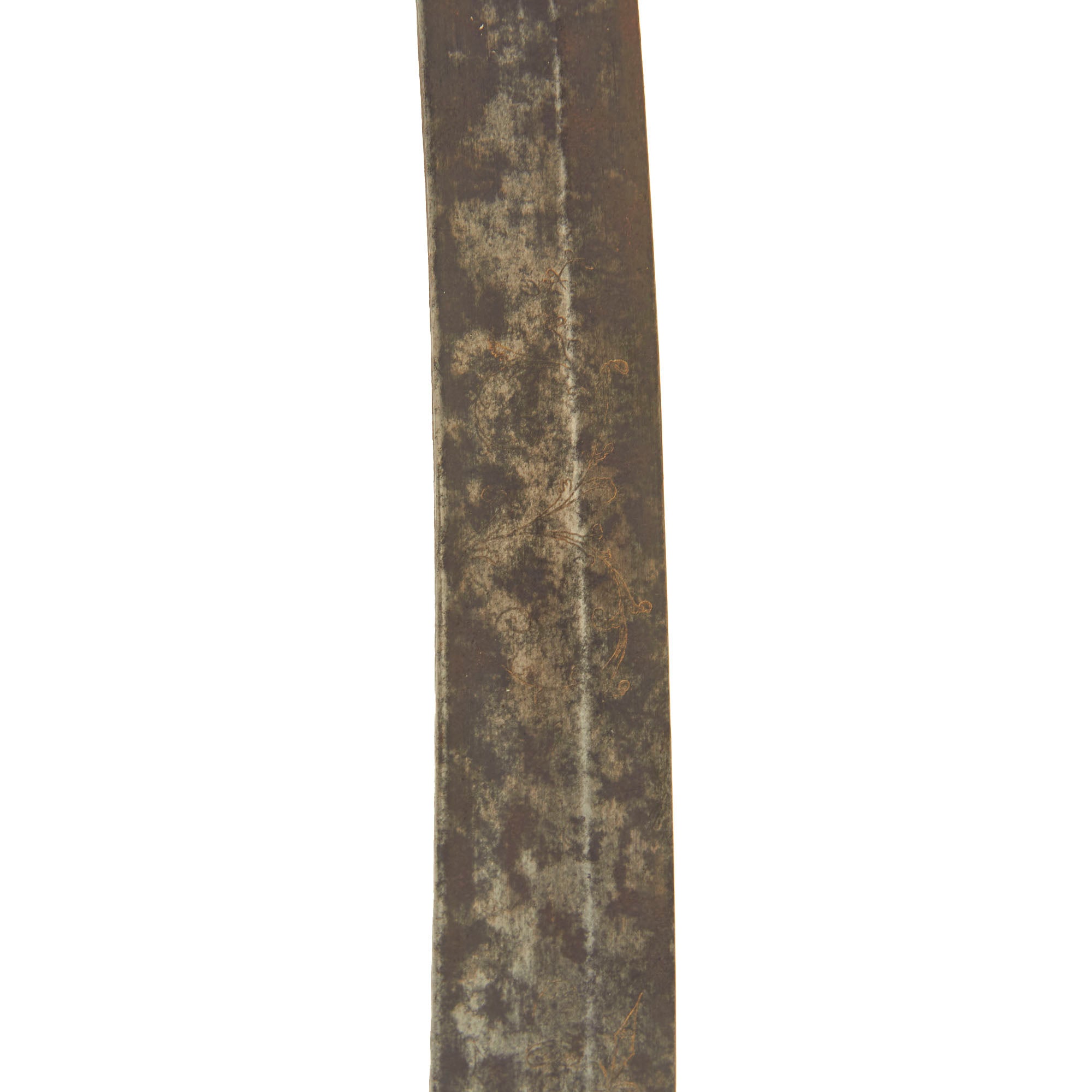 Overall it is 33 inches long, with a 28 inch long engraved single edge curved blade. Each side has a fuller towards the spine, with some light engraving on the first 1/3 of the blade. The old inlay is still visible in places, with a large section where the original "fire blue" finish is still present. There is also some light staining and surface pitting on the last half of the blade, as well as near the cross guard, but nothing major.