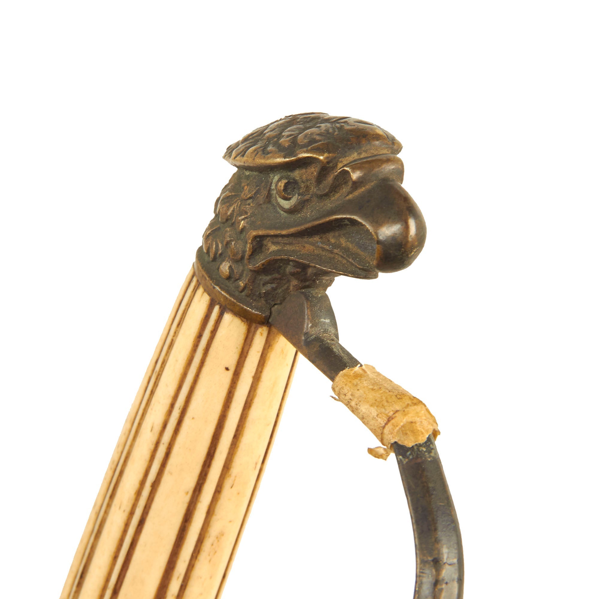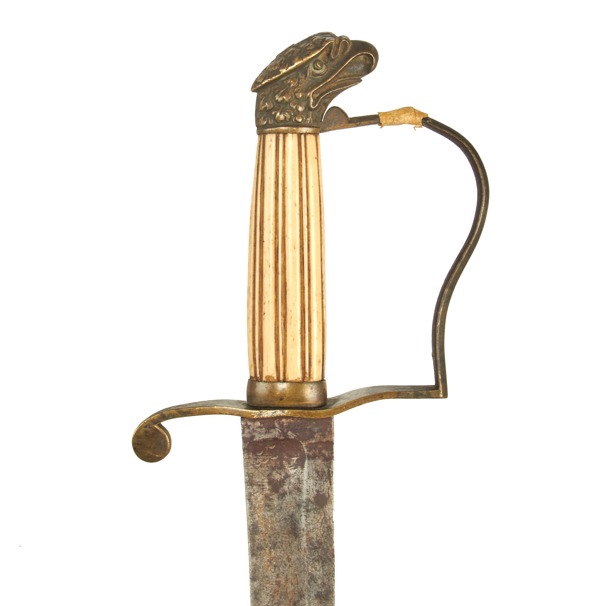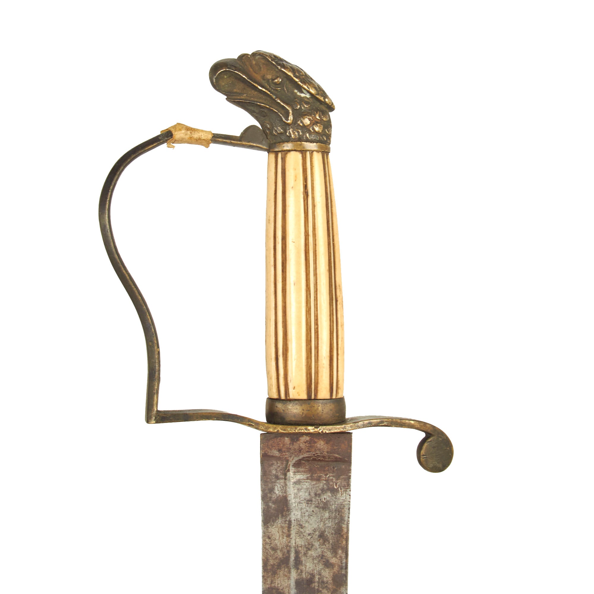 Here we have a very smart looking, original Eagle Headed and ivory gripped U.S. Officer's sword from the 1812 War period or immediate post war era. The sword is all brass mounted with a standard "P" hand guard and a a very nice closed beak Eagle pommel. The grip is fluted ivory or bone, an is still mostly tight to the tang, though there is a small chip near the ferrule and play is present. The hand guard is also very loose, and the original gilding on the brass is present but mostly gone. Unfortunately there is a break in the hand guard close to the pommel, which someone in the past has taped over.