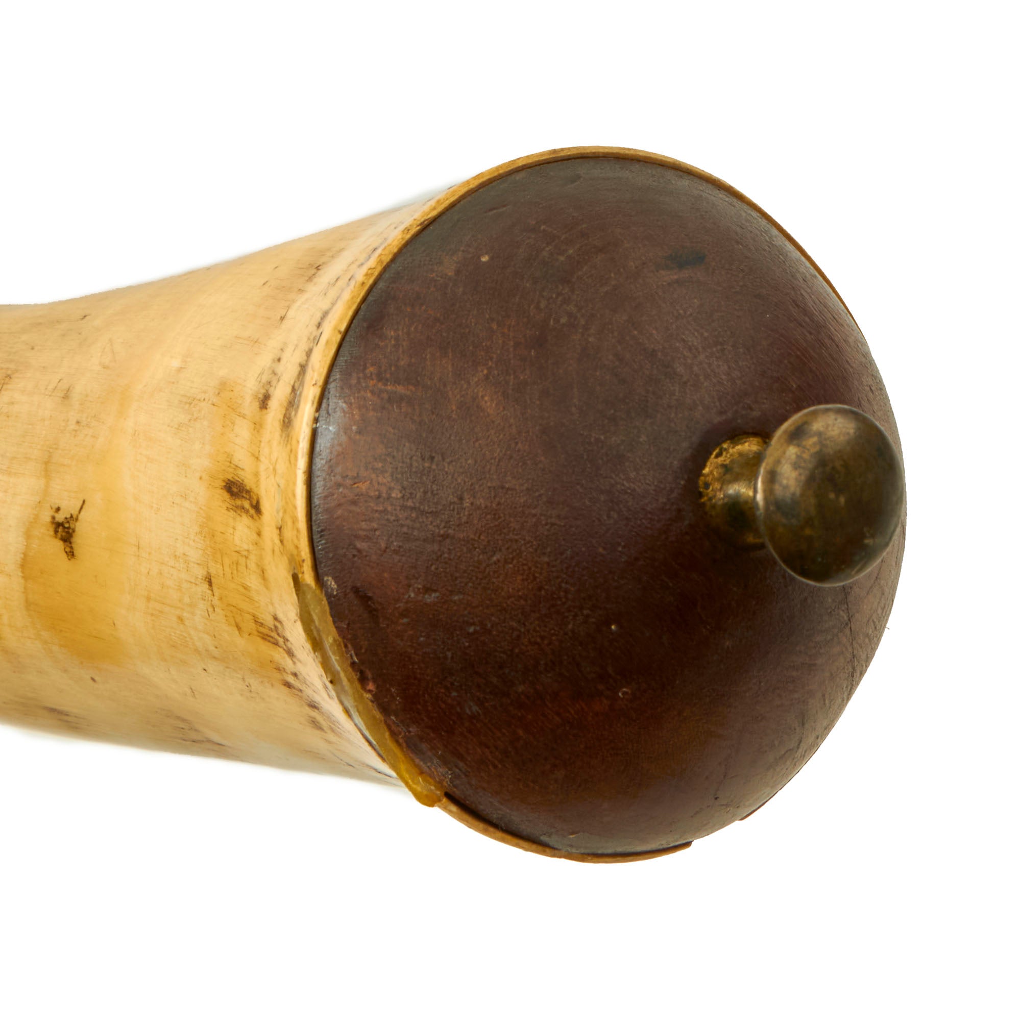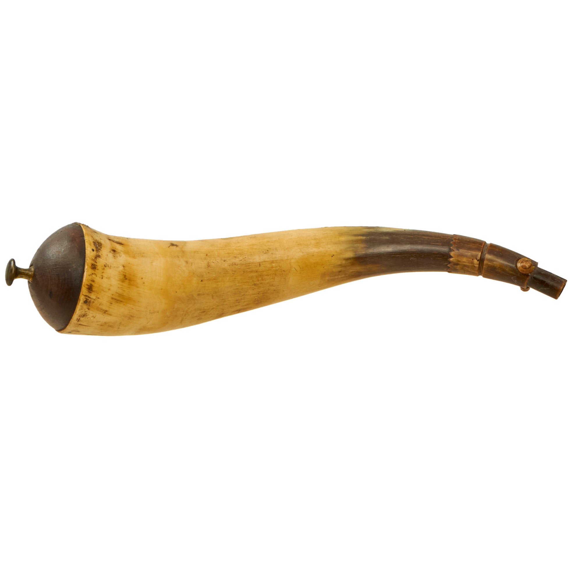 The horn measures roughly 14” long, and has a rounded wooden bottom plate with a brass knob at the end for attachment of a carrying strap. The other end of this strap likely would have attached to the groove on the spout. Below this groove is a lovely zig-zag pattern carving.
