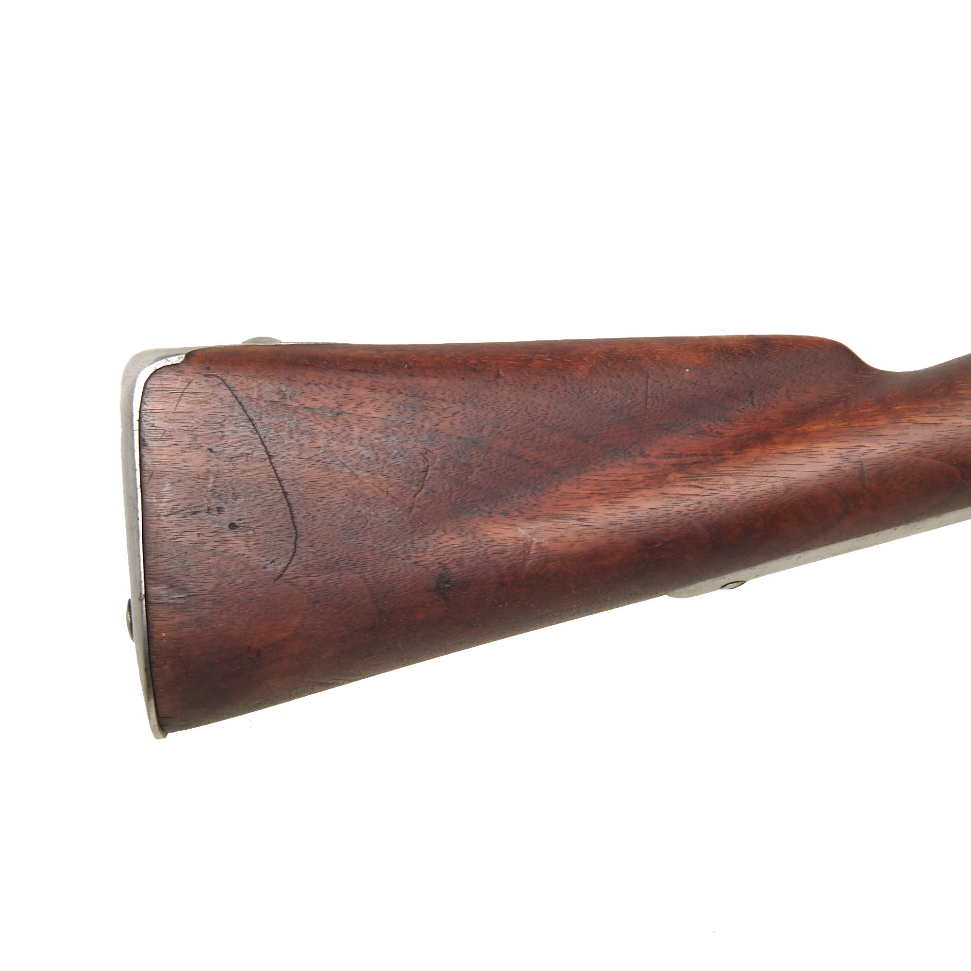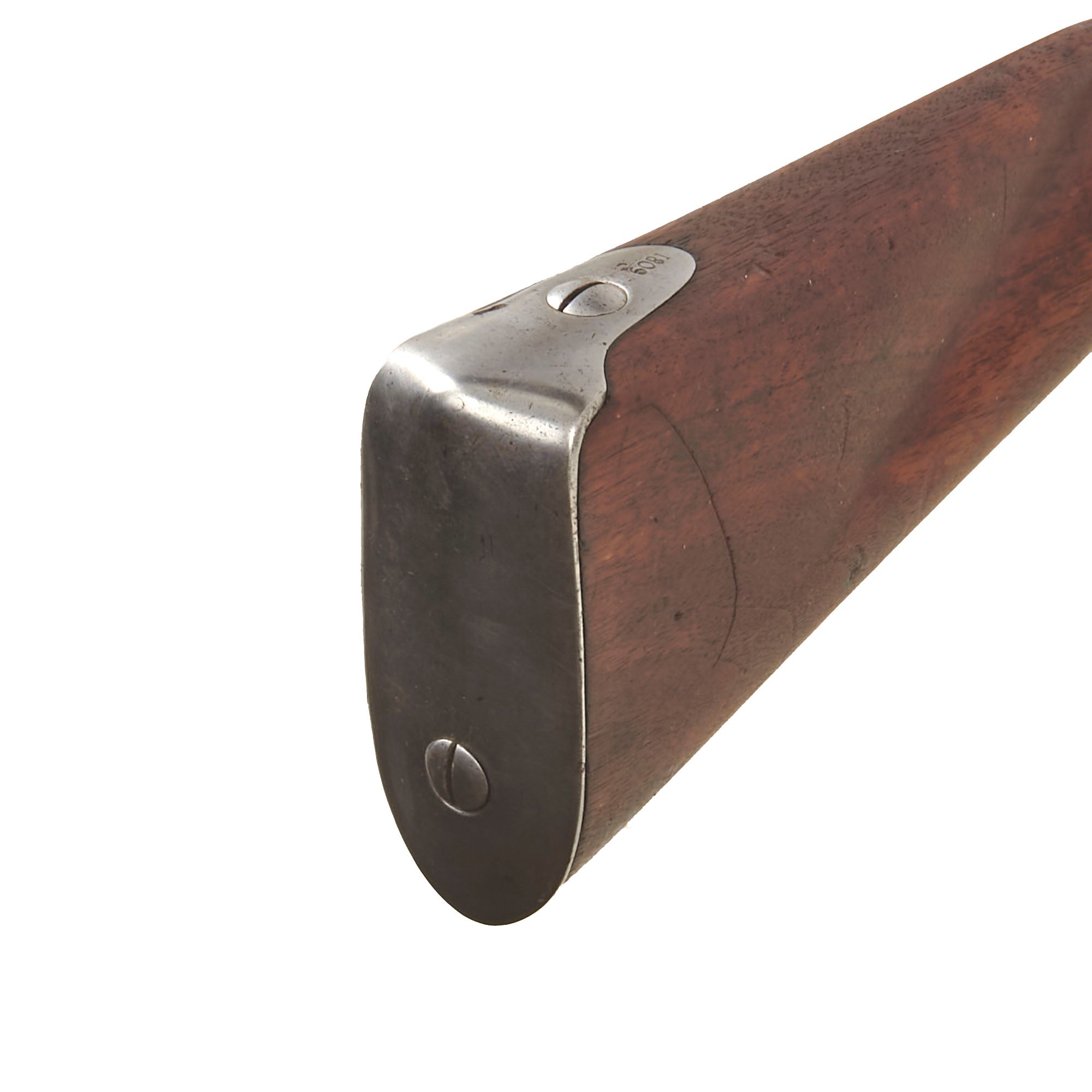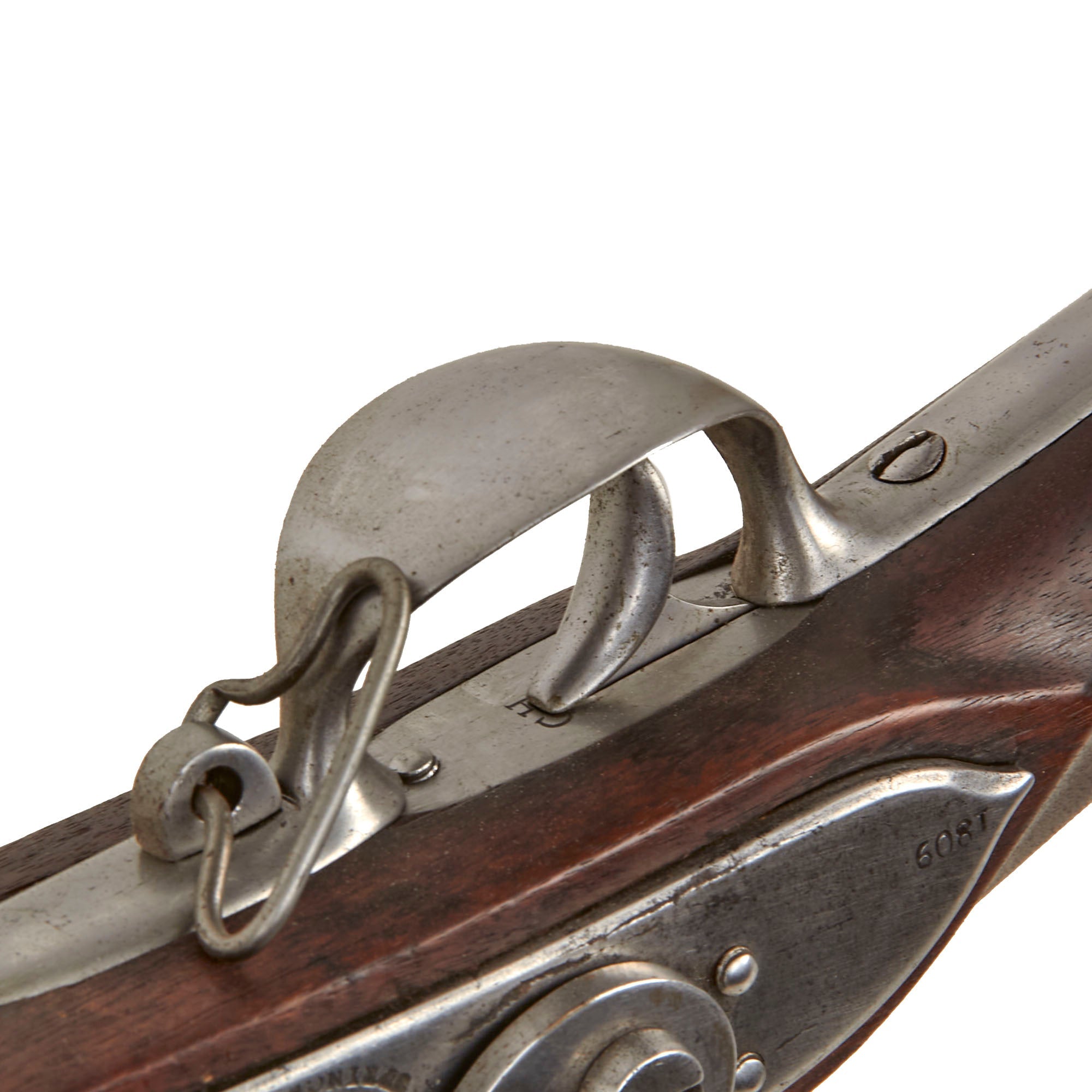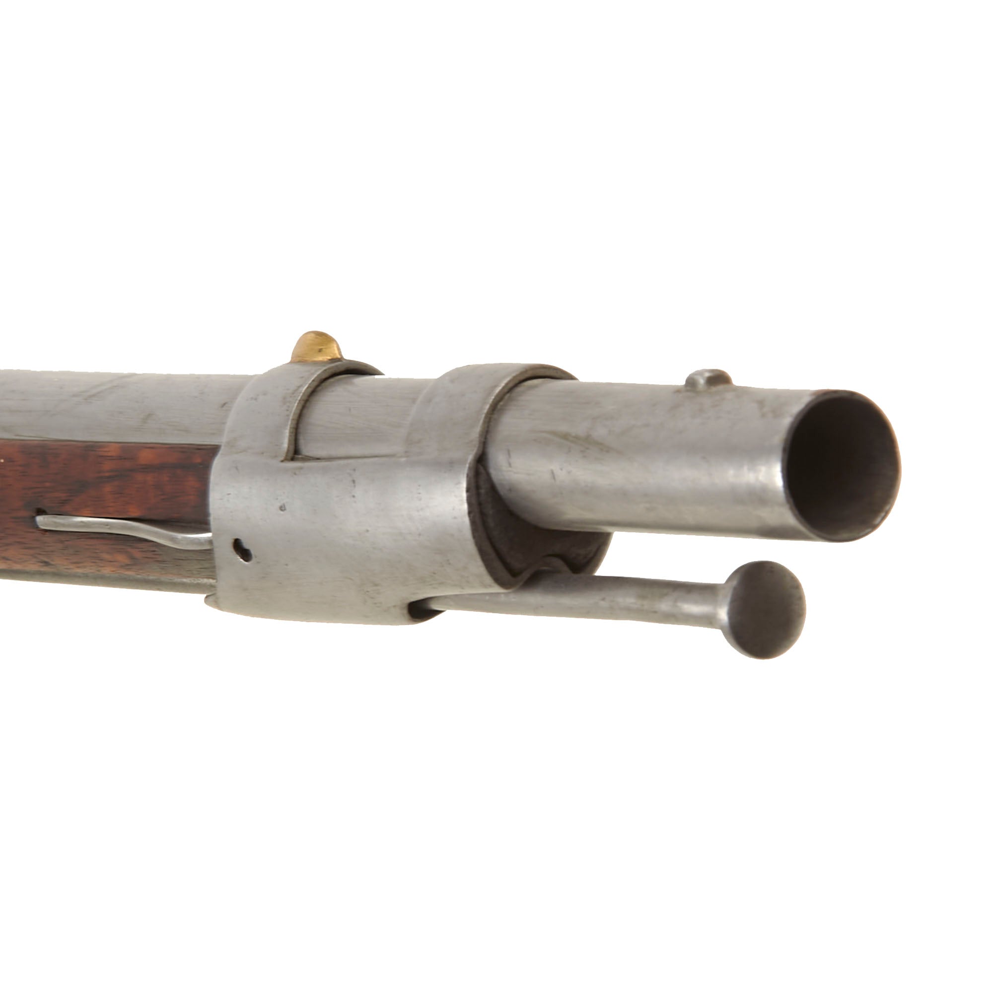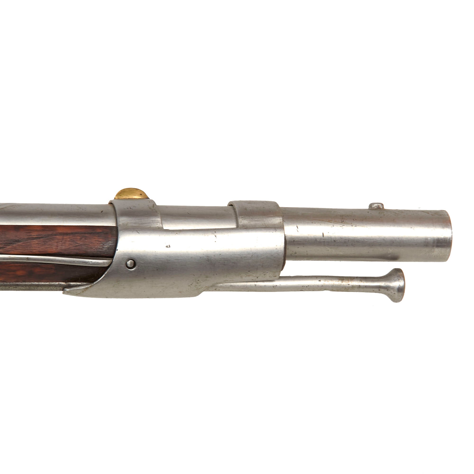 The musket is in very nice service used condition, having been cleaned and polished over the years, so the metalwork is now mostly bright steel. The metalwork and stock both show wear commensurate with long service. The lock functions, however the tumbler is in need of an adjustment, as it will fire on both half and full cock positions. We checked the bore, and it is clear, showing dirt and fouling, as well as a bit of corrosion. It also now measures out to about 0.73" at the muzzle, so it definitely has seen use. The musket still has both sling swivels, as well as the original ramrod present.