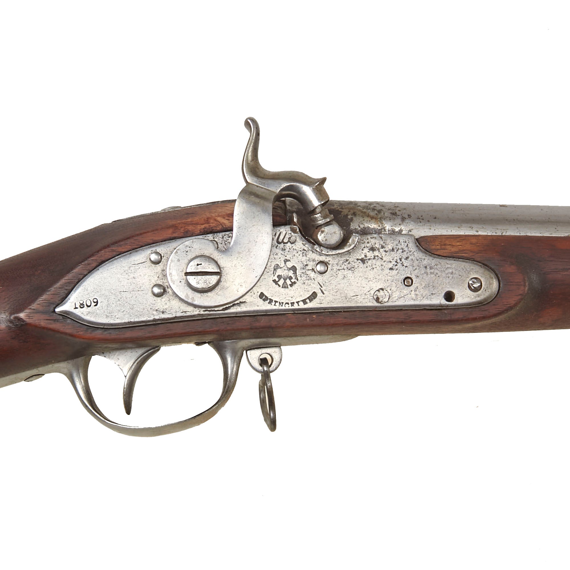 Later on, many U.S. Flintlock muskets were converted to Percussion, both at local and national level, as it was a far more reliable ignition system, which also took less time to load. Here we offer a remarkable U.S. M-1795 .69 Caliber Percussion Converted Infantry Musket marked SPRINGFIELD on the Lock Plate in an arc under a Federal Eagle, with a script US at the top. Many of these were contract made, but this example was made at the United States Armory and Arsenal at Springfield itself, located in Springfield Massachusetts. There is some wear and past oxidation to the lock plate, however it still shows a clear 1809 date on the lock plate tail.
