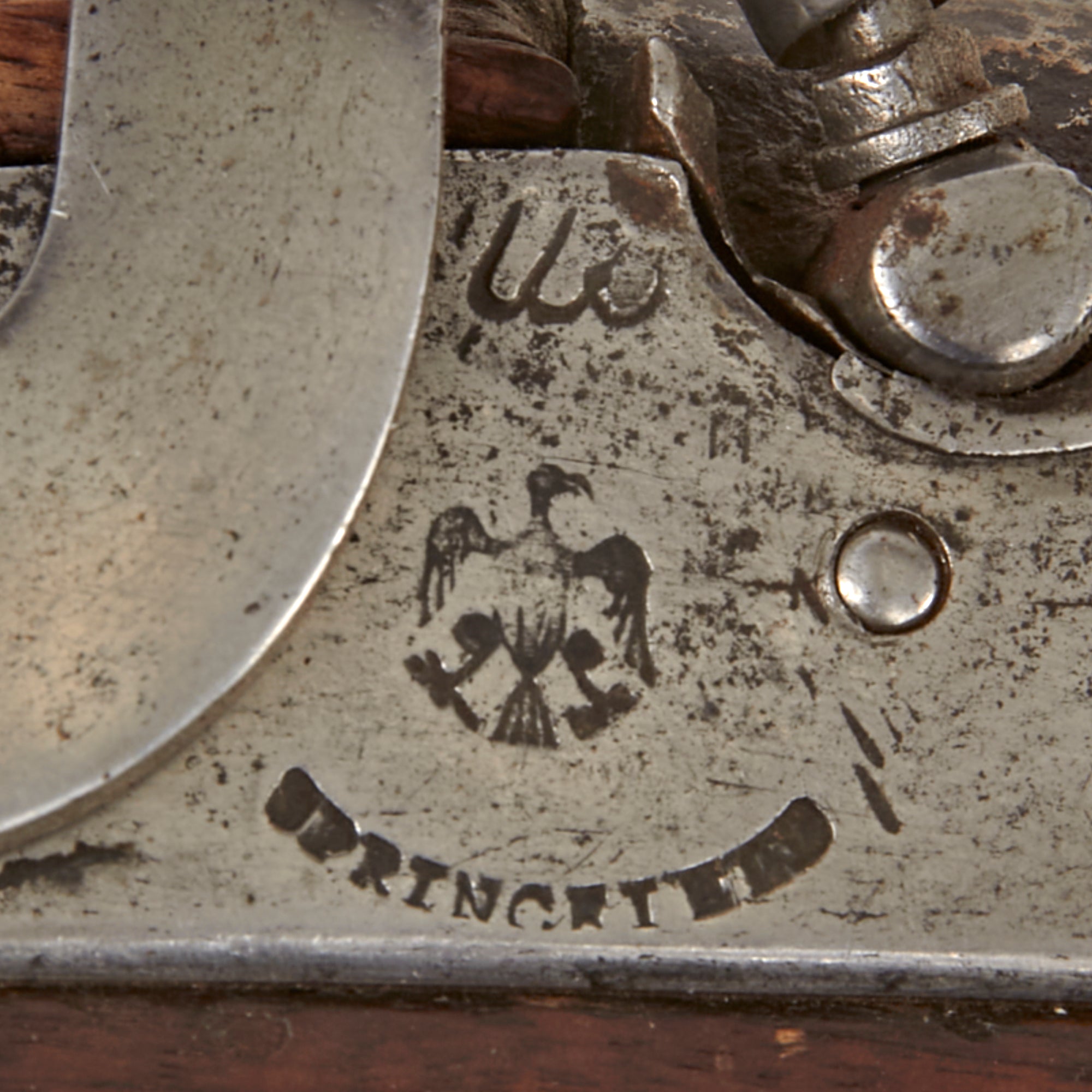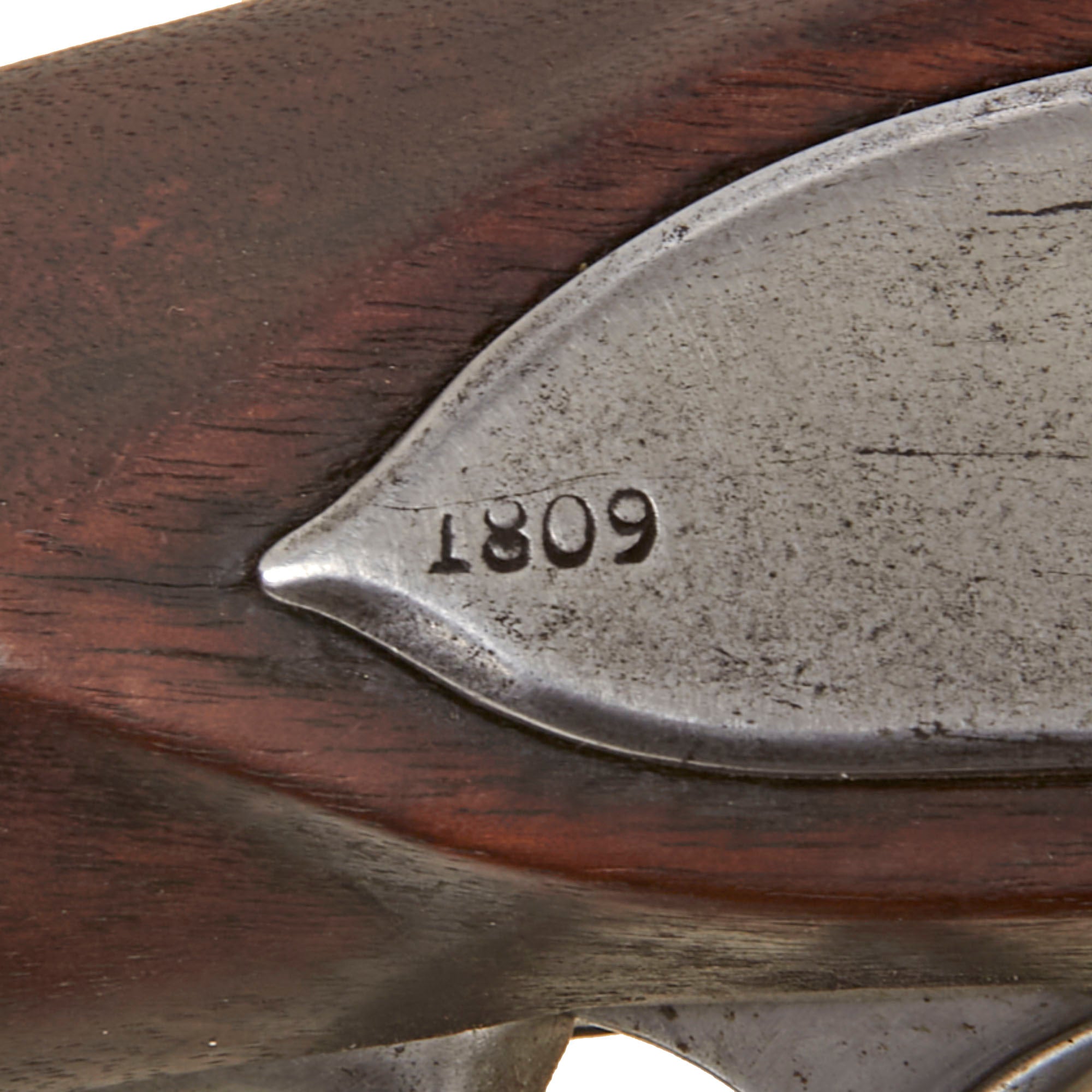 The barrel length is 44 7/8 inches, which is a bit different from the later models. There was no official specification of barrel length for the model 1795, so the lengths varied from roughly 42 to 45 inches. As is correct there is no rear sight, with a brass front side on the nose cap / muzzle fitting, and a bayonet stud on the top front of the barrel. The barrel breech has the correct proof marks of P over an Eagle's Head over V on the left side of the barrel. These markings had been introduced in 1799, replacing the earlier "Liberty Cap" marking. We also see what looks to be "U S" and SNY, which would suggest the musket was sent to the State of New York. There is no date on the barrel breech, however there is another 1809 date on the butt plate.