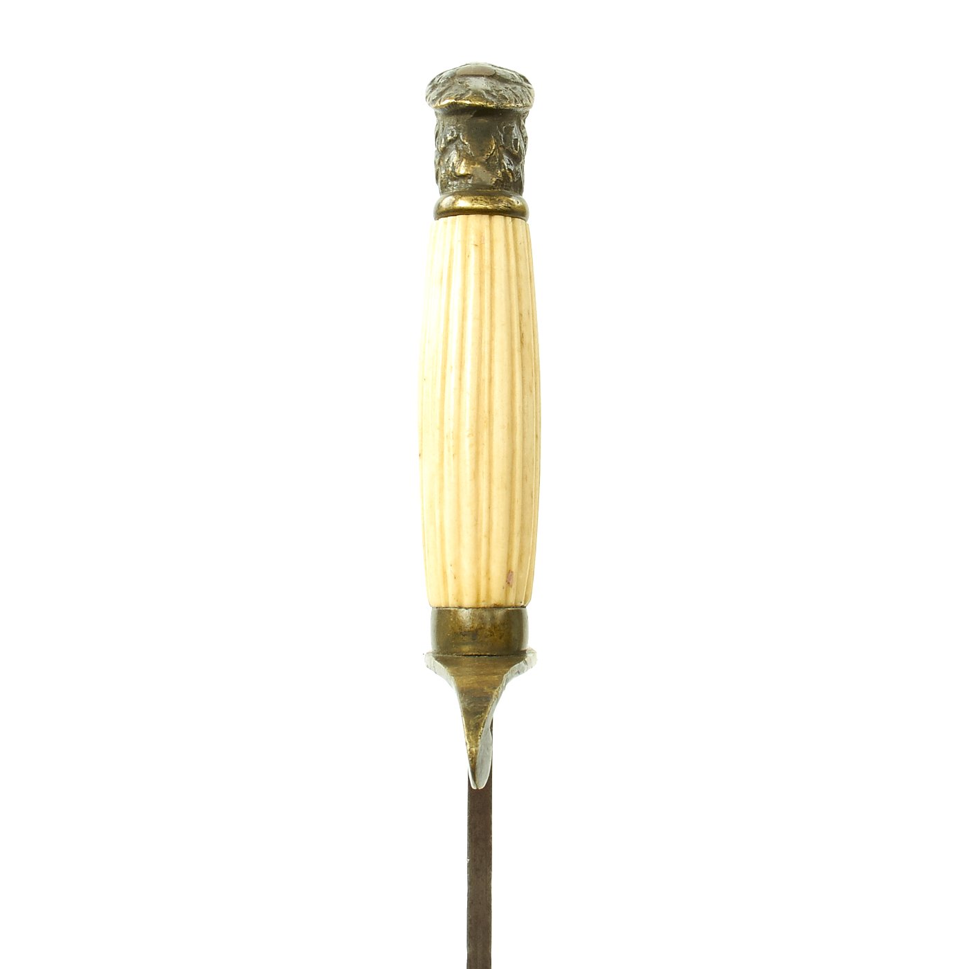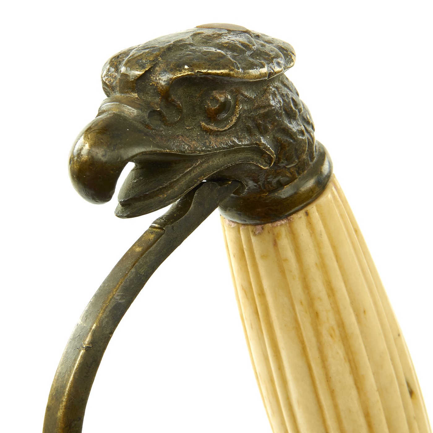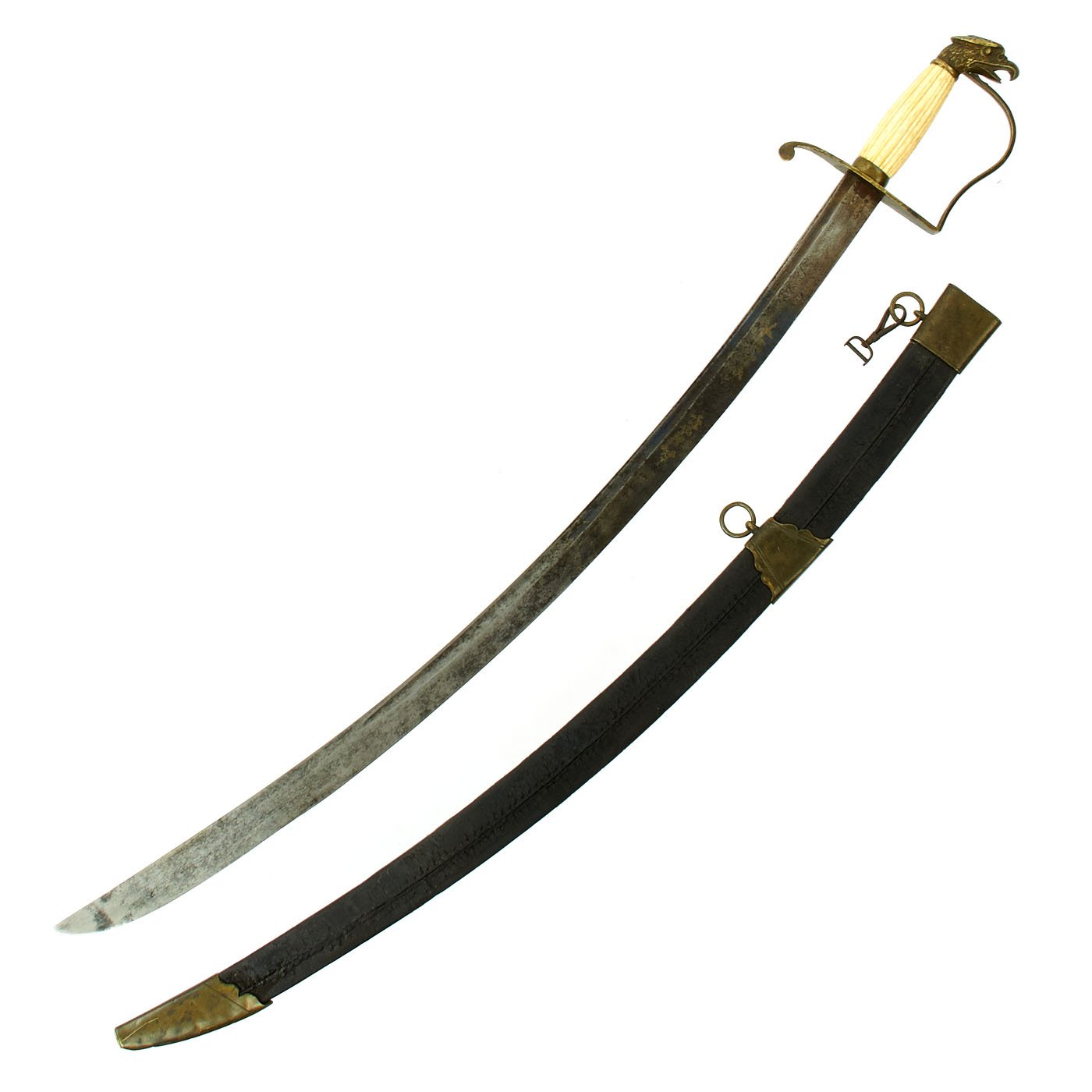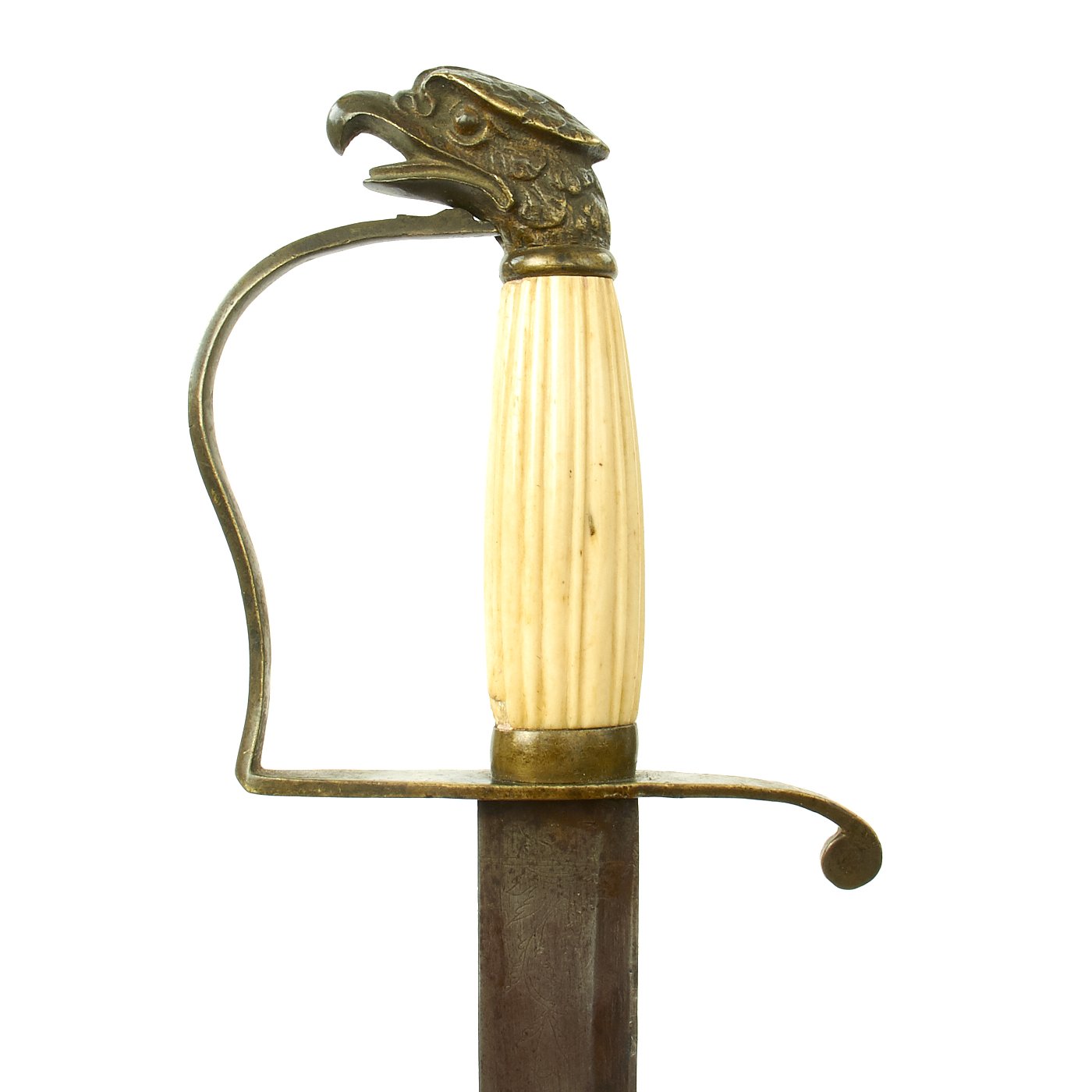 Here we have a very smart original Eagle Headed and ivory gripped U.S. Officer's sword from the 1812 War period. The sword is all brass mounted with a standard "P" hand guard and a a very nice "open with tongue" Eagle pommel. The grip is fluted ivory or bone, an is still tight to the tang, though there is a small chip near the ferrule. The hand guard is also somewhat loose, and the original gilding on the brass is all but gone.
