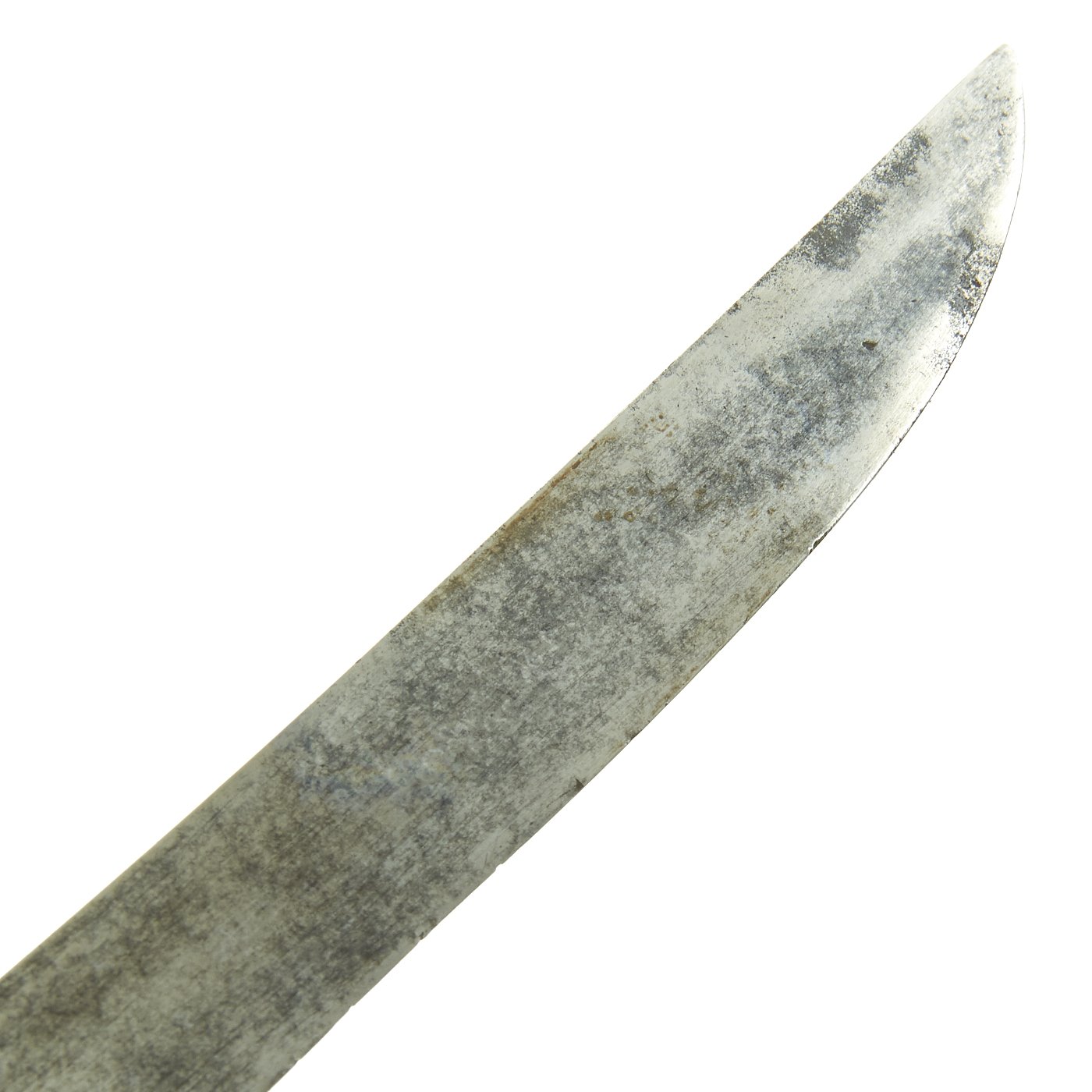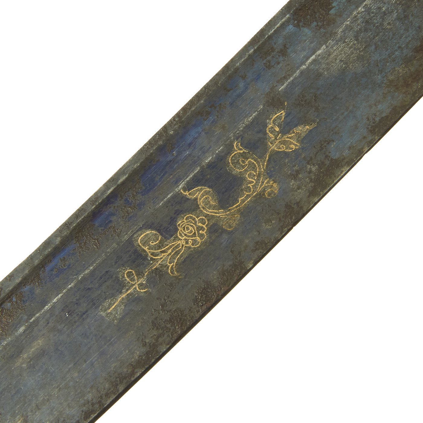 Overall it is 33 inches long, with a 28 inch long engraved single edge curved blade. Each side has a fuller towards the spine, with some light engraving on the first 1/3 of the blade. The old inlay is still visible in places, with a large section where the original "fire blue" finish is still present. There is also some light staining and surface pitting on the last half of the blade, as well as near the cross guard, but nothing major.