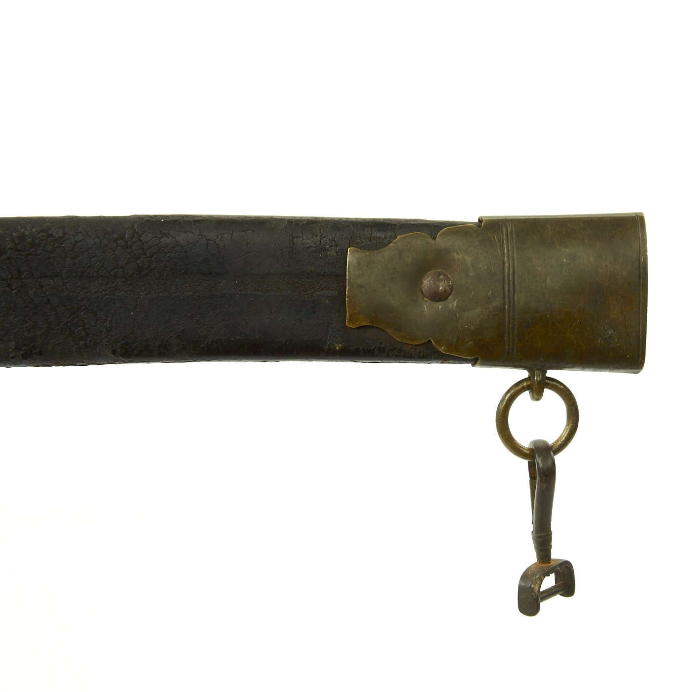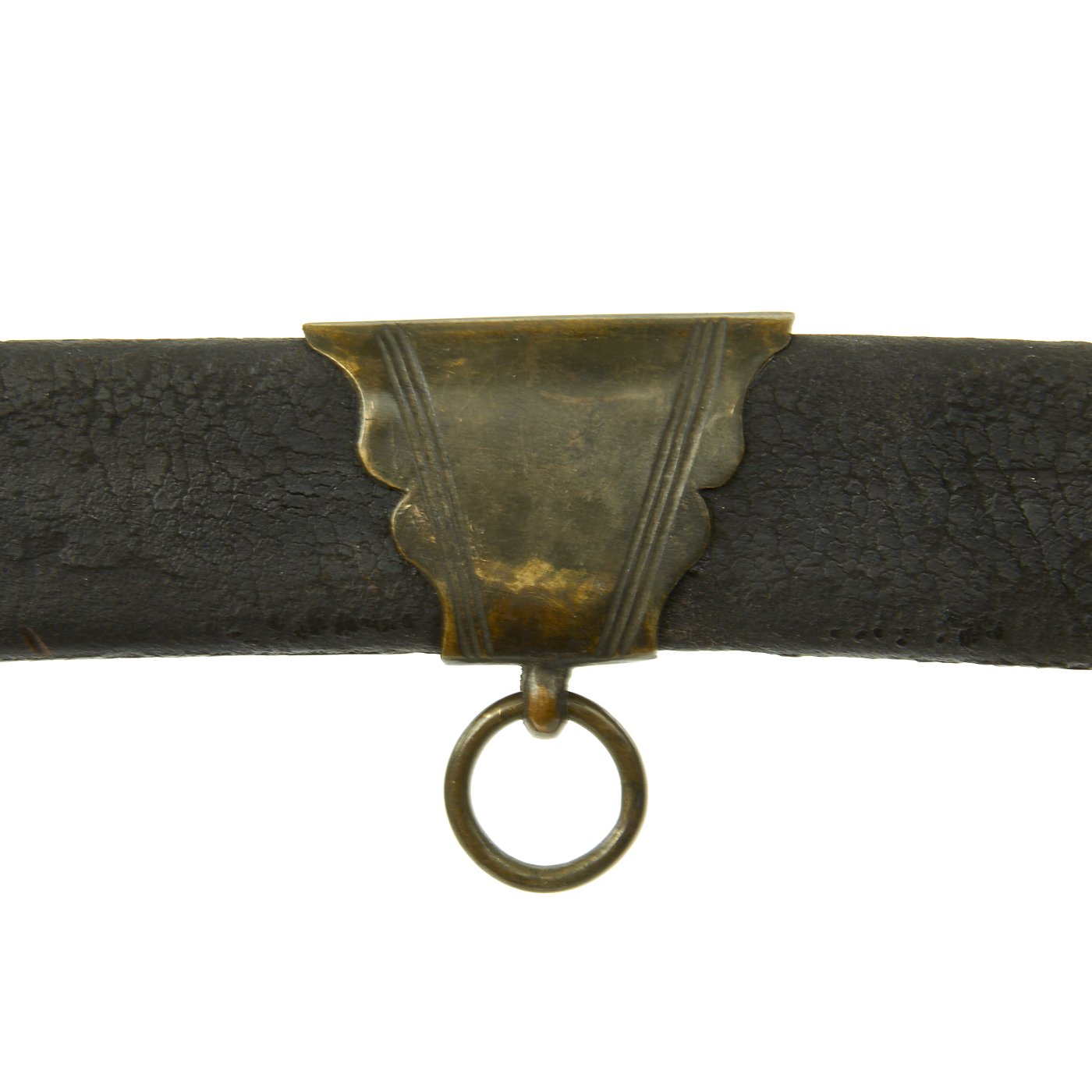 This smart sword comes together with its original brass mounted leather scabbard with two hanging rings, one of which still has the original spring clip attached. Hard to find in this condition especially being complete with its original Scabbard.