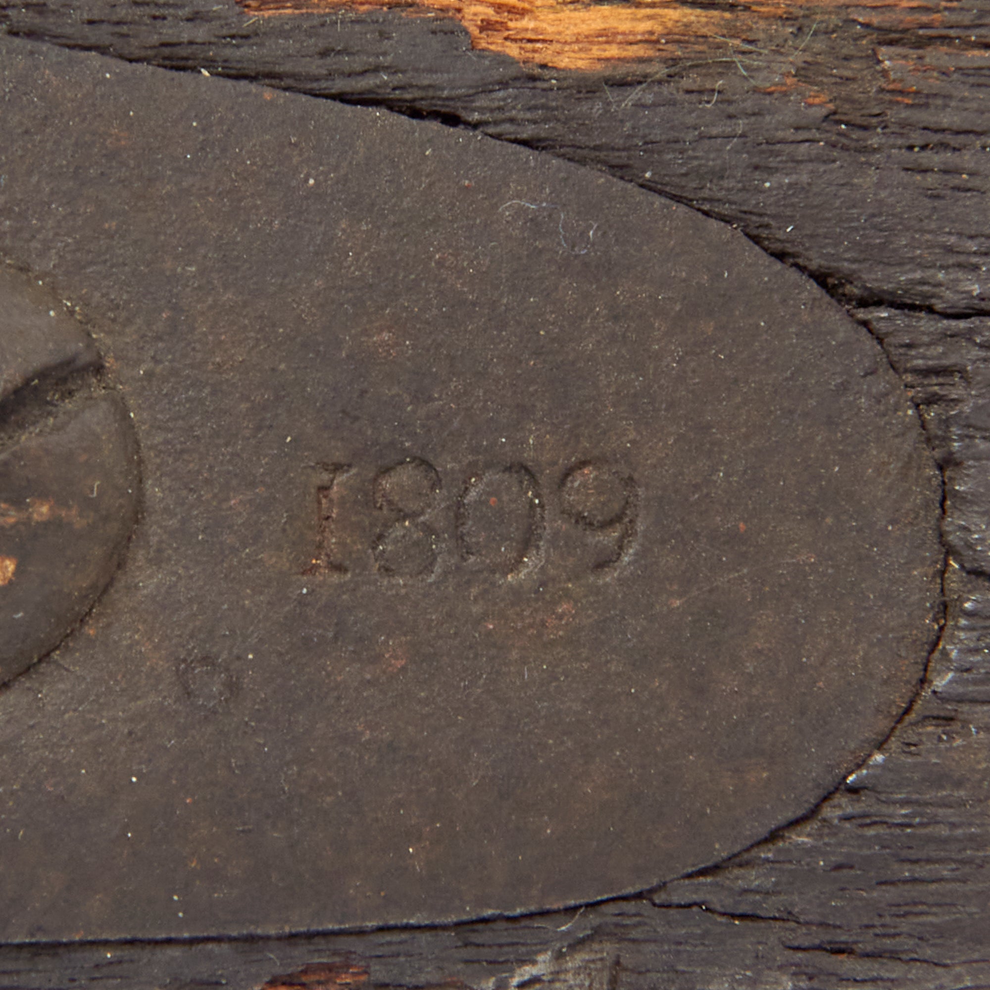 The barrel length is 44 1/2 inches, which is a bit different from the later models. There was no official specification of barrel length for the model 1795, so the lengths varied from roughly 42 to 45 inches. As is correct there is no rear sight, with a brass front sight on the nose cap / muzzle fitting. The barrel breech has the correct proof marks of P over an Eagle's Head over V on the left side of the barrel. These markings had been introduced in 1799, replacing the earlier "Liberty Cap" marking. There is no date on the barrel breech, however there is another 1809 date on the butt plate.