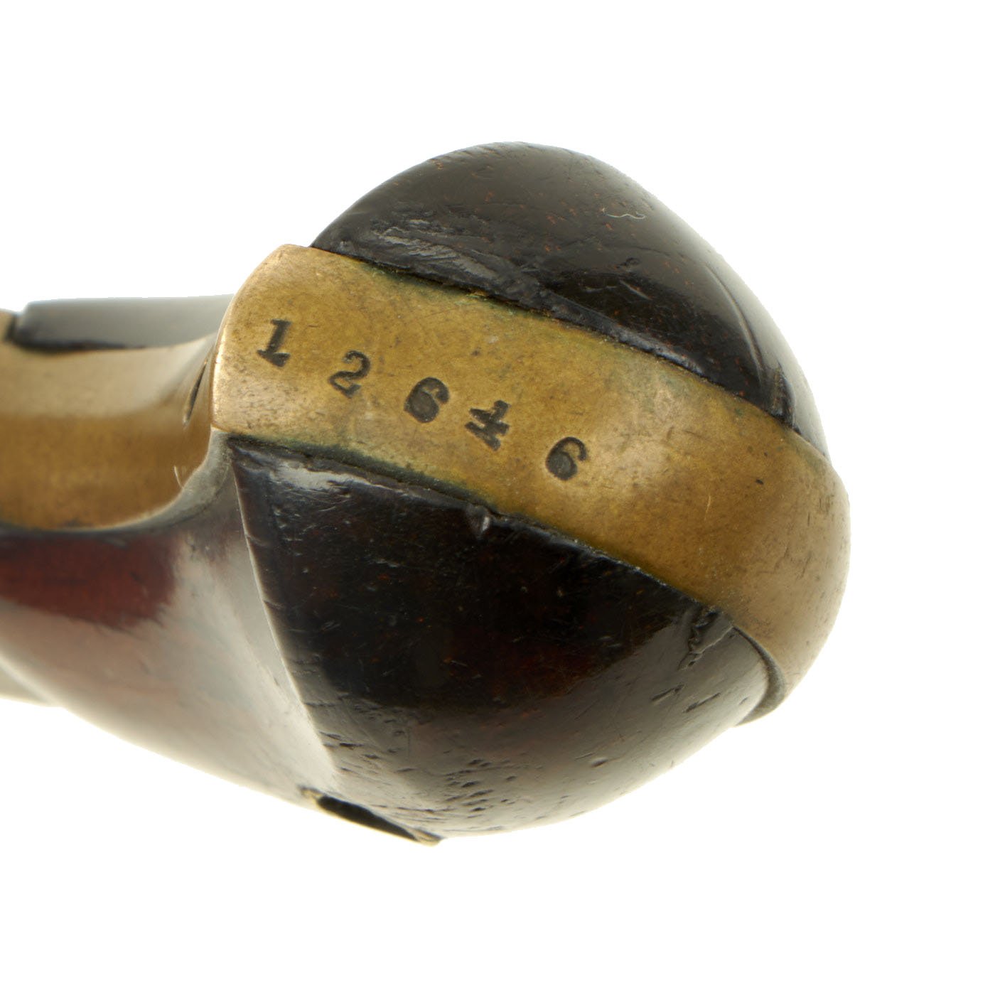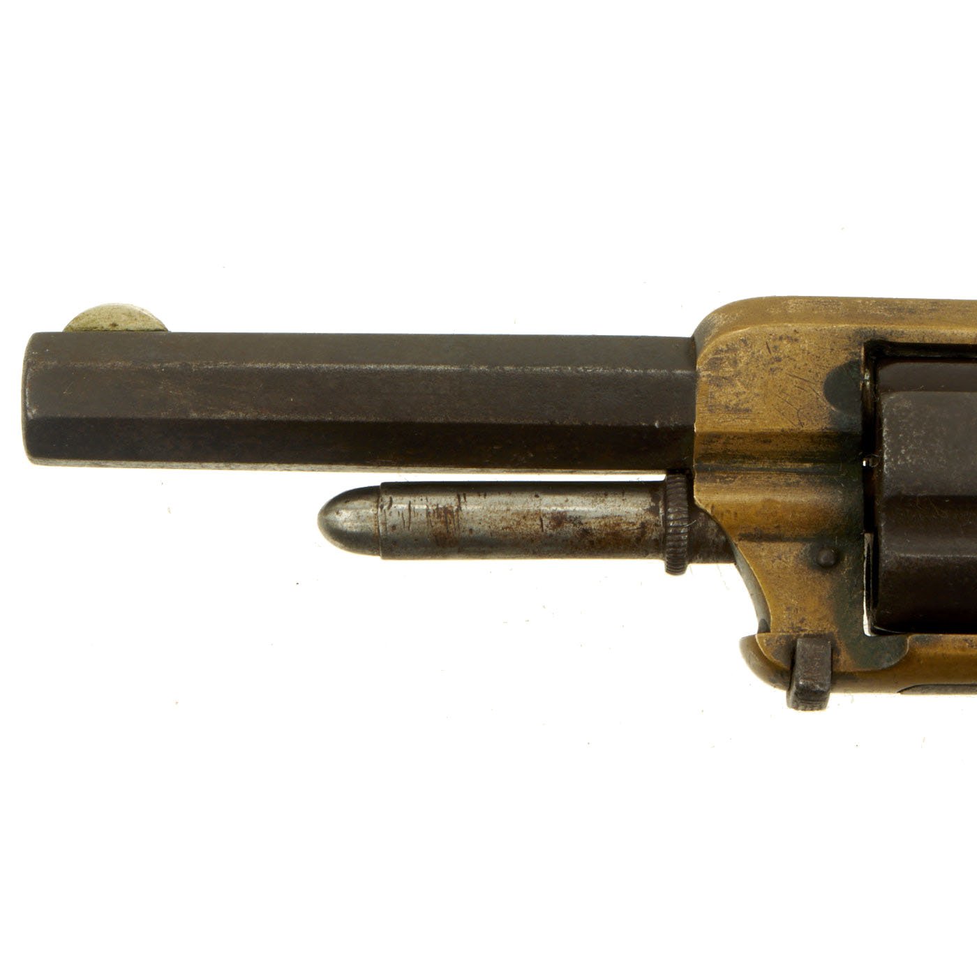 This is a lovely 5 shot .32cal rimfire pistol, made for self protection, and would easily fit in a coat pocket. Whitneyville Armory termed this their No. 1-1/2 model, and with a brass frame and blued steel, it is quite lovely. The revolver is marked with serial number 12646 on the bottom of the grip, with 646 on the cylinder axis pin/ejector, on the bottom of the barrel, and on the rear of the cylinder. This makes this a very nice "All Matching" example!