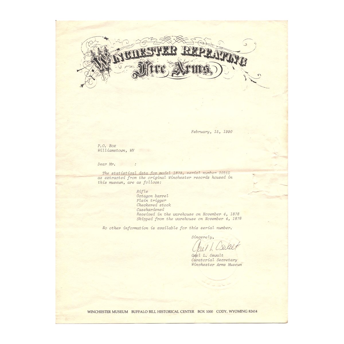 Also included is a letter from Winchester Repeating Fire Arms verifying that this rifle was received in warehouse on November 4, 1878 and shipped the very same day with Octagon barrel, plain trigger, Checkered stock, and Casehardened.