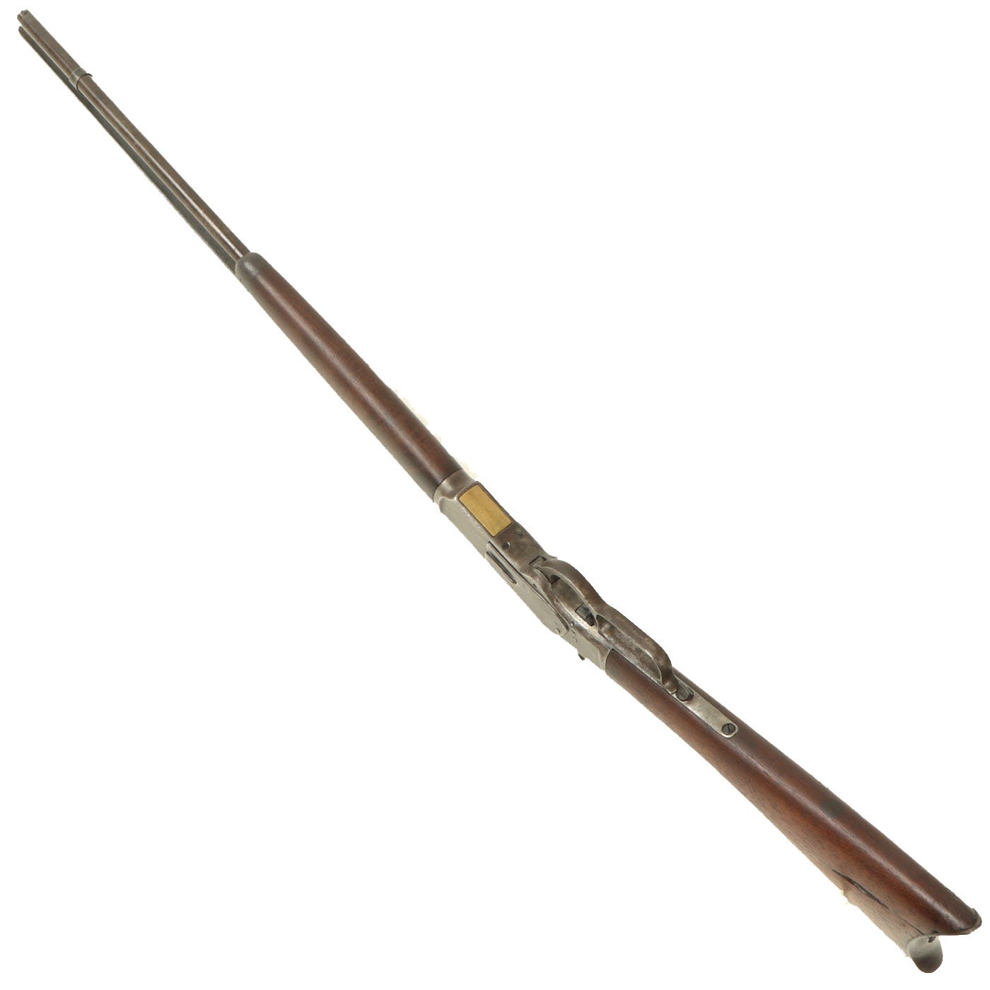Stocks are in good condition, with the lovely red-brown color that only aged oiled walnut has. The fore stock is in very good condition, with only light wear, and a bit of figuring on the rear right side and underside. The butt stock is also quite attractive, but has definitely had some major cracks in the past, which have been expertly repaired. There is also a white metal escutcheon on the top, which is currently blank, but may have had initials on it at one point. The crescent butt plate is in good shape, with a working storage compartment.