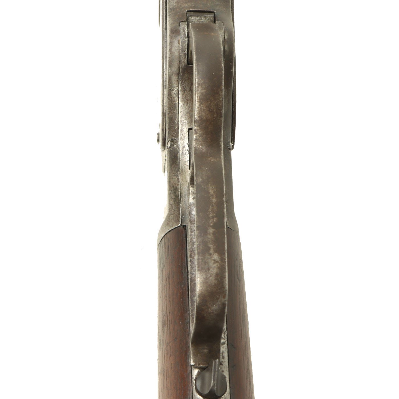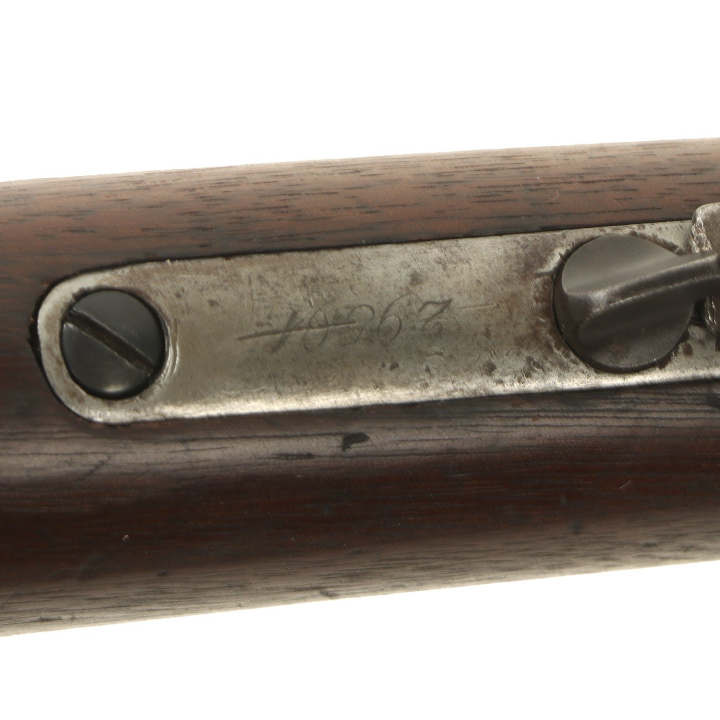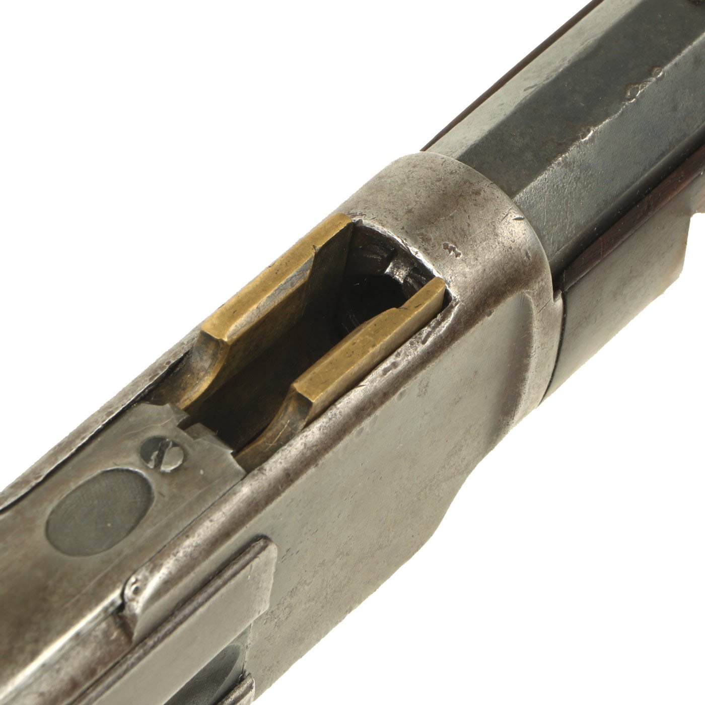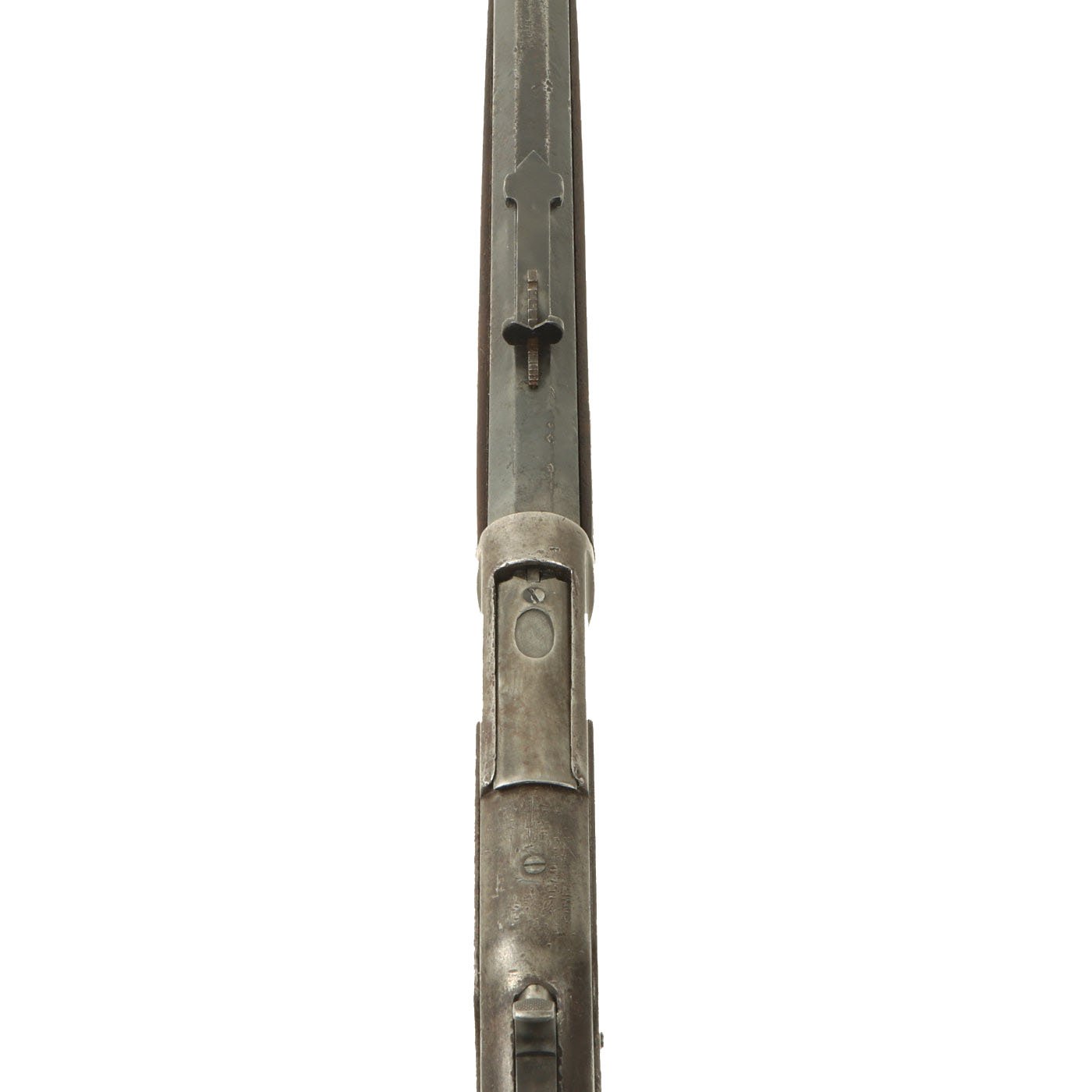 This example has the more desirable 24" octagonal barrel, and a full-length magazine tube. Features the classic front sight and iconic "buckhorn" rear adjustable sight. The serial number is somewhat worn, but can be read: 29591 denoting the year of manufacture as 1879. Another key aspect of the FIRST MODEL was the use of the "thumbprint" style dust cover, included on this example, which was transformed in the subsequent models. This type fits into a dovetail over the ejection port, unlike the later variety, which slides on a dovetail on the rear receiver. It looks like the "print" on this cover has mostly worn away.