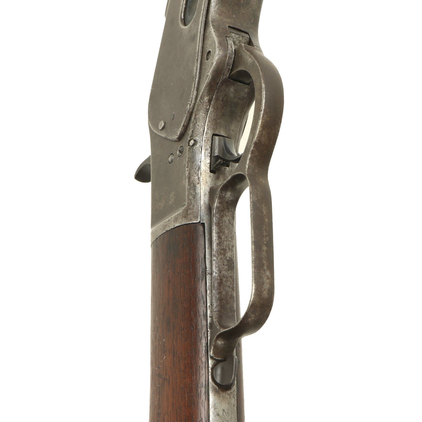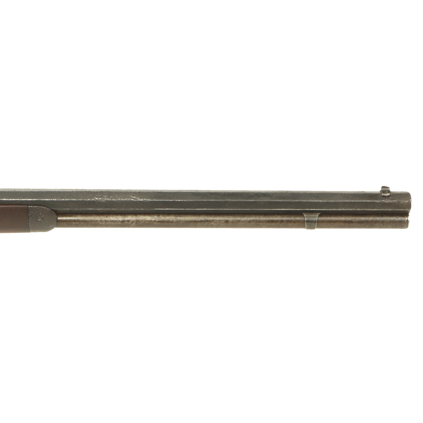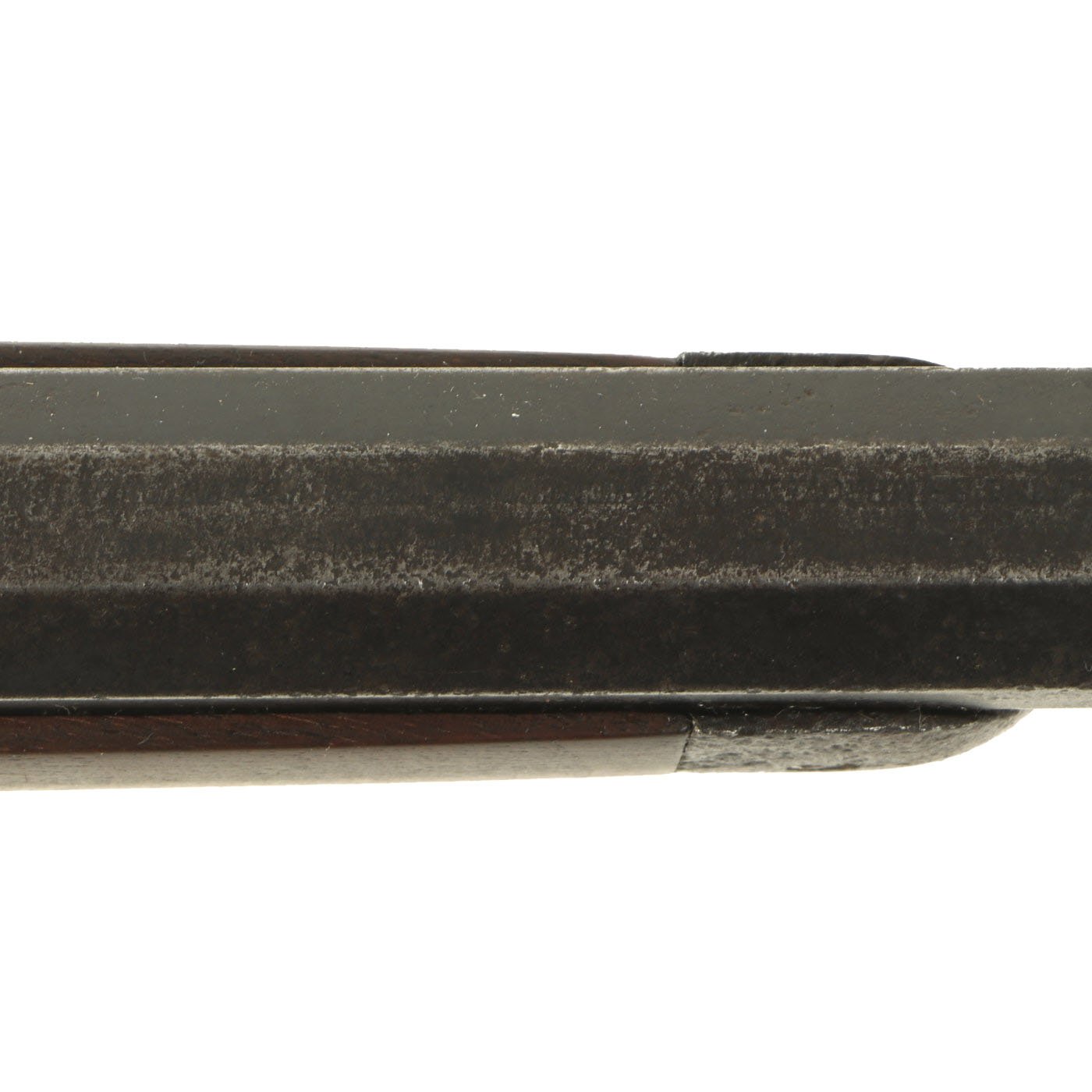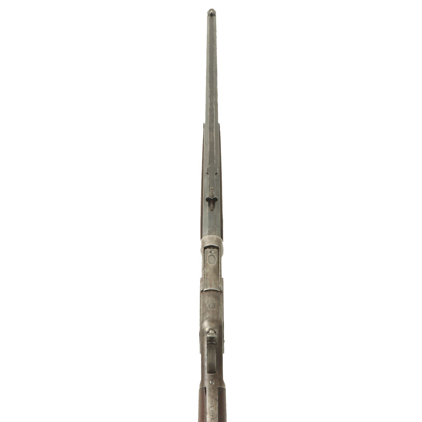 This example has the more desirable 24" octagonal barrel, and a full-length magazine tube. Features the classic front sight and iconic "buckhorn" rear adjustable sight. The serial number is somewhat worn, but can be read: 29591 denoting the year of manufacture as 1879. Another key aspect of the FIRST MODEL was the use of the "thumbprint" style dust cover, included on this example, which was transformed in the subsequent models. This type fits into a dovetail over the ejection port, unlike the later variety, which slides on a dovetail on the rear receiver. It looks like the "print" on this cover has mostly worn away.