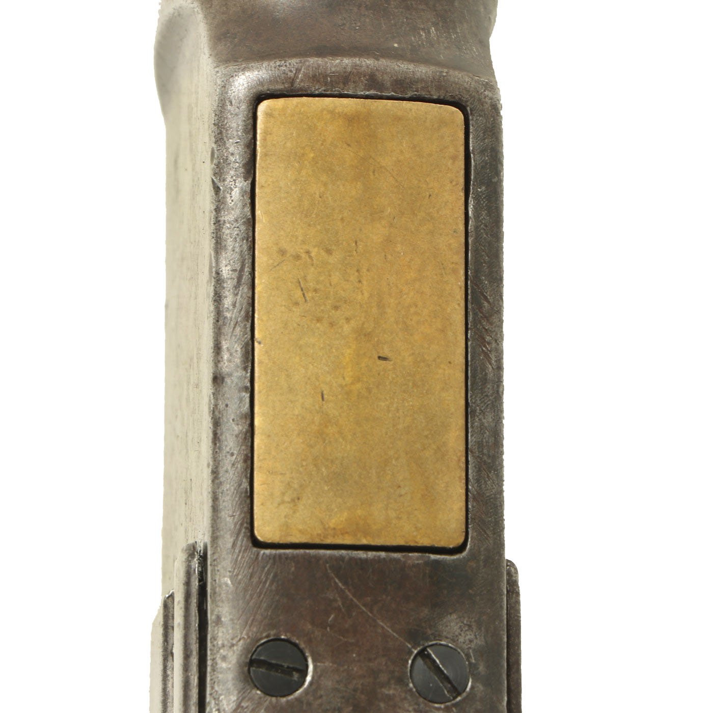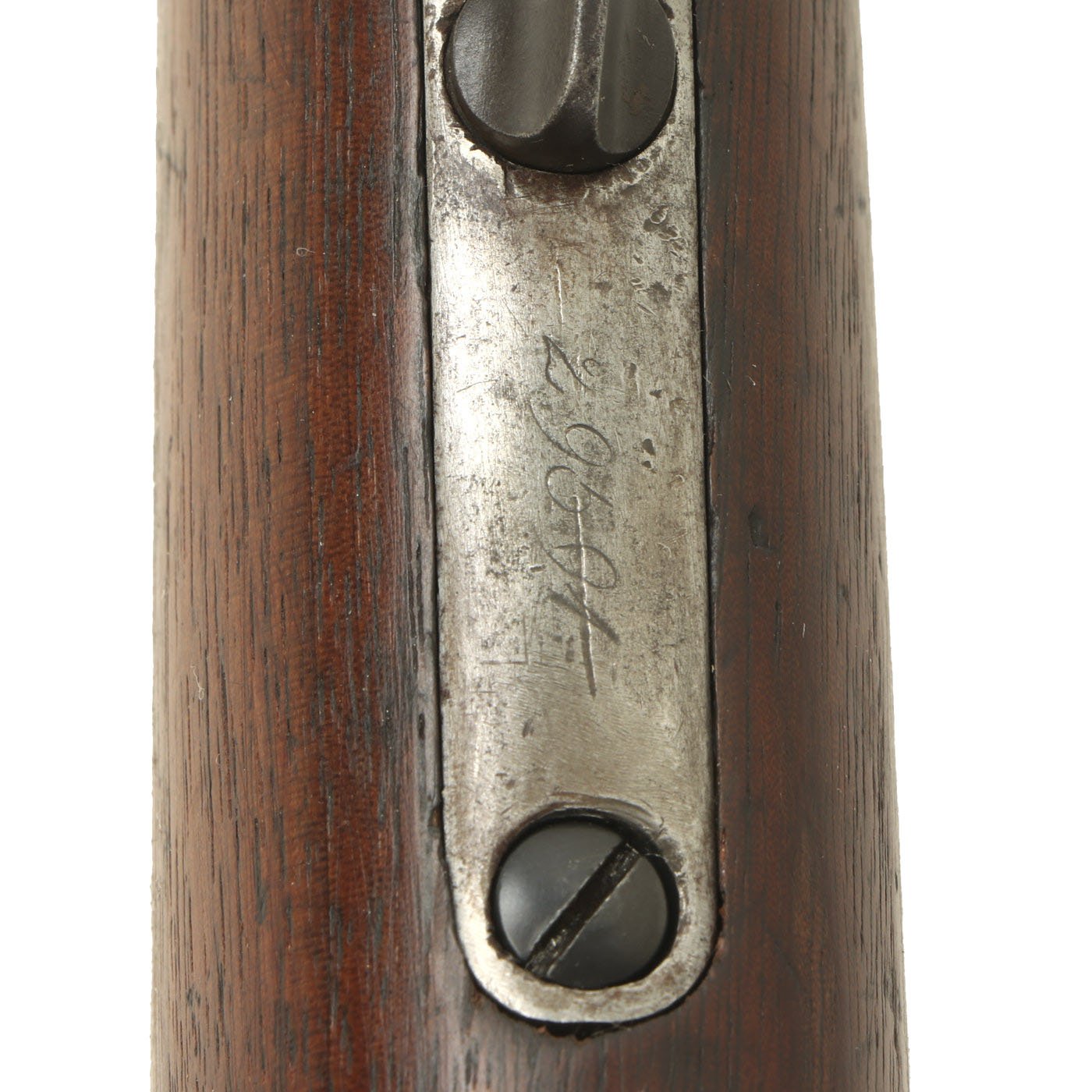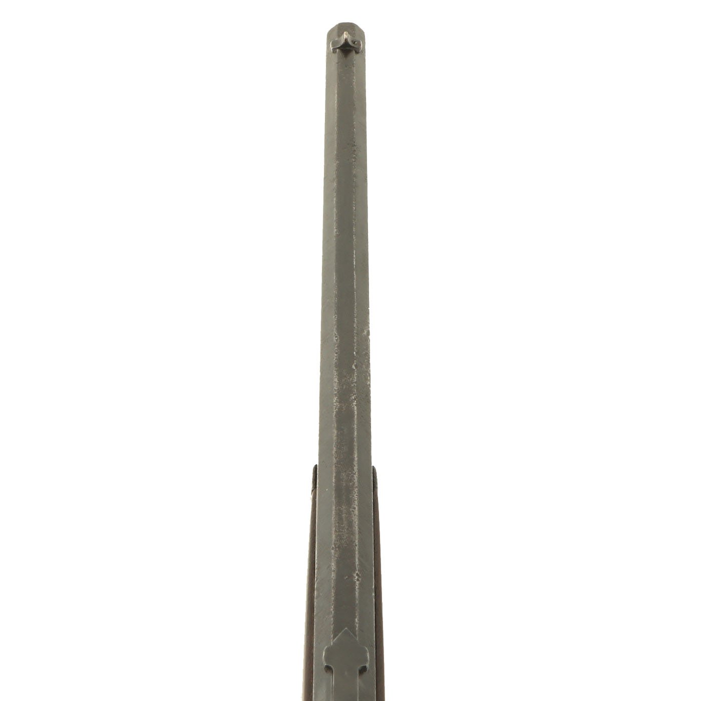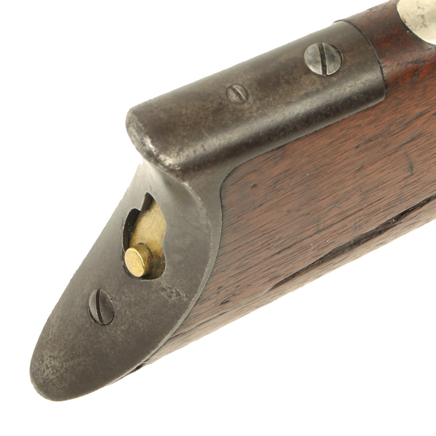 This example has the more desirable 24" octagonal barrel, and a full-length magazine tube. Features the classic front sight and iconic "buckhorn" rear adjustable sight. The serial number is somewhat worn, but can be read: 29591 denoting the year of manufacture as 1879. Another key aspect of the FIRST MODEL was the use of the "thumbprint" style dust cover, included on this example, which was transformed in the subsequent models. This type fits into a dovetail over the ejection port, unlike the later variety, which slides on a dovetail on the rear receiver. It looks like the "print" on this cover has mostly worn away.