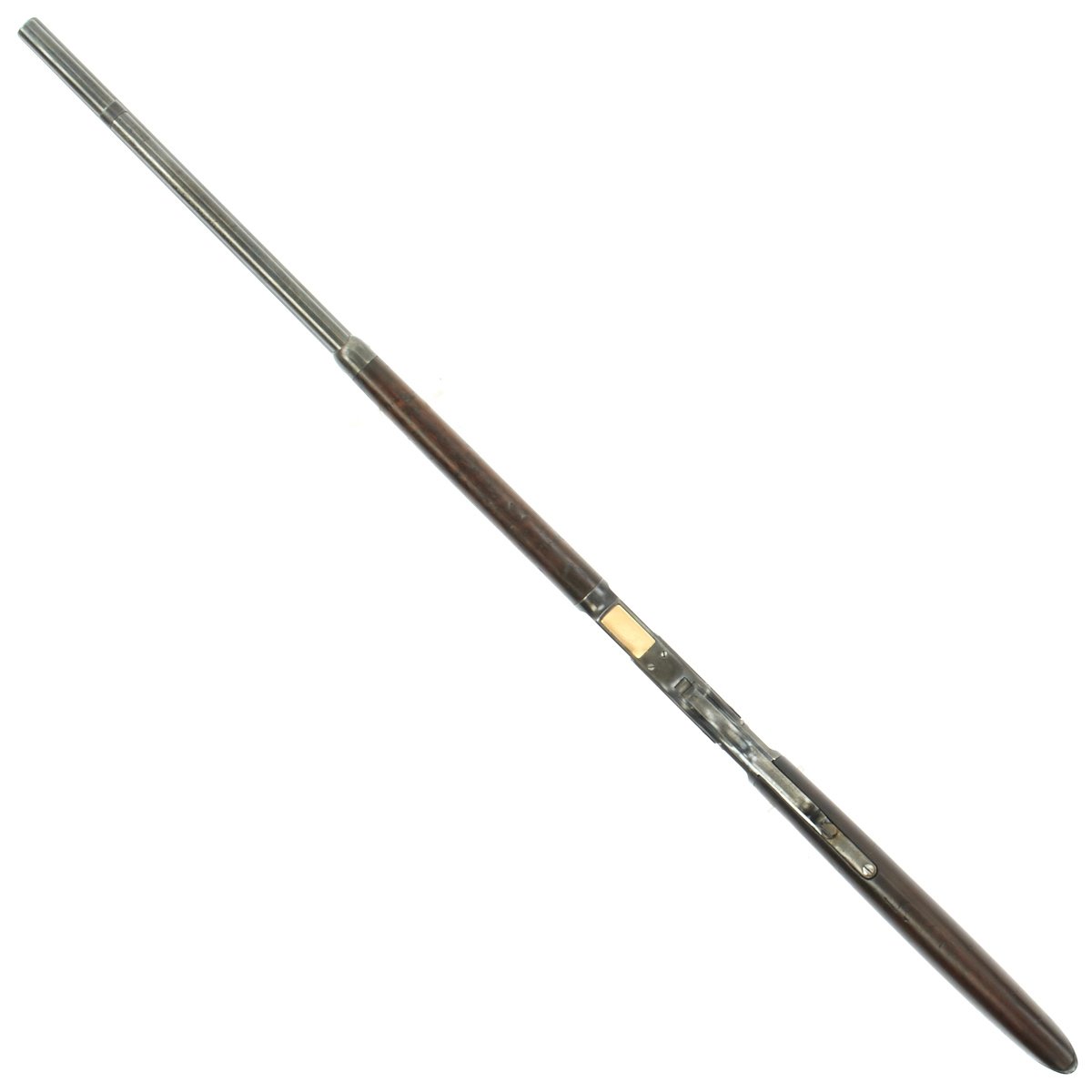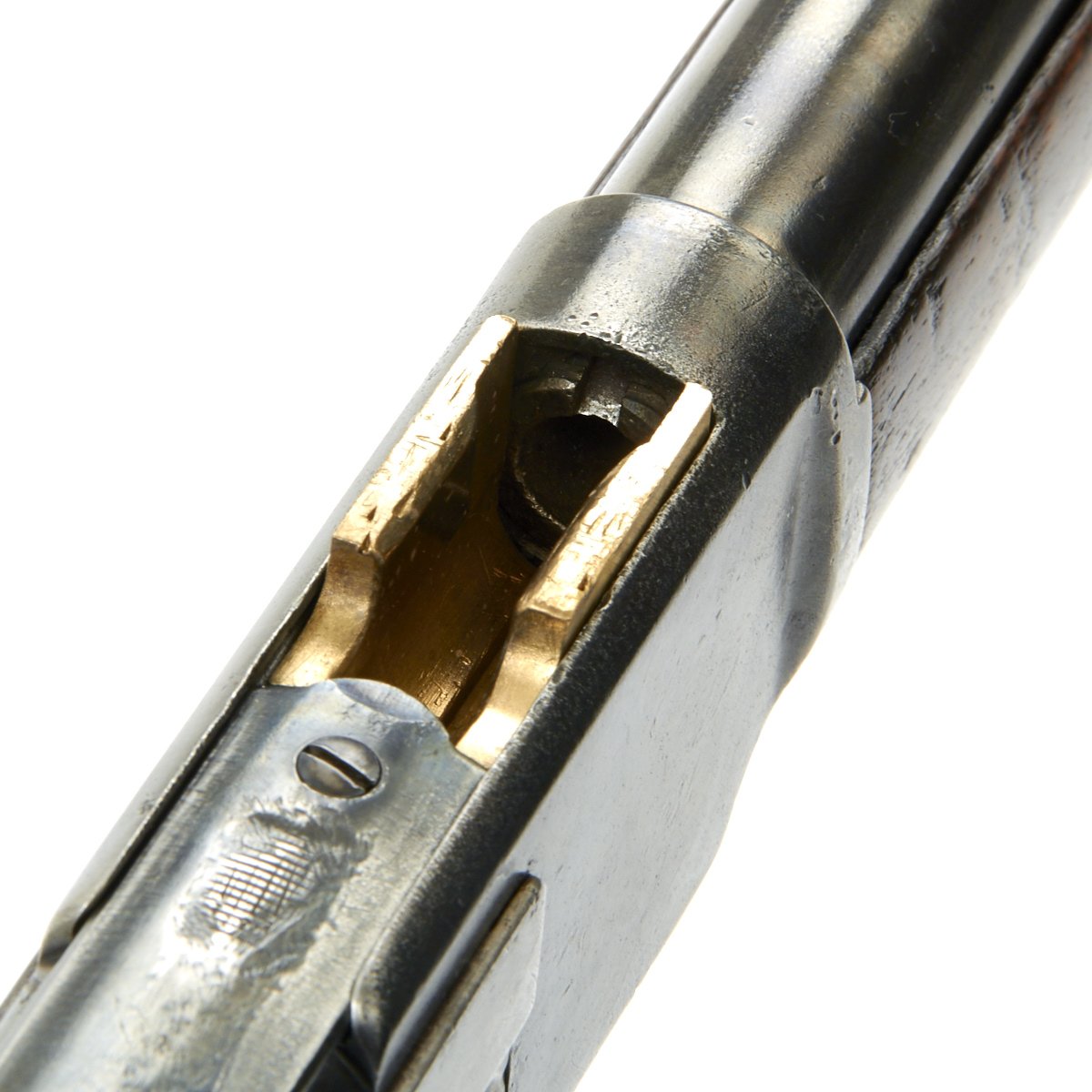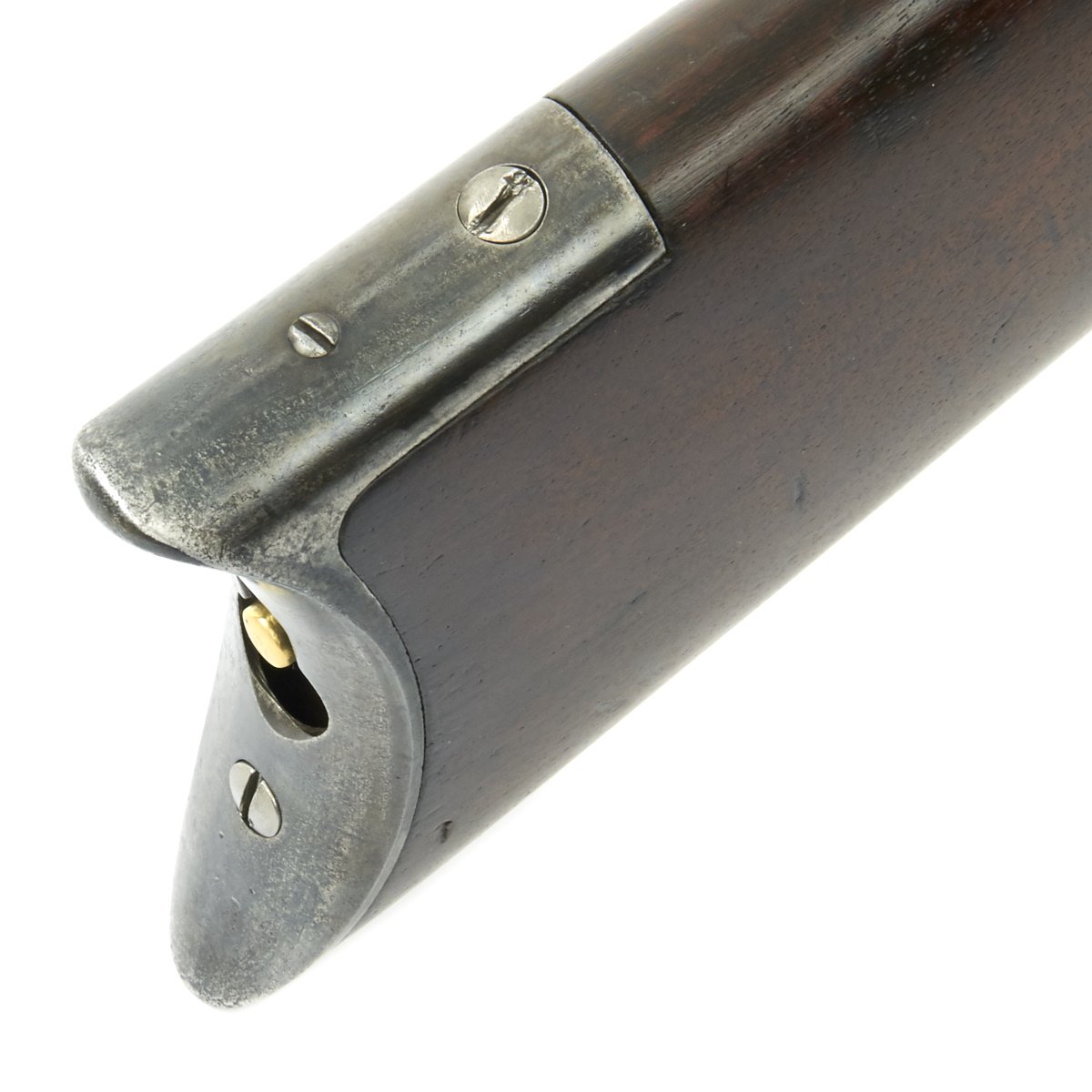 The barrel and action have a nice gray patina, with some signs of past pitting. Features a crescent butt plate with working storage compartment. The rifle is in overall very nice condition. Very crisp tight action in fully functional condition with the original dust cover. The bore shows lands and grooves, however there are some areas of pitting, with a partly bright finish. Probably a 5-6 out of 10.