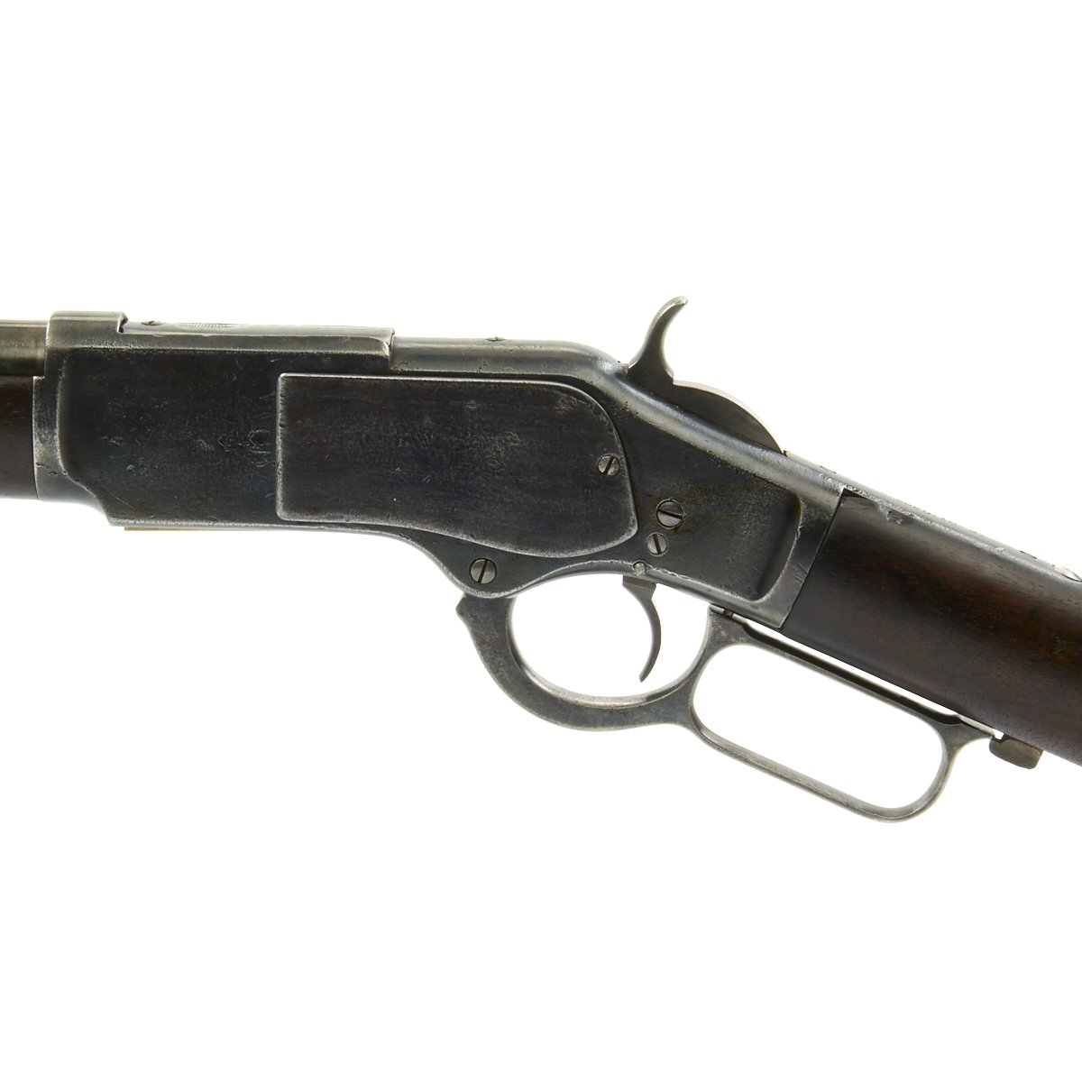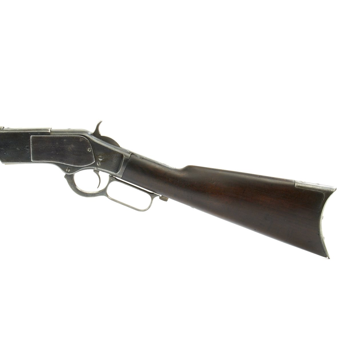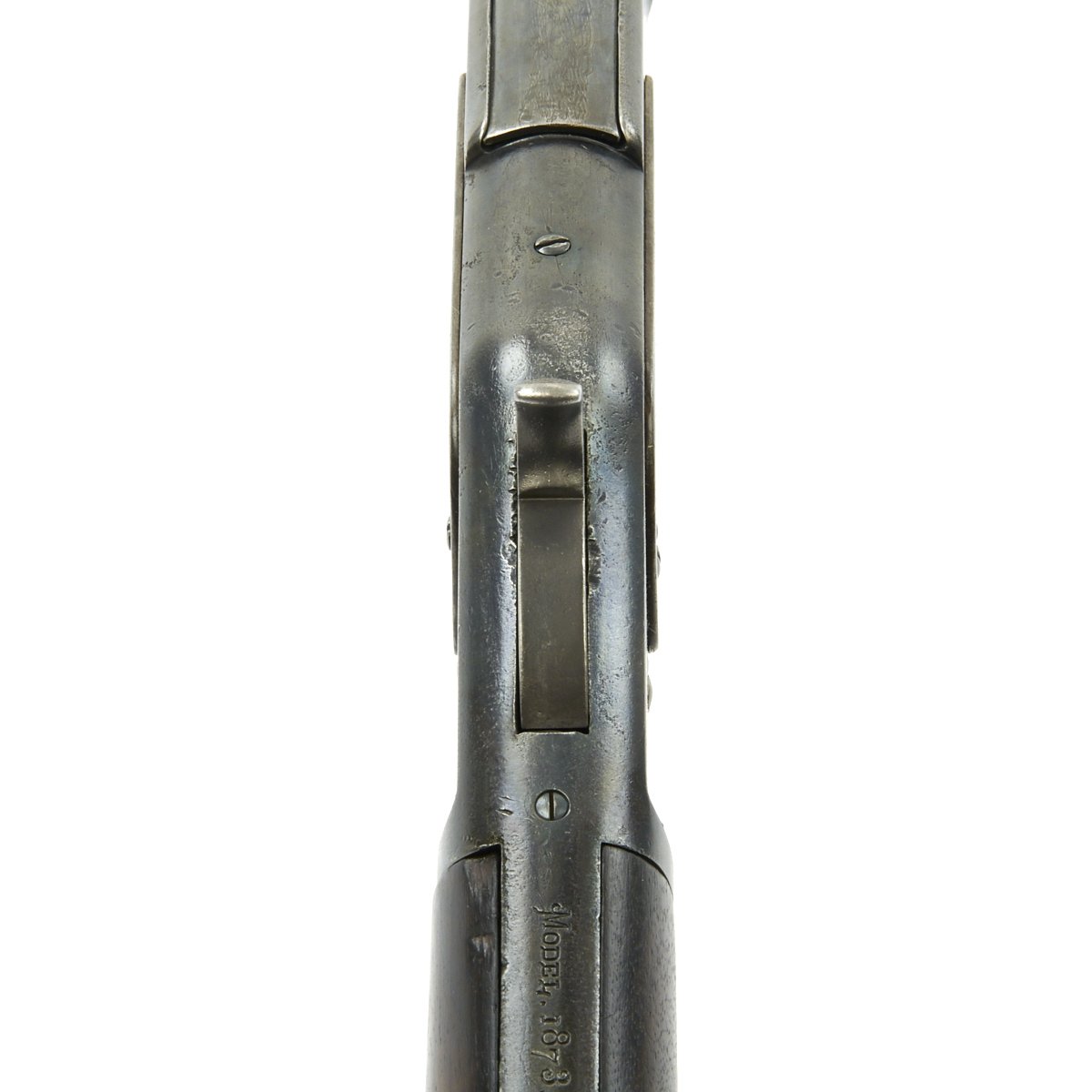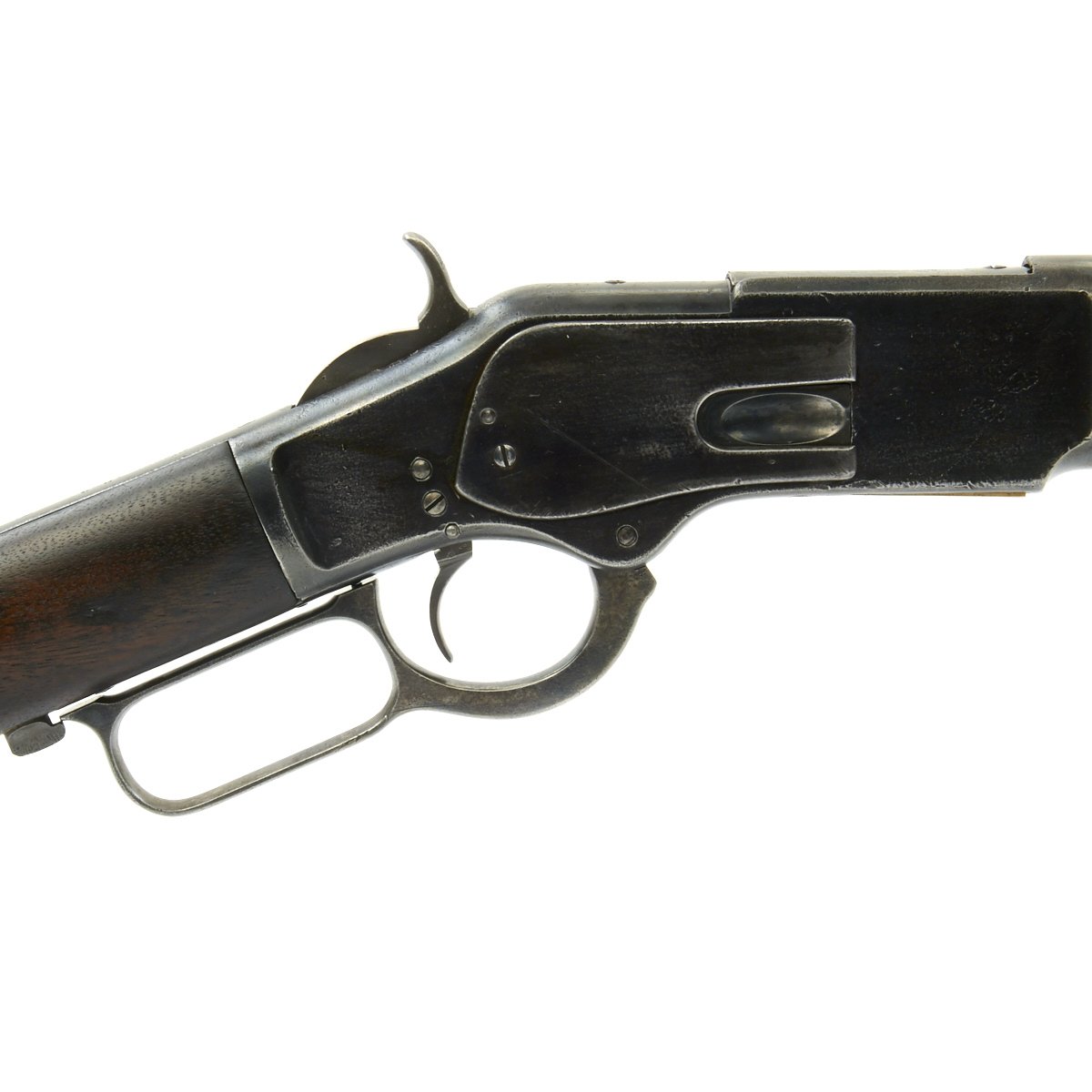 This example has a 24" round barrel and full-length magazine tube. Features the classic front sight and "flat-top" rear adjustable sight. The serial number is faint, but can be read: 275 denoting the year of manufacture as 1874. Another key aspect of the FIRST MODEL was the use of the "thumbprint" dust cover, include on this example, which was transformed in the subsequent models.