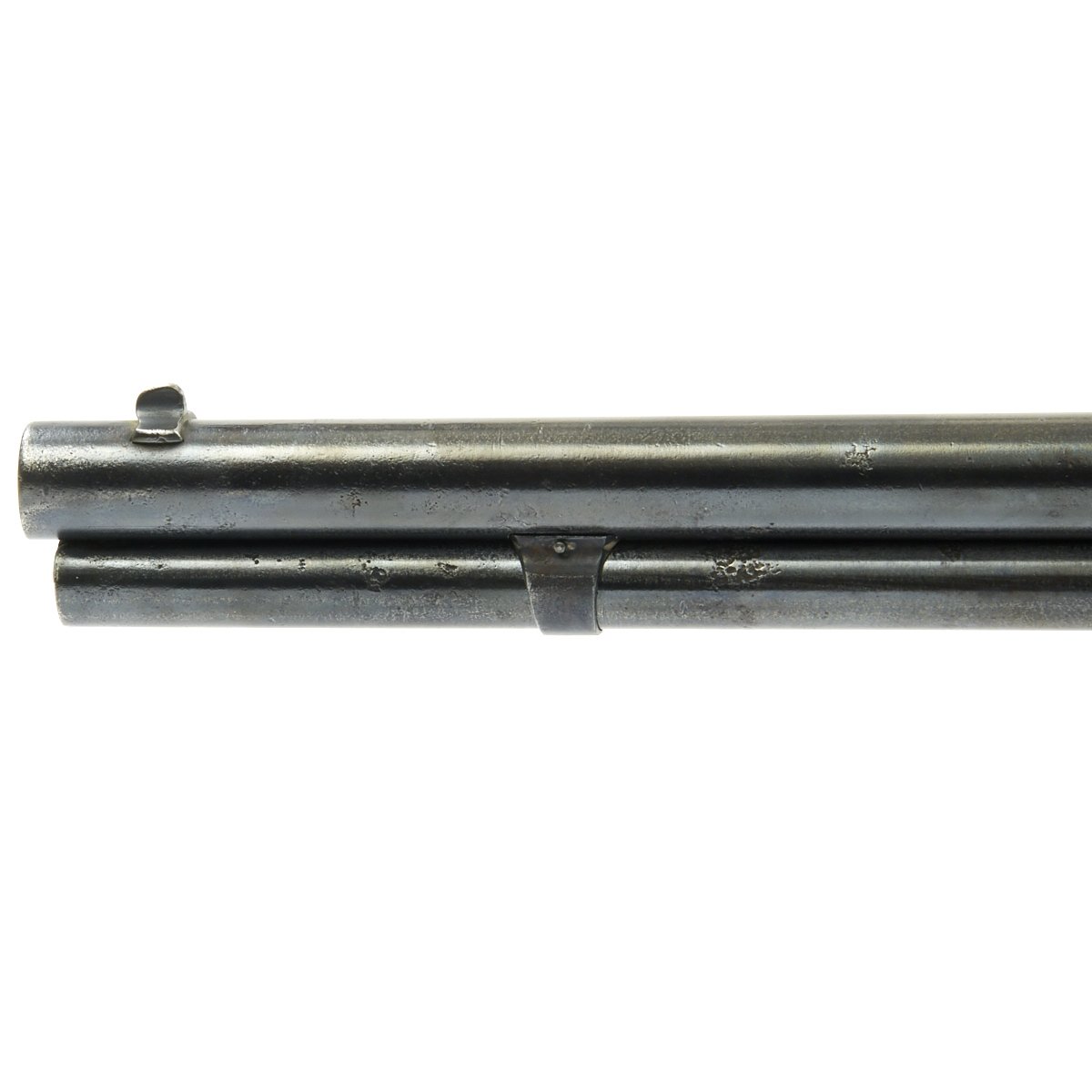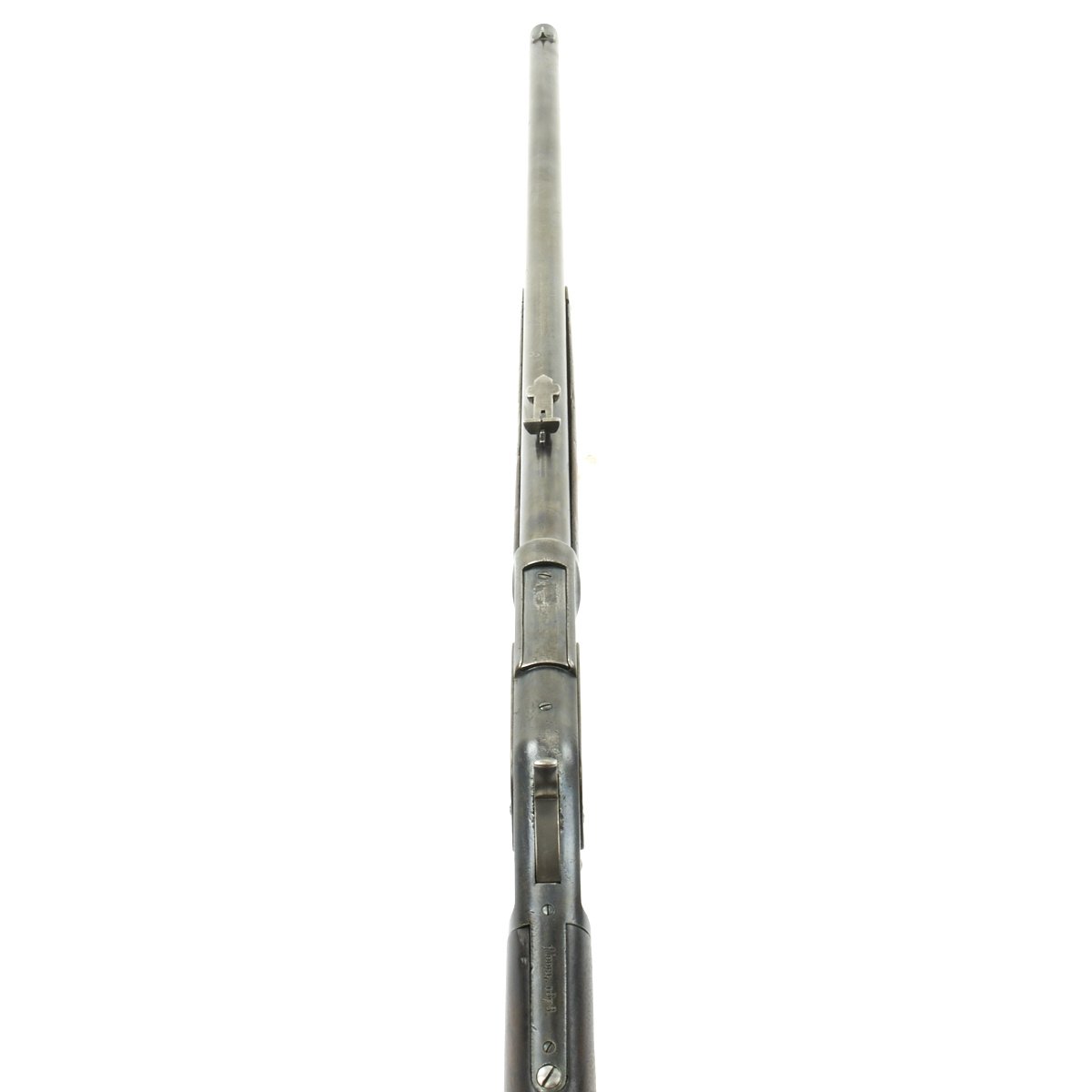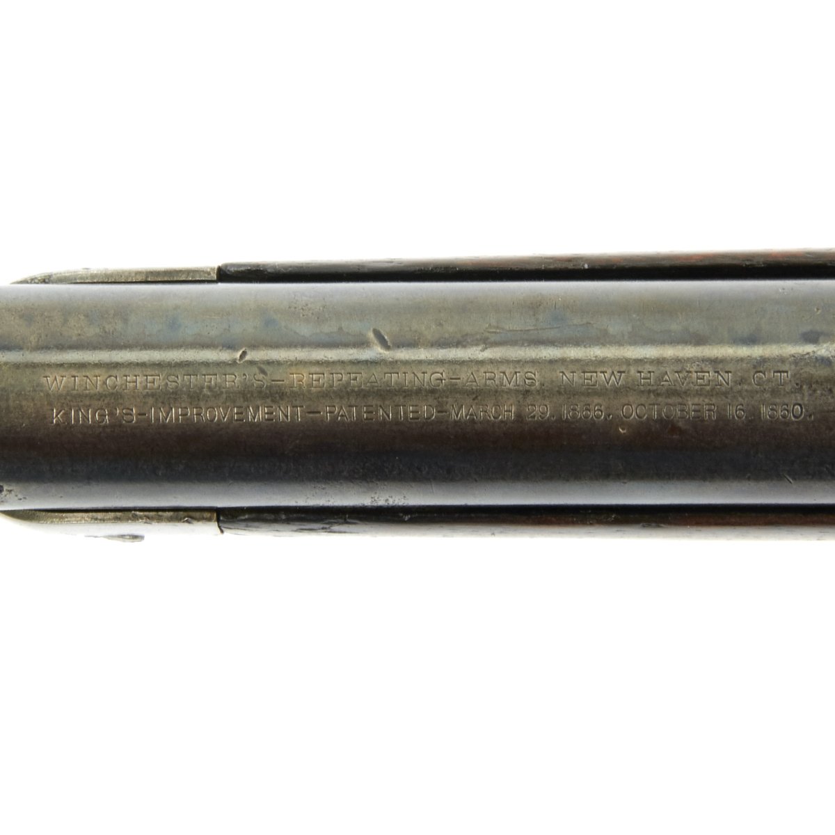 This example has a 24" round barrel and full-length magazine tube. Features the classic front sight and "flat-top" rear adjustable sight. The serial number is faint, but can be read: 275 denoting the year of manufacture as 1874. Another key aspect of the FIRST MODEL was the use of the "thumbprint" dust cover, include on this example, which was transformed in the subsequent models.