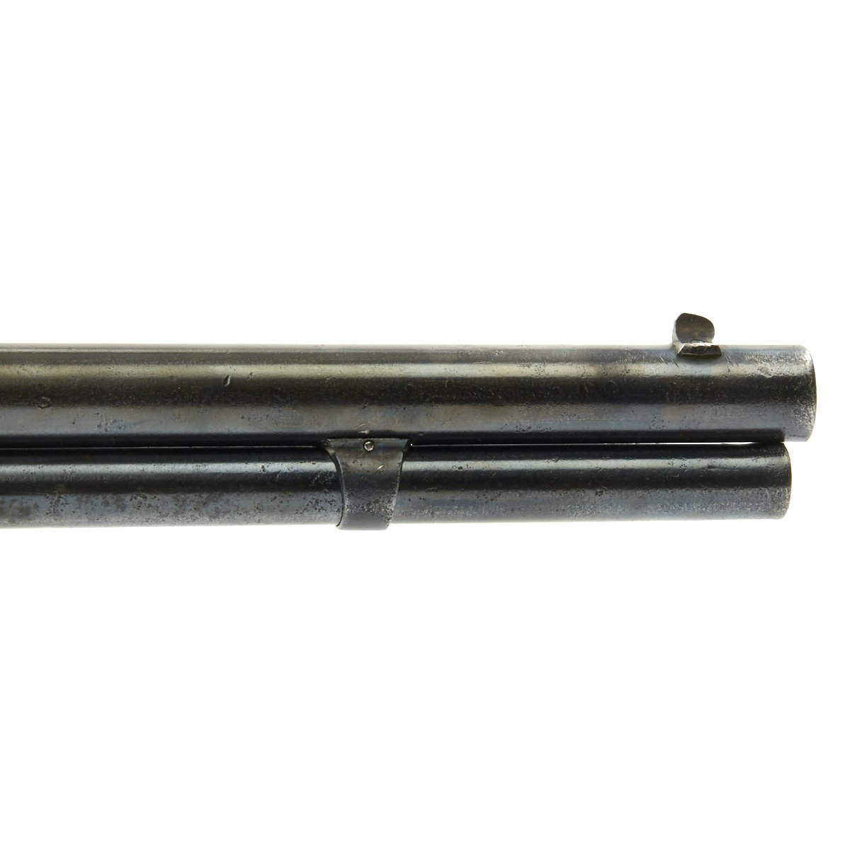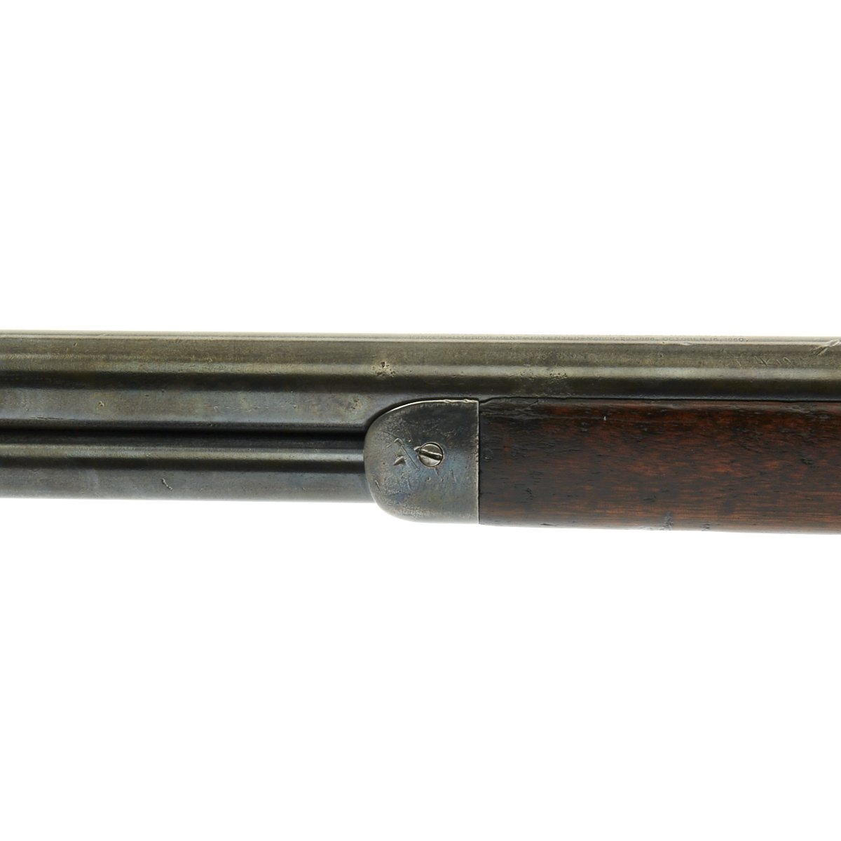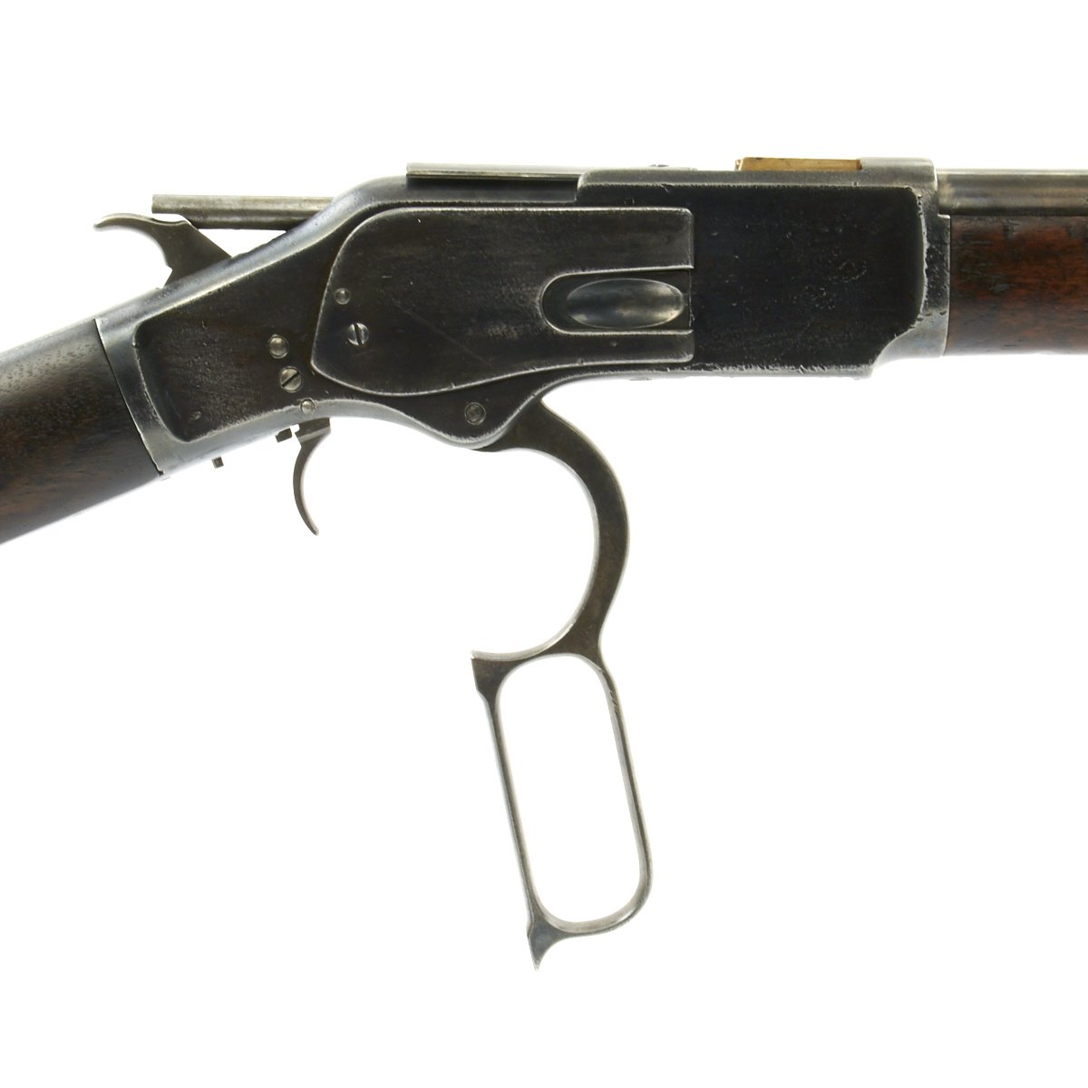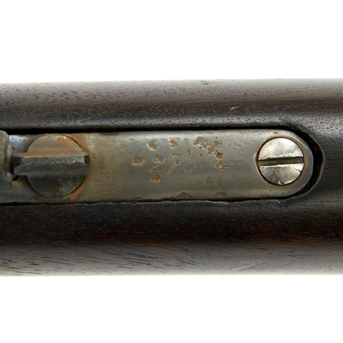 This example has a 24" round barrel and full-length magazine tube. Features the classic front sight and "flat-top" rear adjustable sight. The serial number is faint, but can be read: 275 denoting the year of manufacture as 1874. Another key aspect of the FIRST MODEL was the use of the "thumbprint" dust cover, include on this example, which was transformed in the subsequent models.