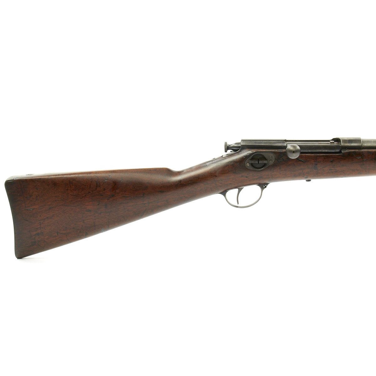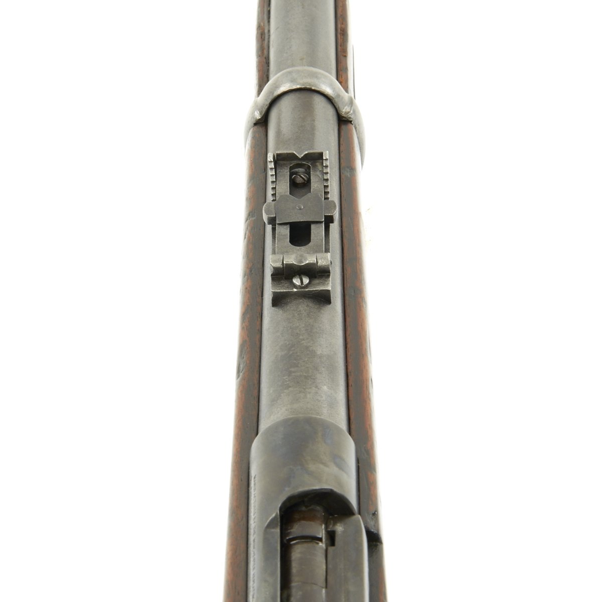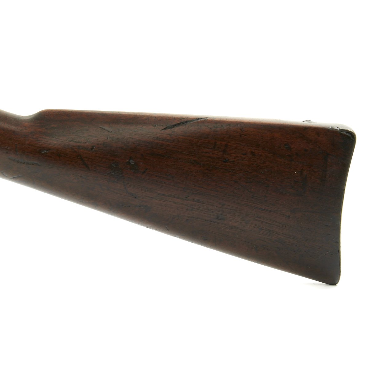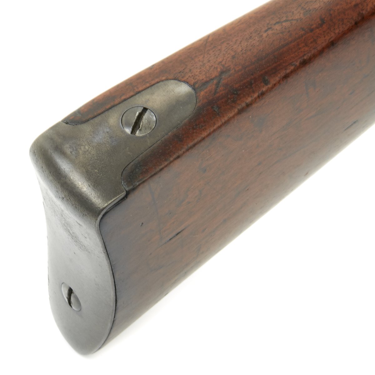 Initially the U.S. Government ordered just 1,474 Rifles and only 500 Carbines for Cavalry use. The system was never a great success and as a result examples are now hard to find. This carbine has a 24 inch barrel, which is the second variation seen, as earlier models had a 22 1/2 barrel. This carbine is marked with serial number 12233 on the top side of the receiver, which according to records indicates manufacturer in 1881. Listed below this is the voluminous manufacturer and patent information: