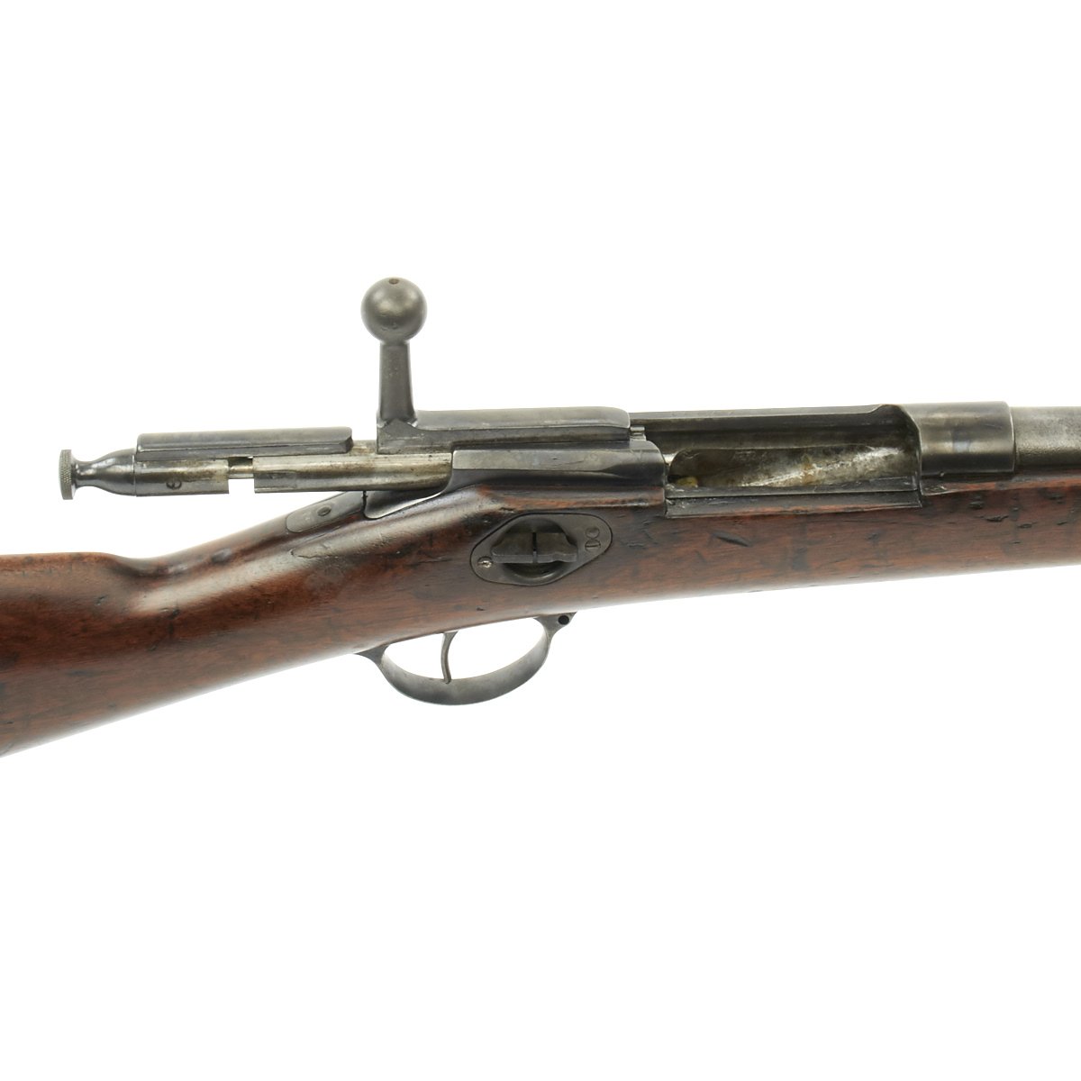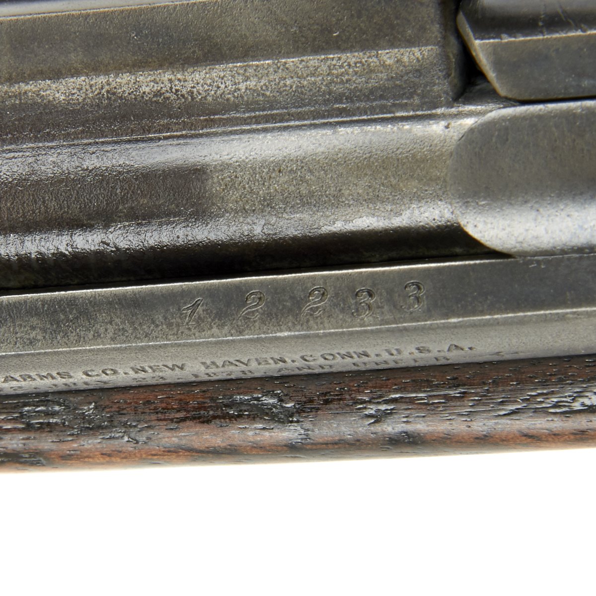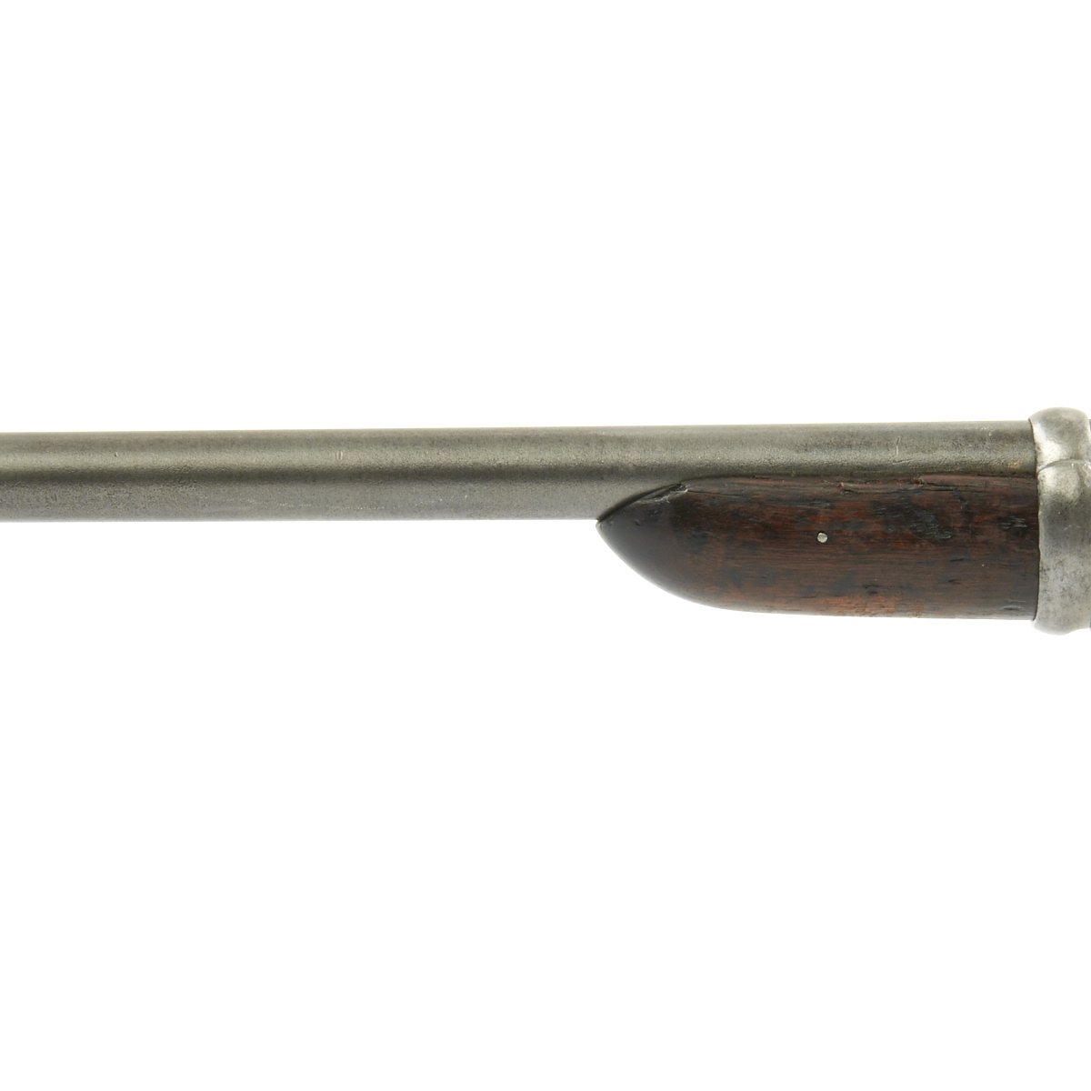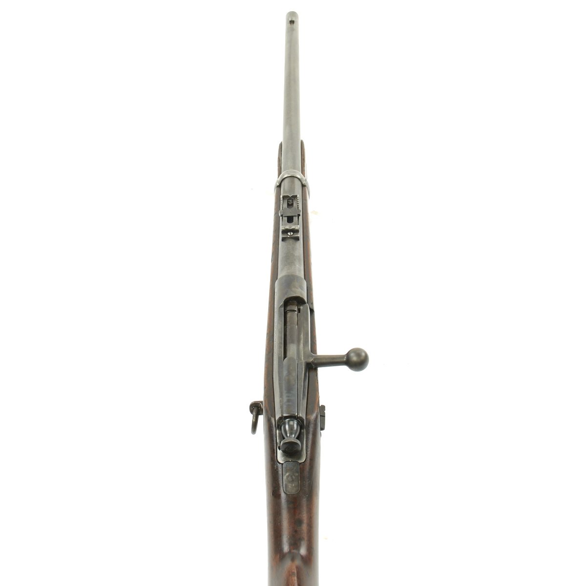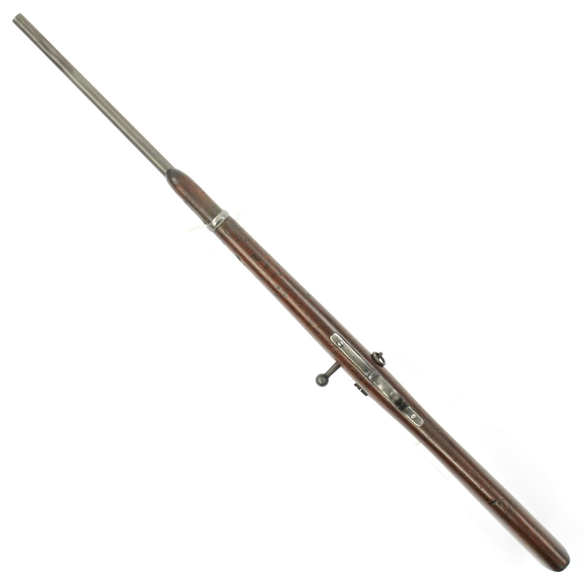 Initially the U.S. Government ordered just 1,474 Rifles and only 500 Carbines for Cavalry use. The system was never a great success and as a result examples are now hard to find. This carbine has a 24 inch barrel, which is the second variation seen, as earlier models had a 22 1/2 barrel. This carbine is marked with serial number 12233 on the top side of the receiver, which according to records indicates manufacturer in 1881. Listed below this is the voluminous manufacturer and patent information: